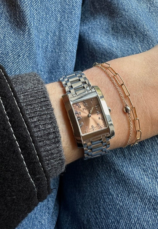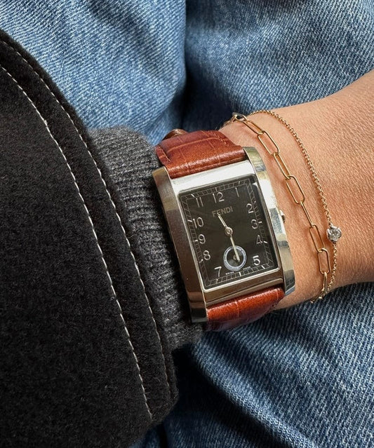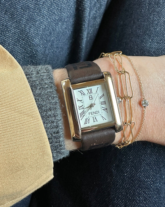 Vintage Fendi Silver Plated Watch with Brown and Black Leather Strap