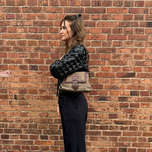 Vintage Fendi Zucca Shoulder Bag with Brown Leather Trim