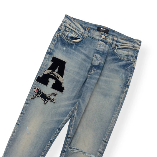 AMIRI VARSITY PATCH DISTRESSED SKINNY DENIM JEANS BLUE / BLACK W34”