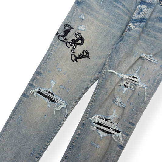 AMIRI SERIF LOGO EMBROIDERED BANDANA SKINNY DENIM JEANS BLUE W34”