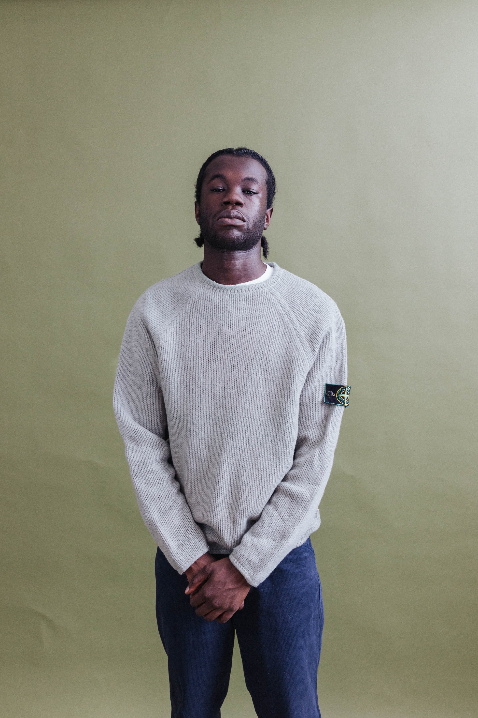 The design is finished with a classic crew neck, ribbed cuffs and hem, and the early-era detachable compass badge at the sleeve—an unmistakable hallmark of Stone Island’s identity. Its softly faded green tone reflects the garment’s age and authenticity, adding to its character as a true vintage collectible.