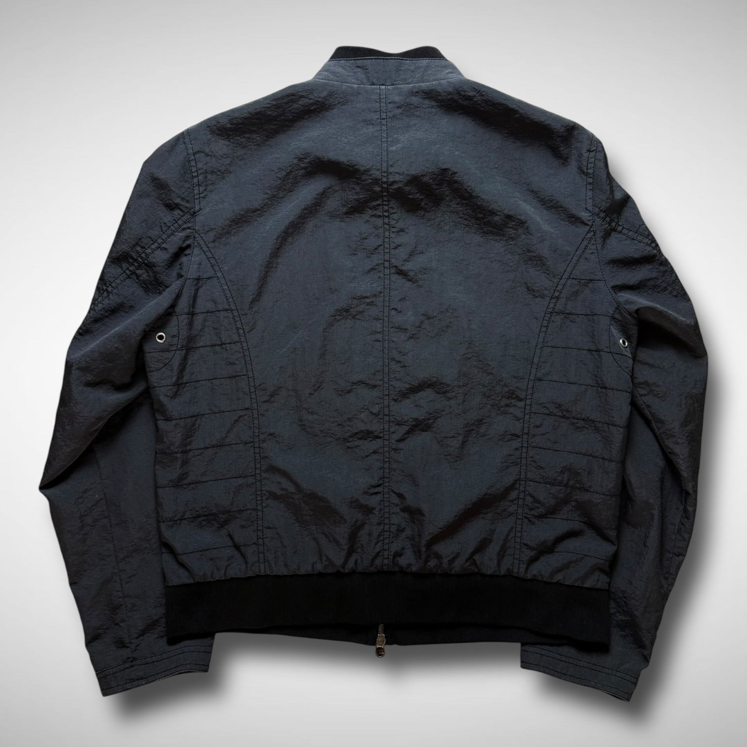 A minimalist bomber-style piece in sleek and stealth style from the 90s. Featuring a lightweight, slightly crinkled nylon shell with a two-way branded-zip closure, ribbed hem and cuffs, and a snap-button collar detail. Subtle utility-inspired touches include snap side pockets and reinforced stitching panels. The interior carries the classic Armani Collezioni label.
