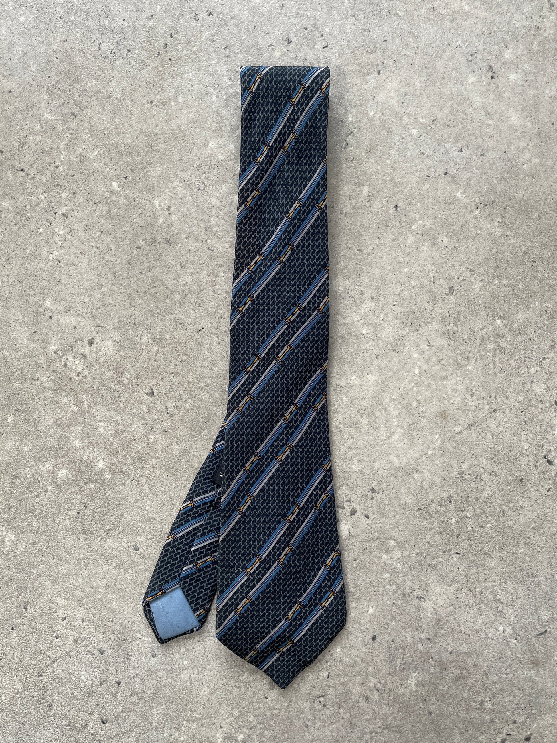 A vintage Celine Paris tie featuring a navy ground with an all-over graphic stripe print, finished in smooth silk with classic pointed blade construction.