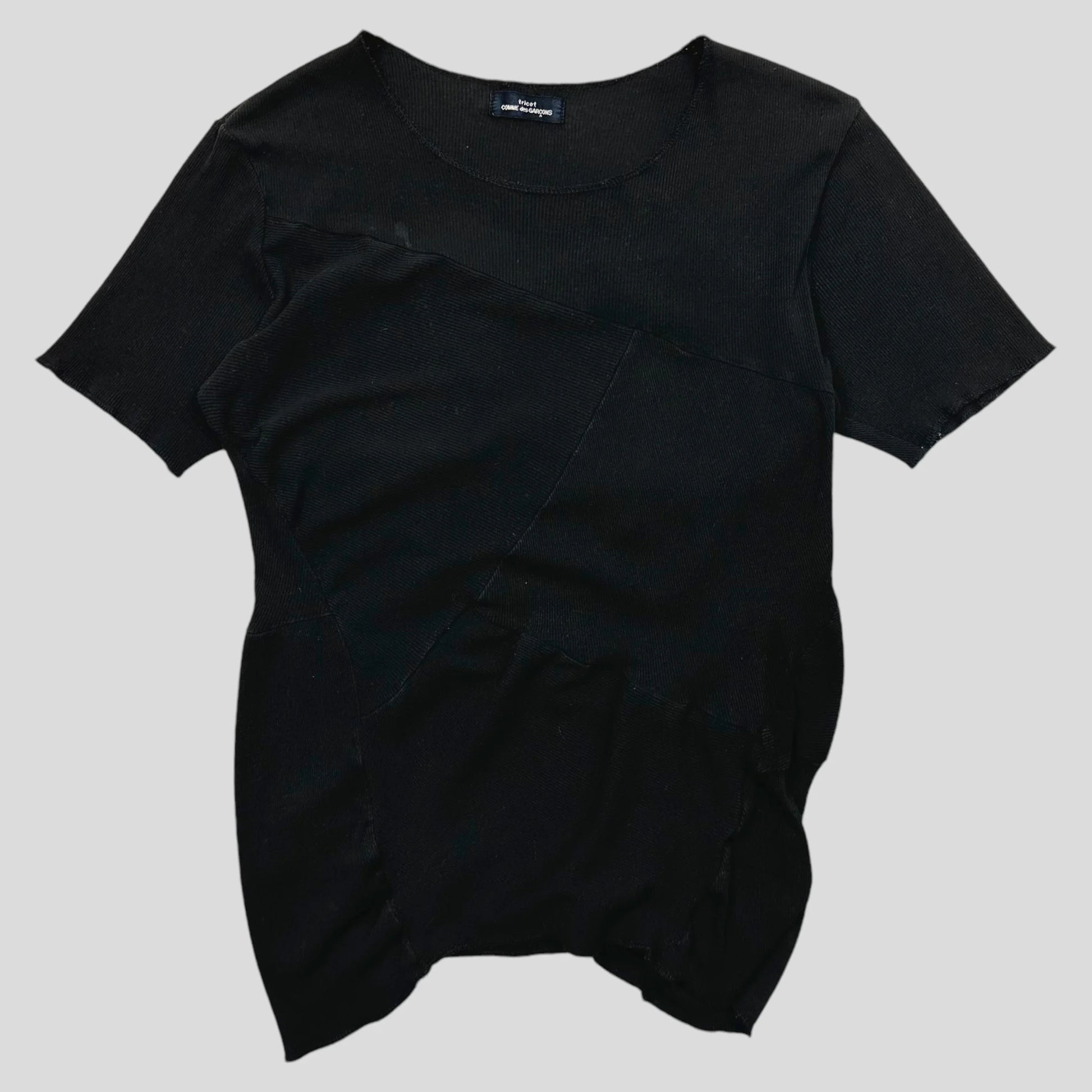 CDG Tricot 1991 Black Pleated textured patchwork cotton top, unique piece in a lovely cut and shape, made in Japan.