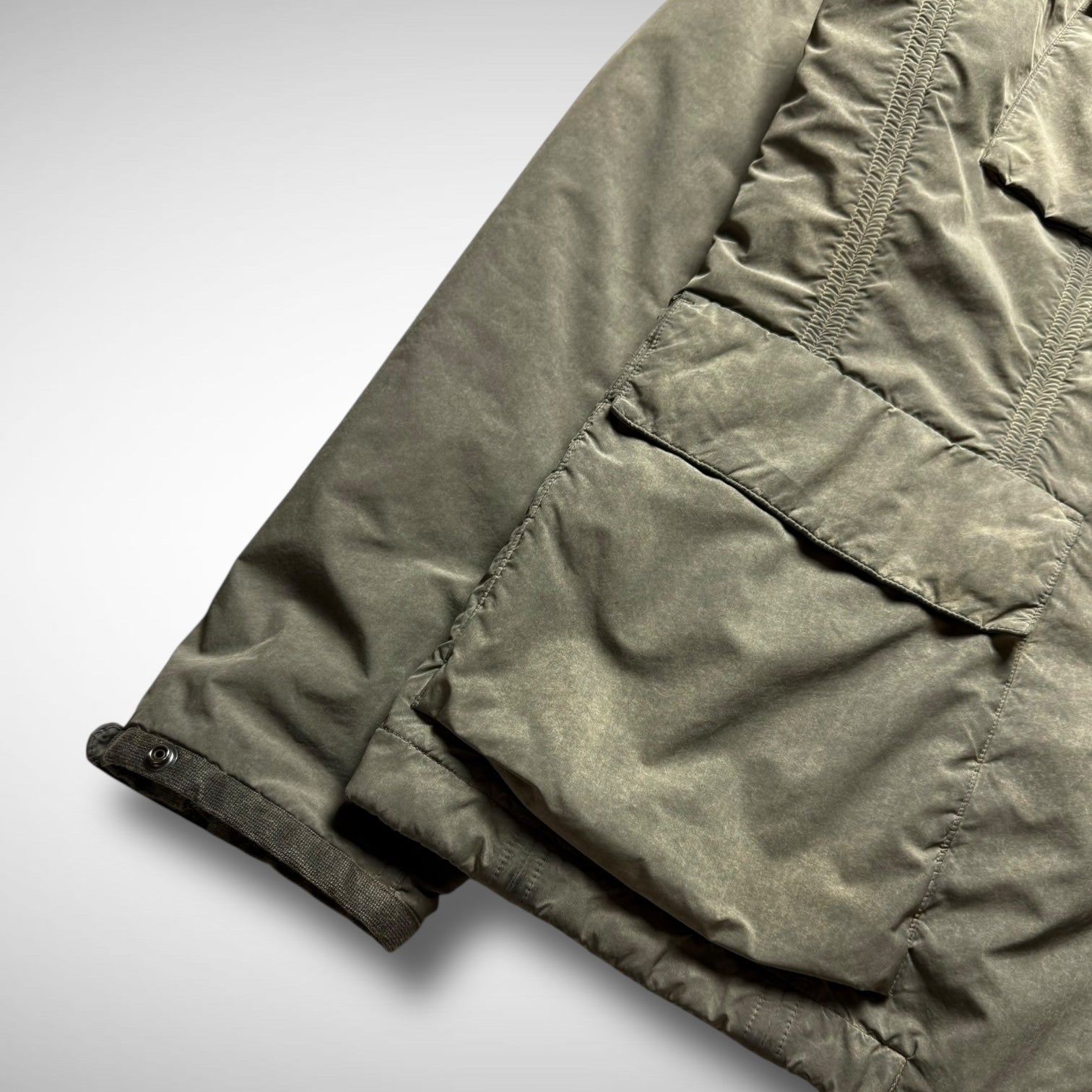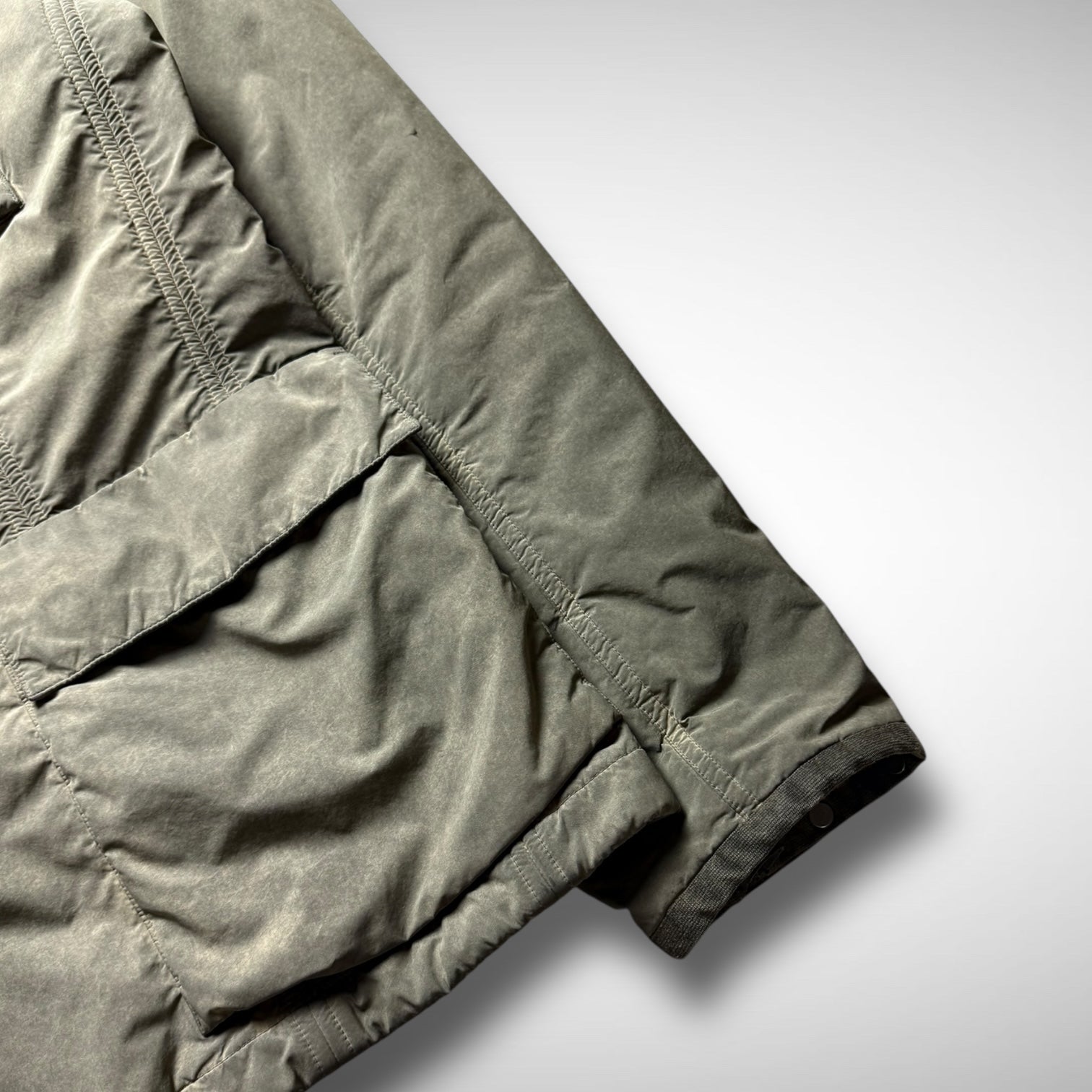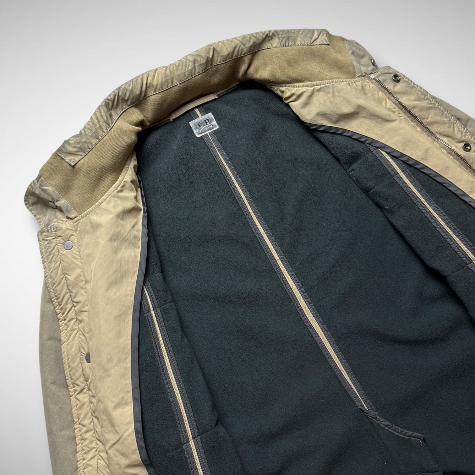 C.P. Company M65 Parka from the AW2009 Tinto Terra series. Constructed in garment-dyed fabric with a distinctive earth-washed finish, it features a nylon zip-stow-away hood in the collar, four front flap pockets, and reinforced stitch detailing. The fleece lining adds warmth, while military-inspired elements highlight C.P. Company’s functional design approach.