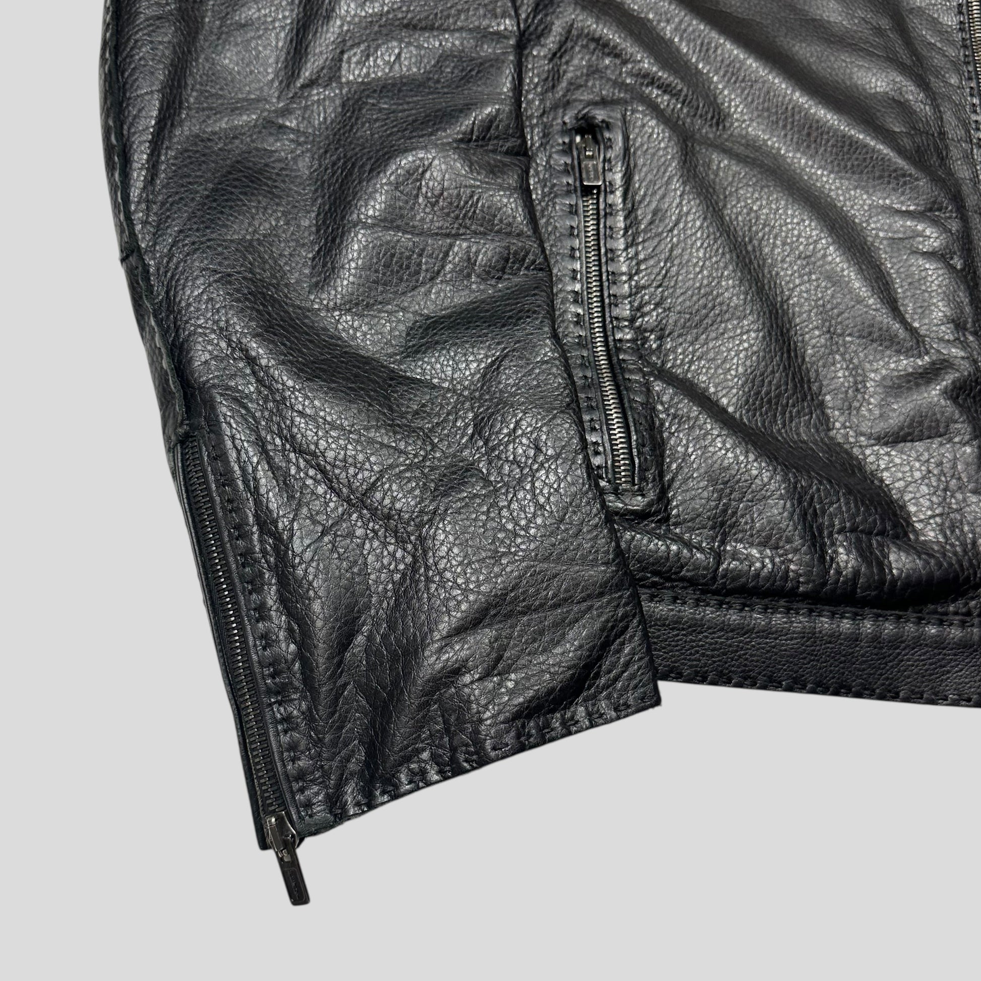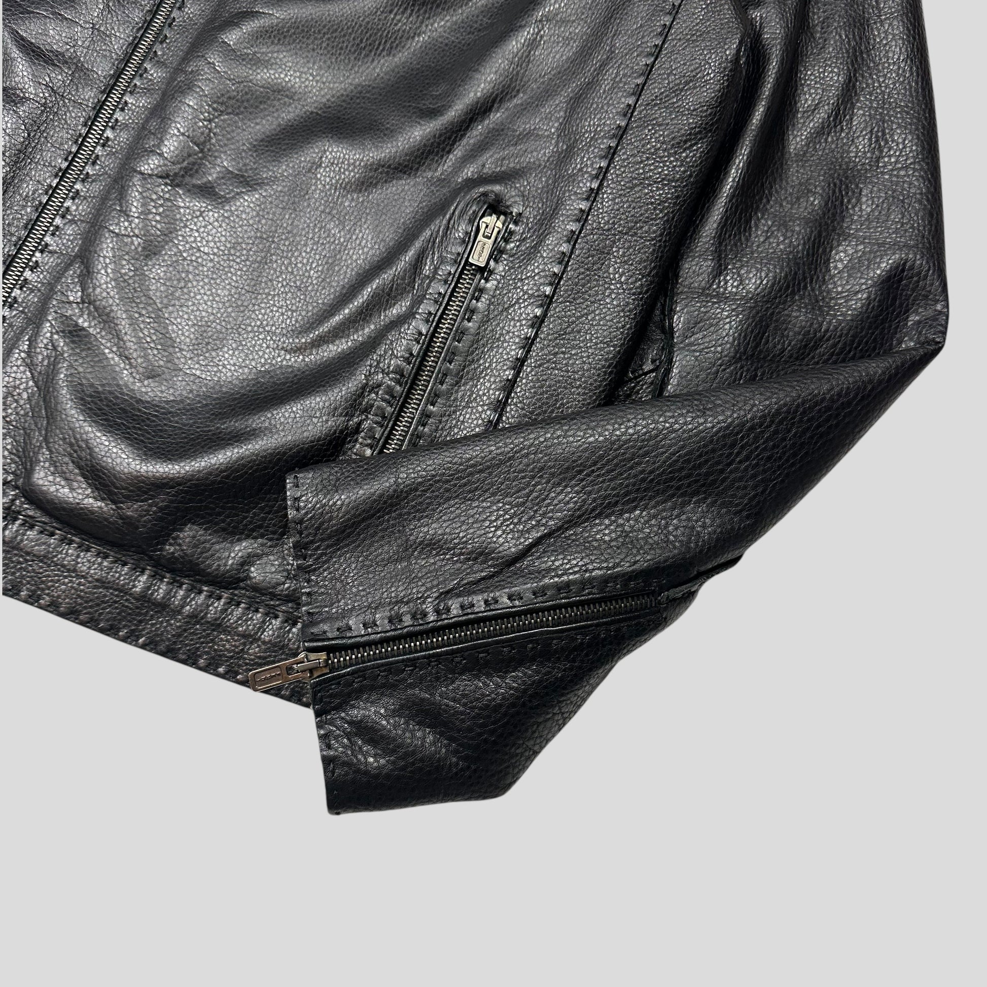 Stunning Fendi mainline mens black leather biker jacket, incredibly soft high quality supple lambs leather, very textured grain with a nice sheen looks amazing, moto zip details to wrist, exaggerated large stitching all around the jacket, Fendi logo zippers, hook and latch style collar closure.