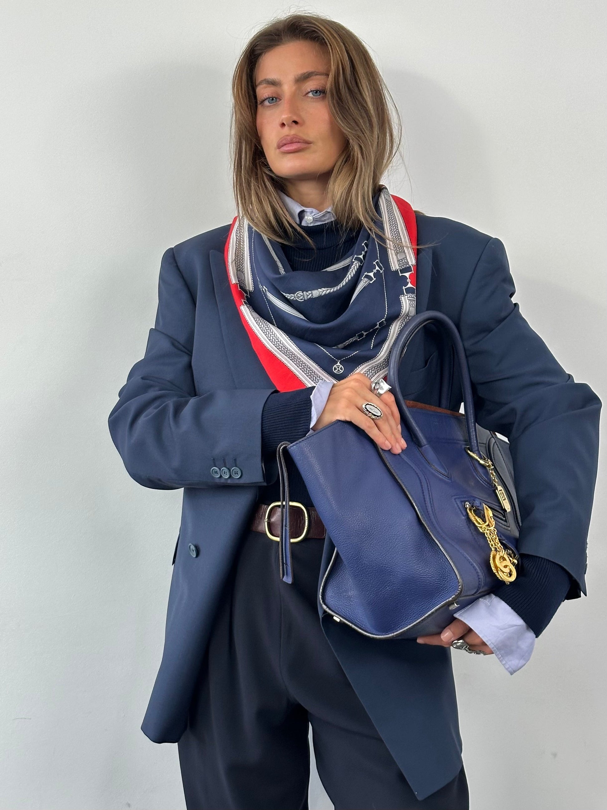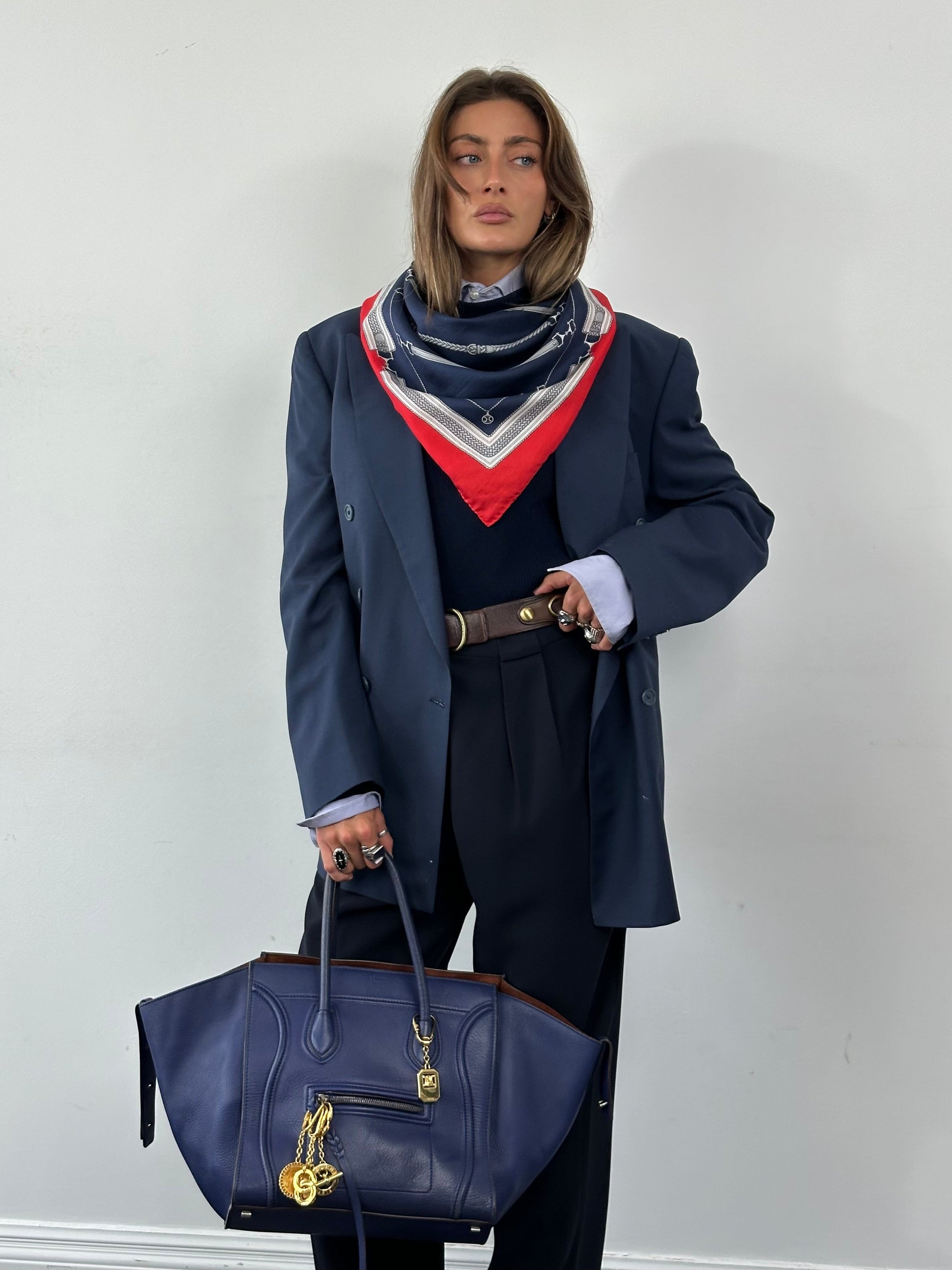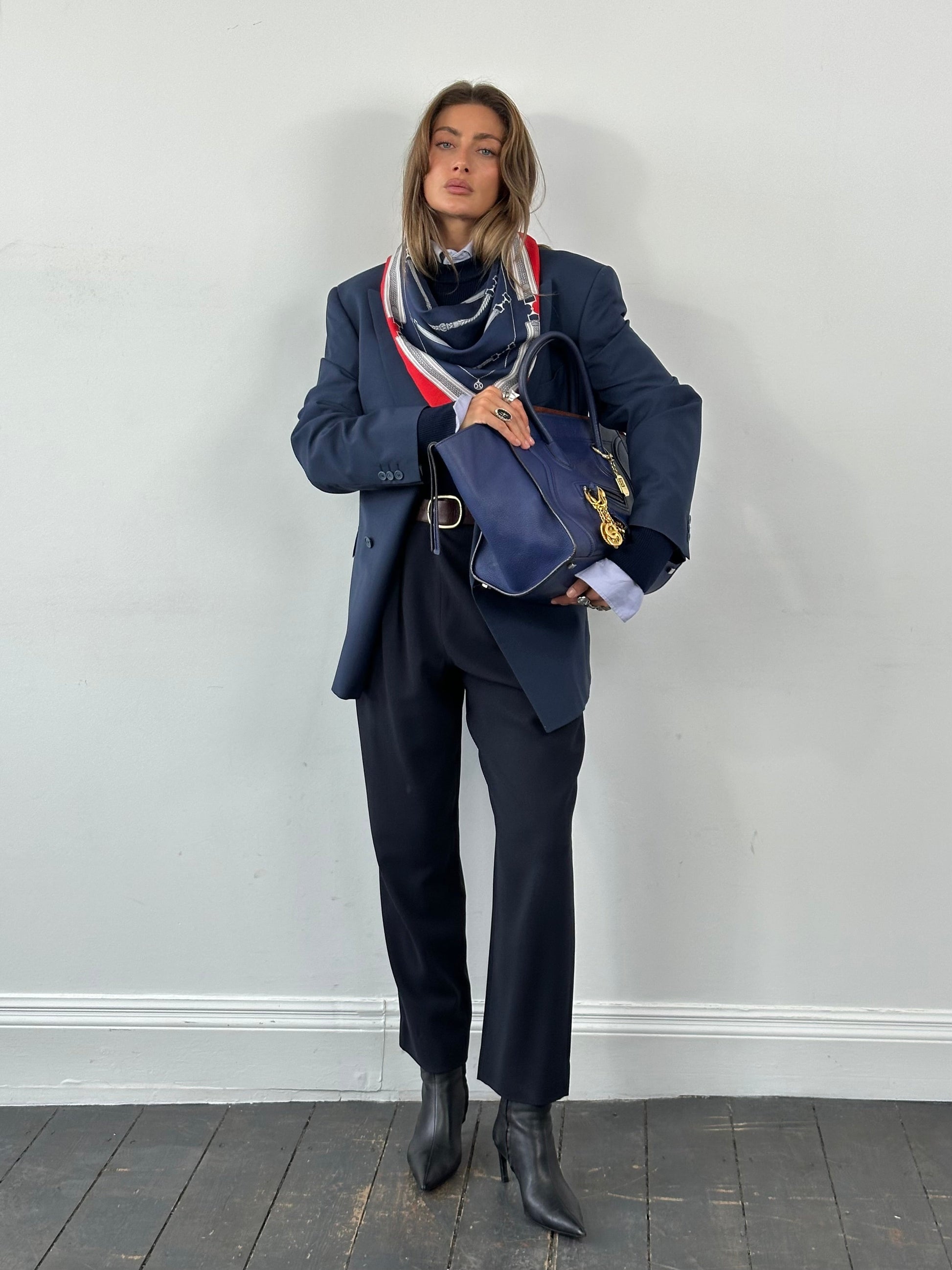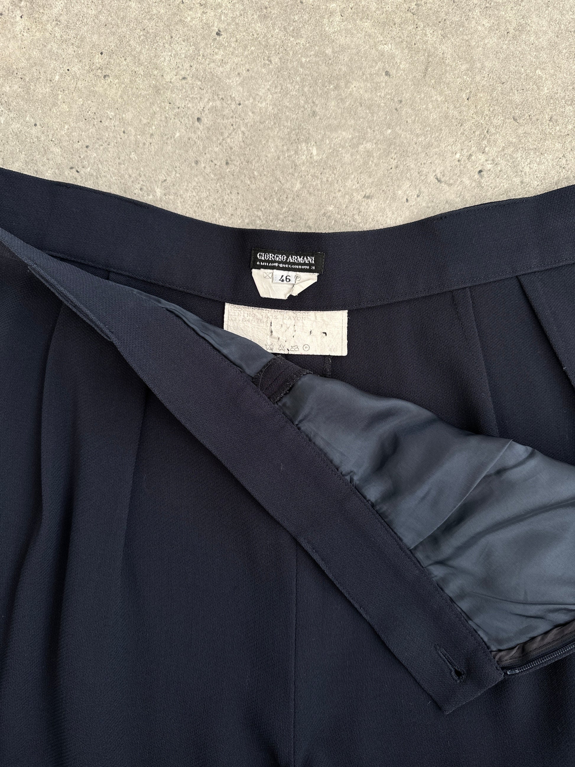 Refined navy wool trousers by Giorgio Armani’s classic black label. Cut high at the waist with elegant tapering — a timeless piece of Armani’s late 80s–90s tailoring.