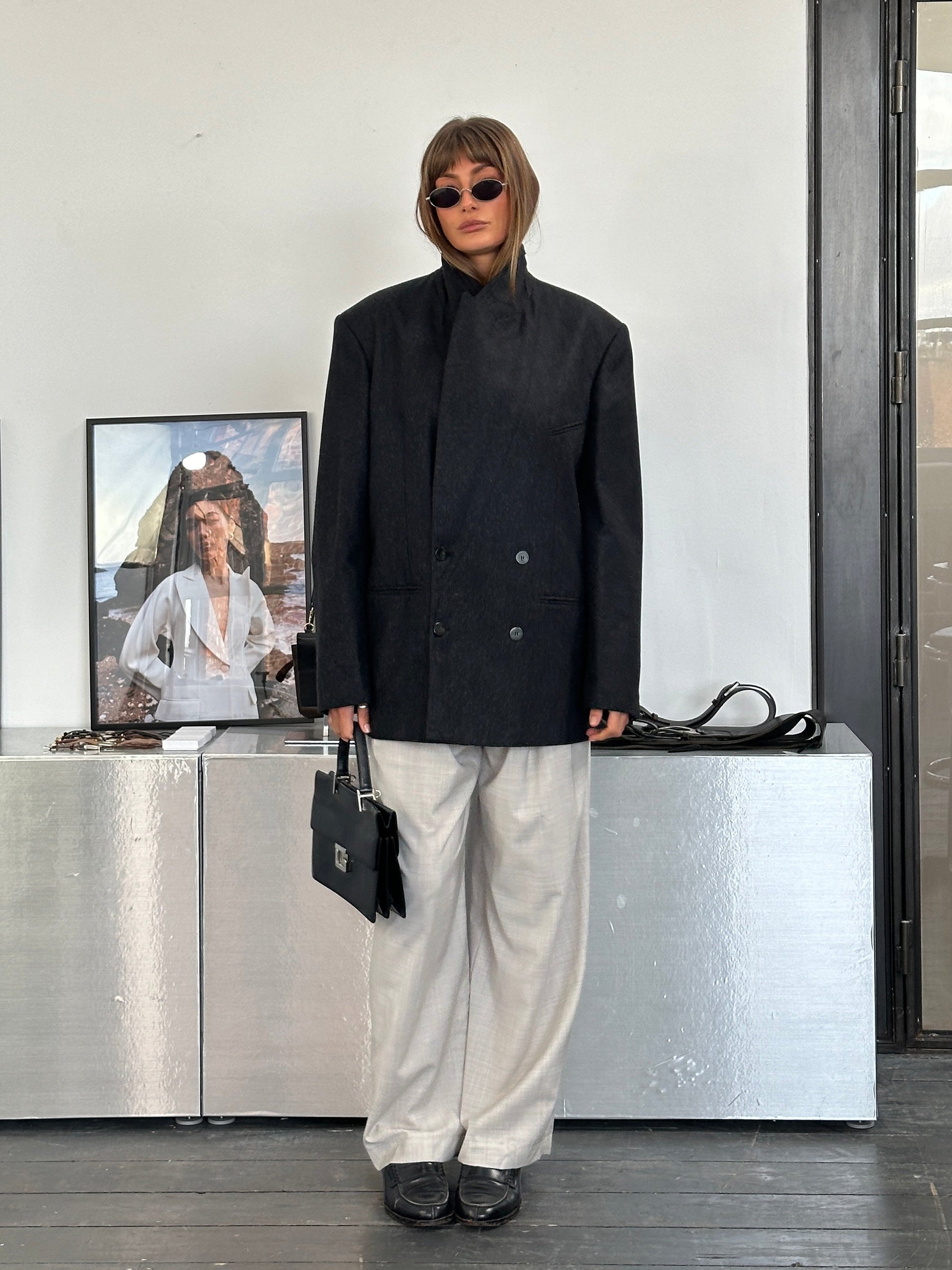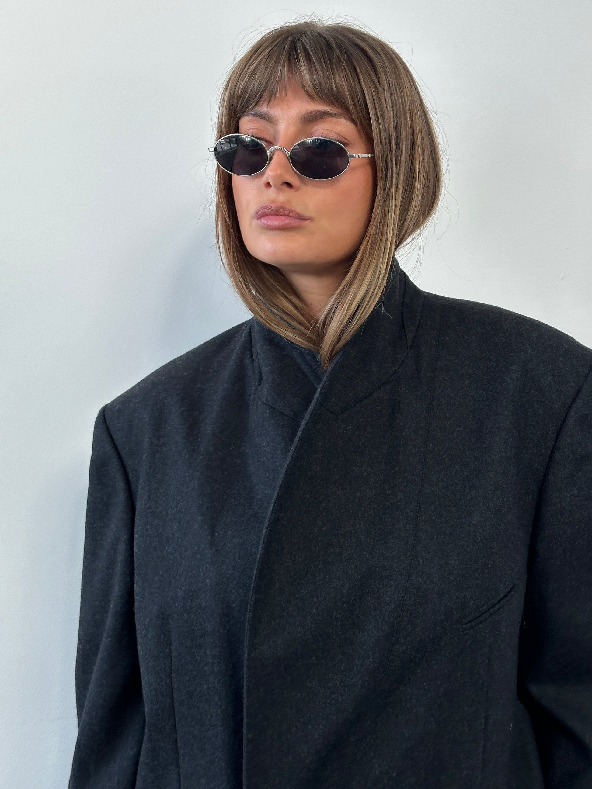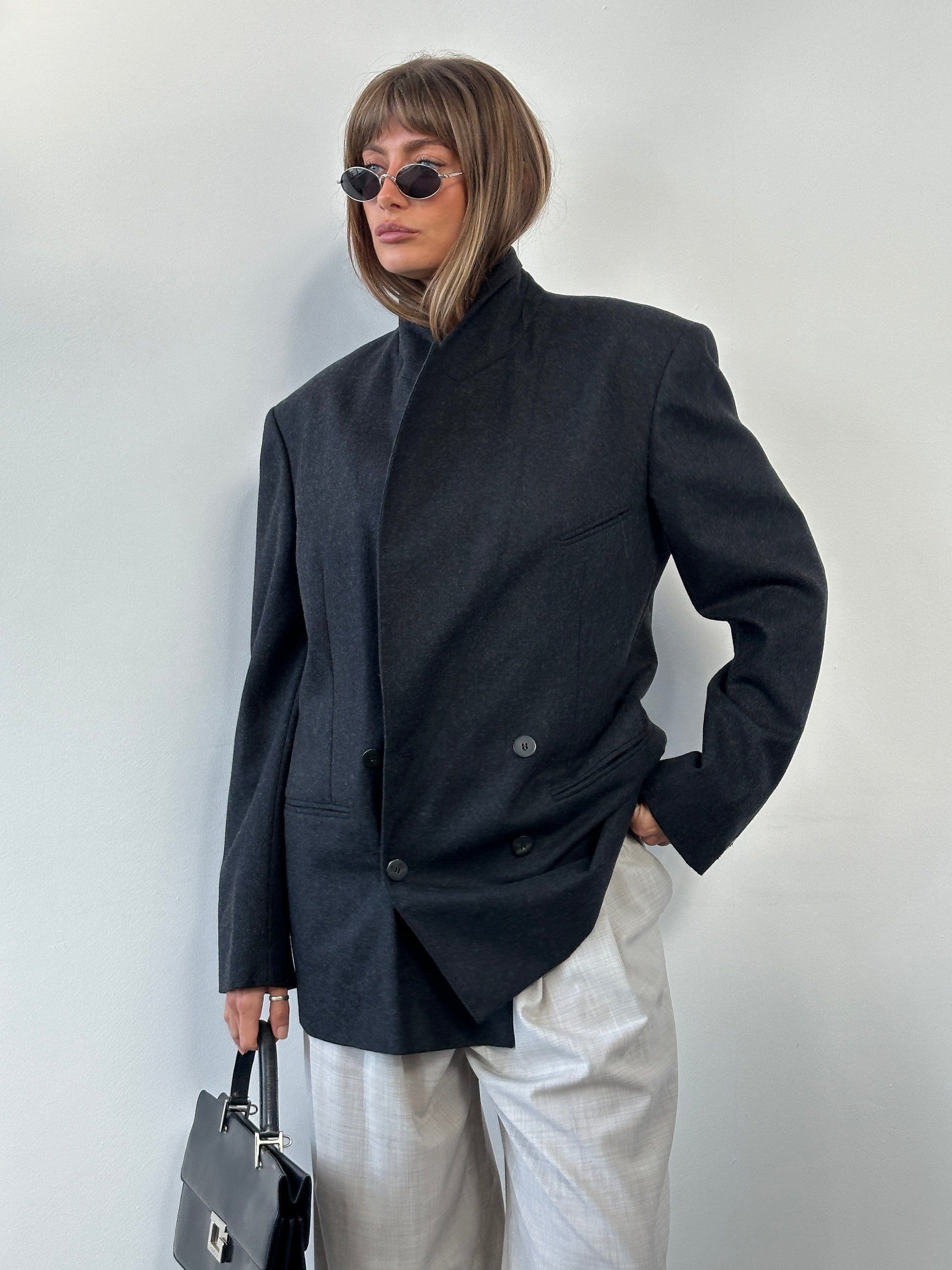 Vintage 1980s Charoscuro blazer in a grey tone with a soft brushed wool finish. Features a wide lapel and an asymmetric chest pocket for a minimal contemporary feel.
