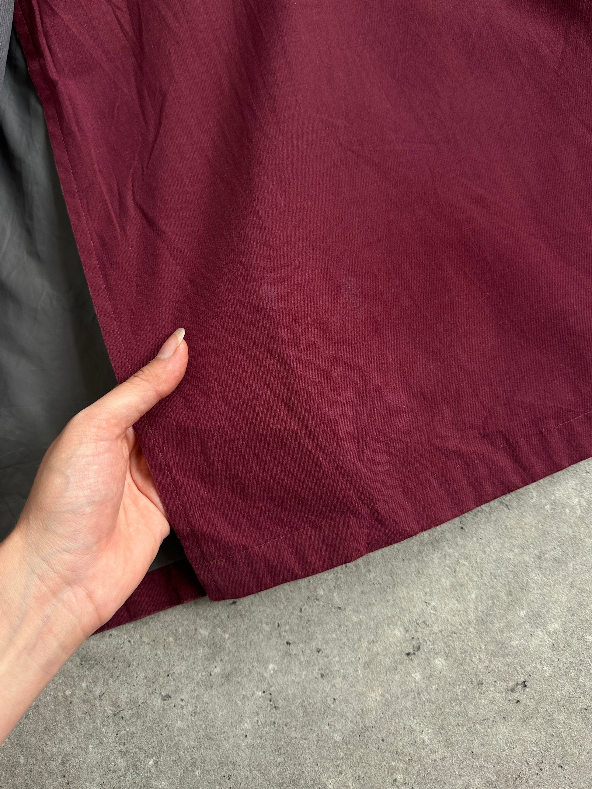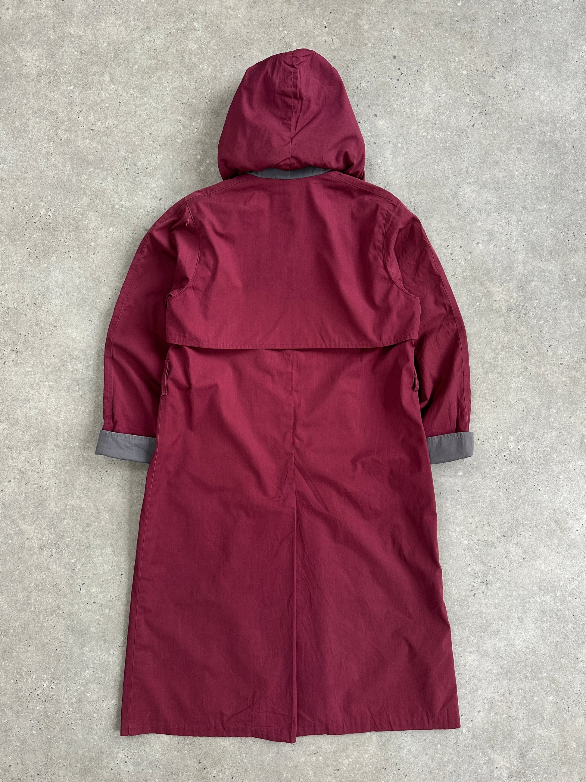 1980s London Fog burgundy trench with removable hood, concealed placket and styling options for contrasting colour.