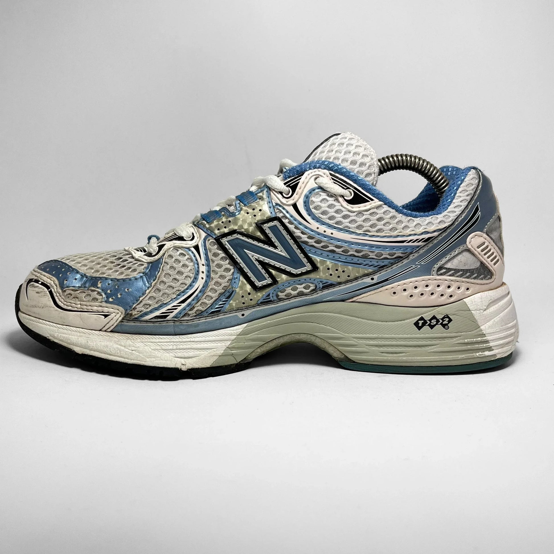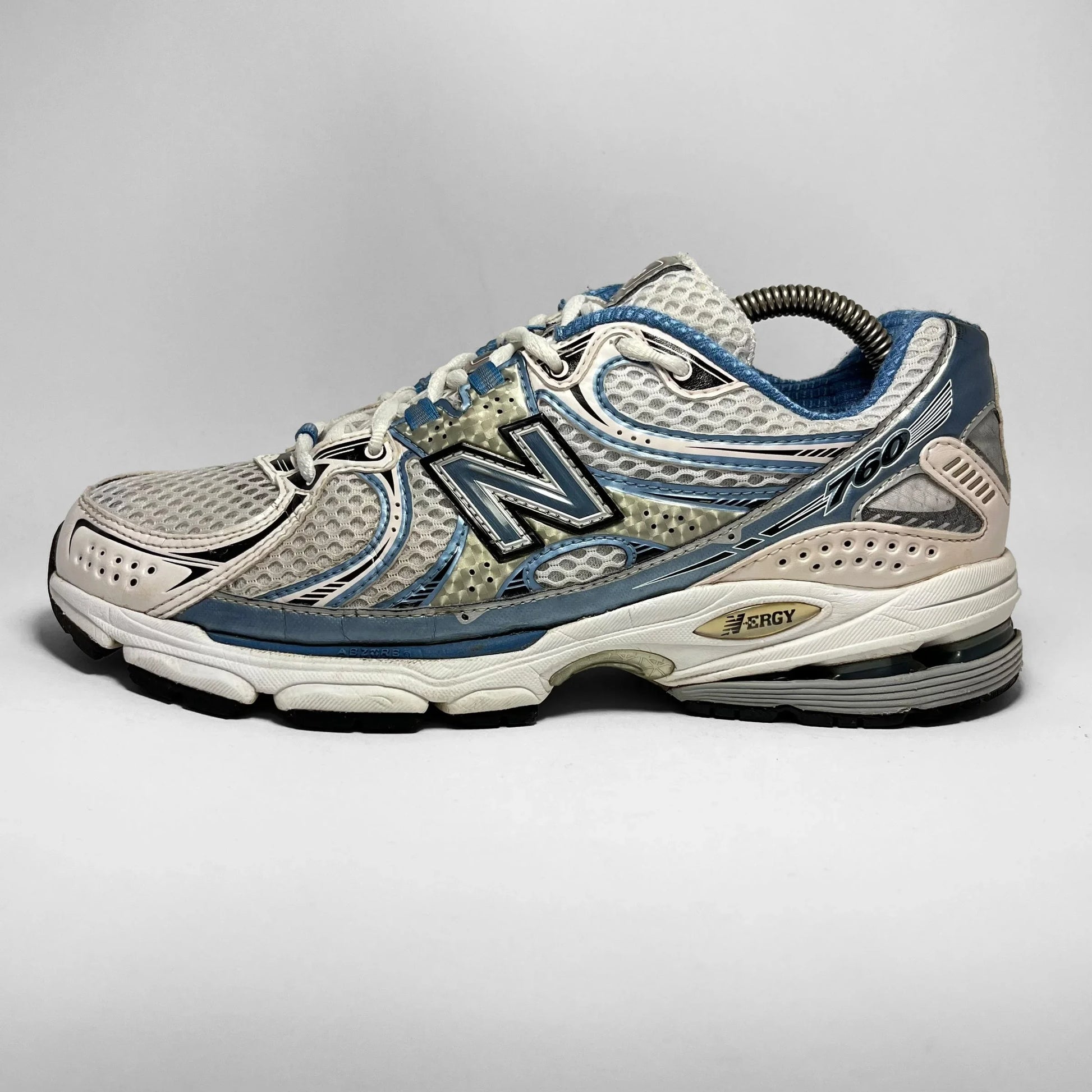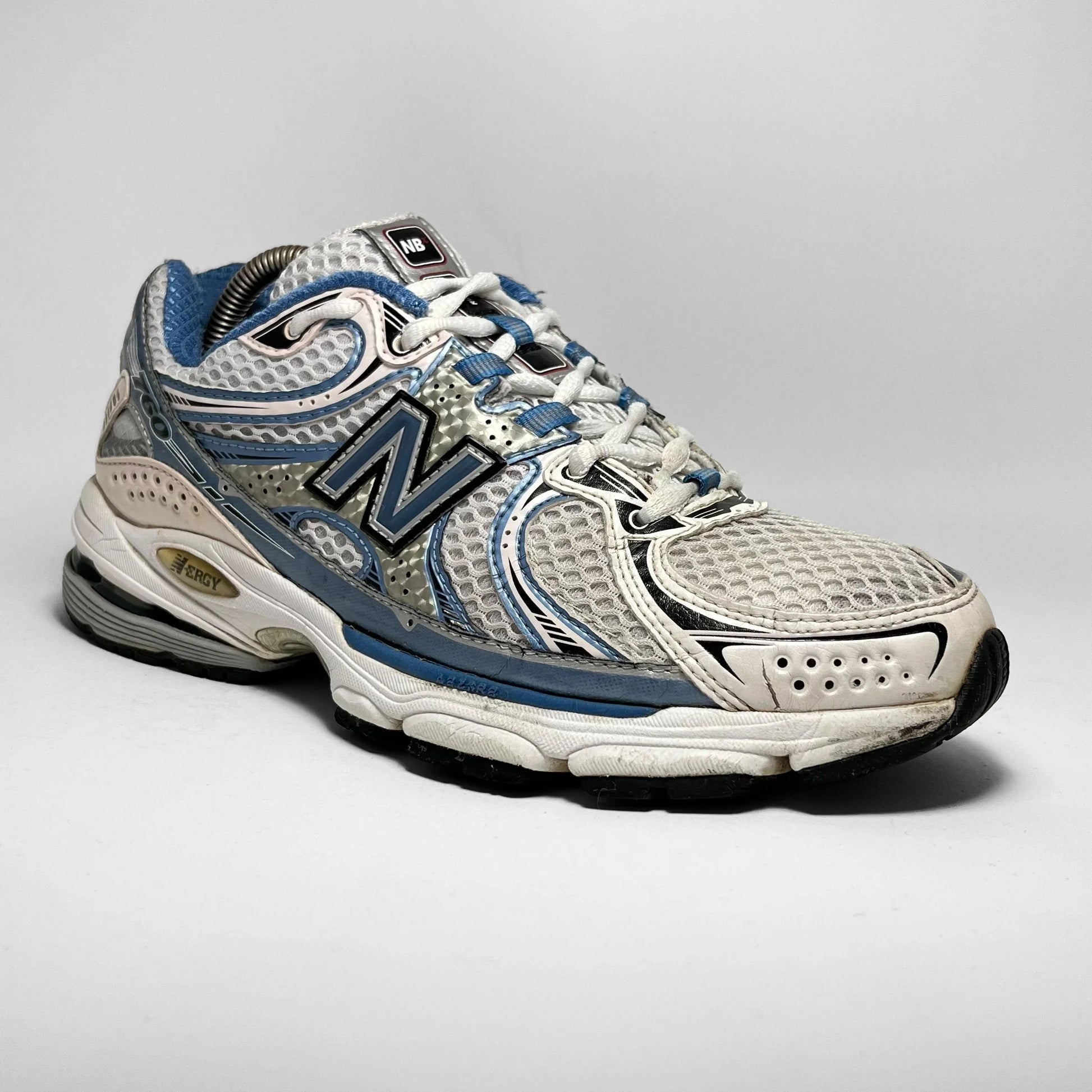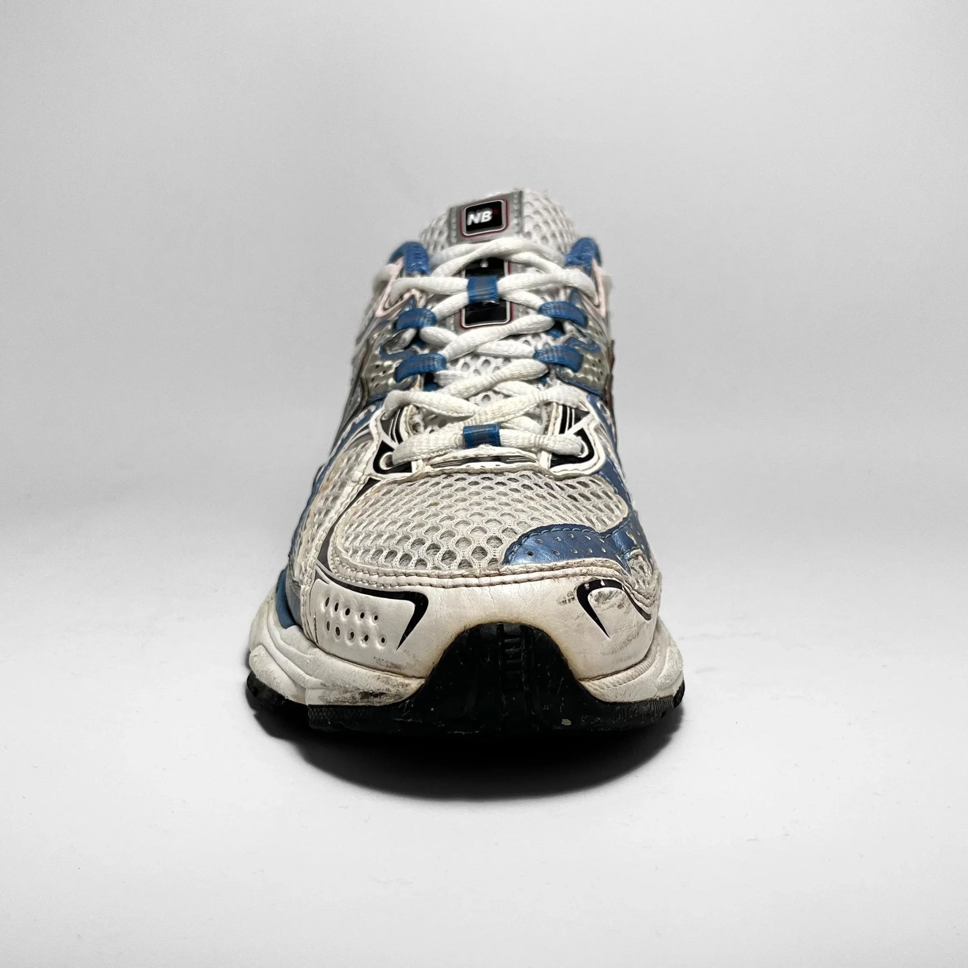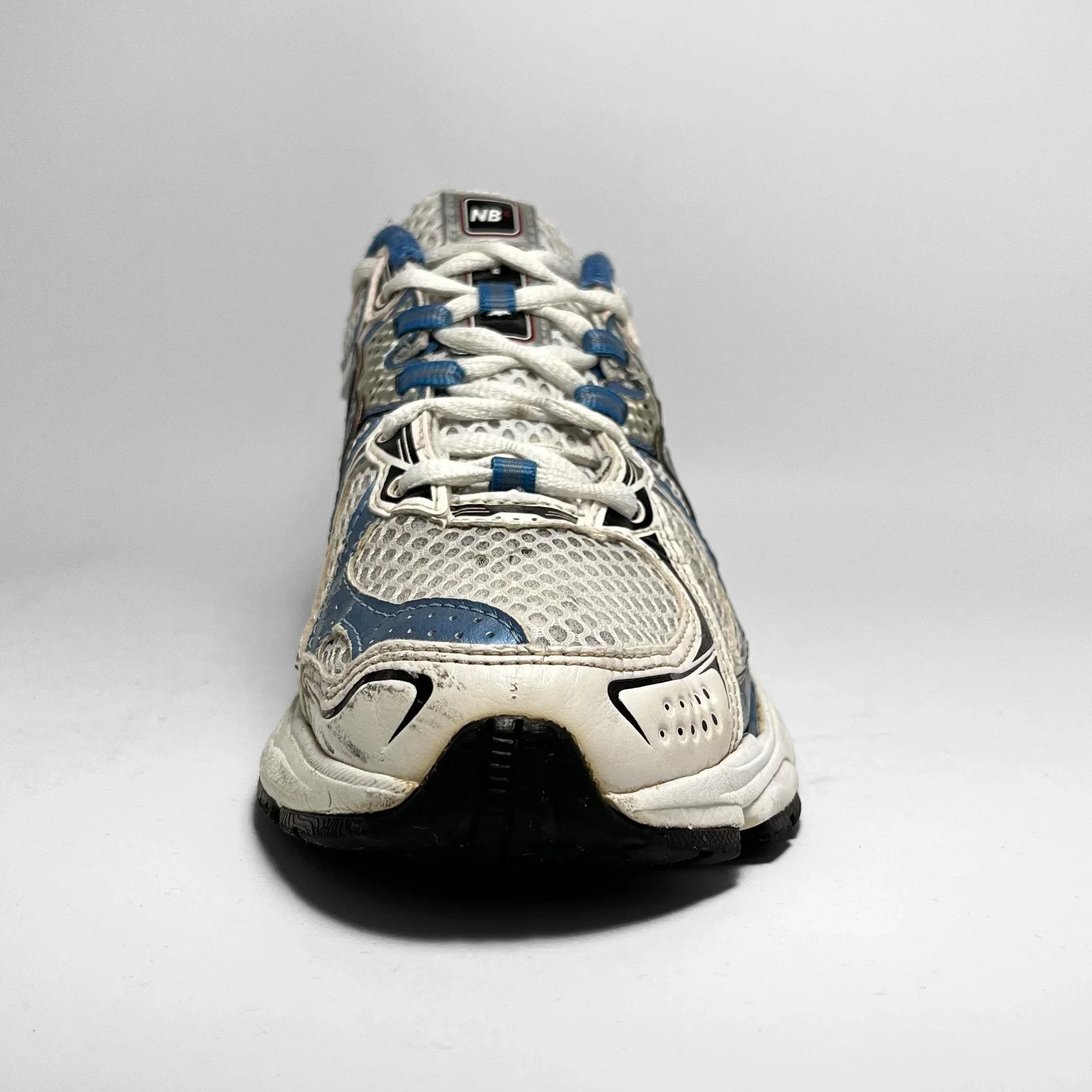 Mesh body layered with leather panels incorporating metallic blue painted parts, printed details throughout and perforation details.