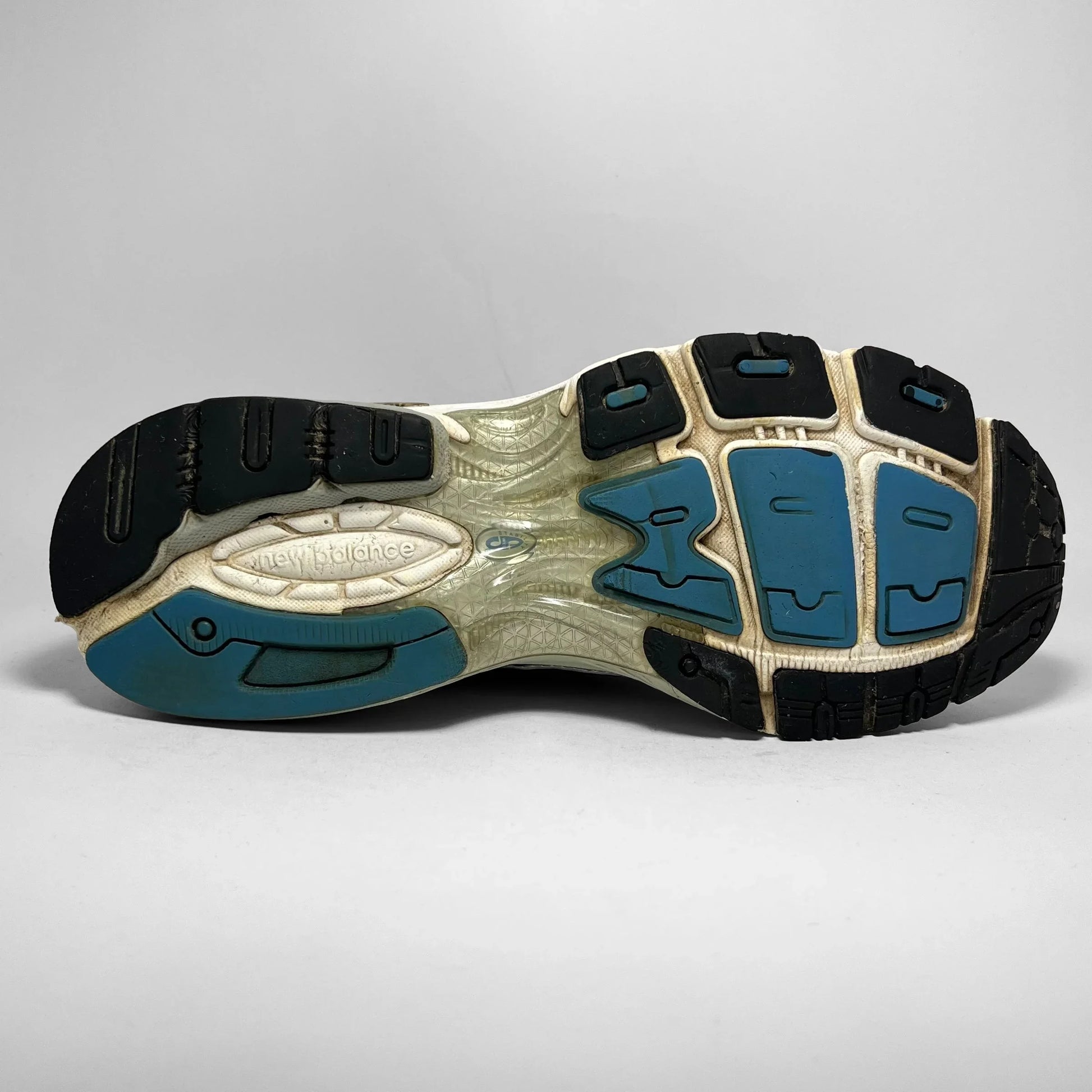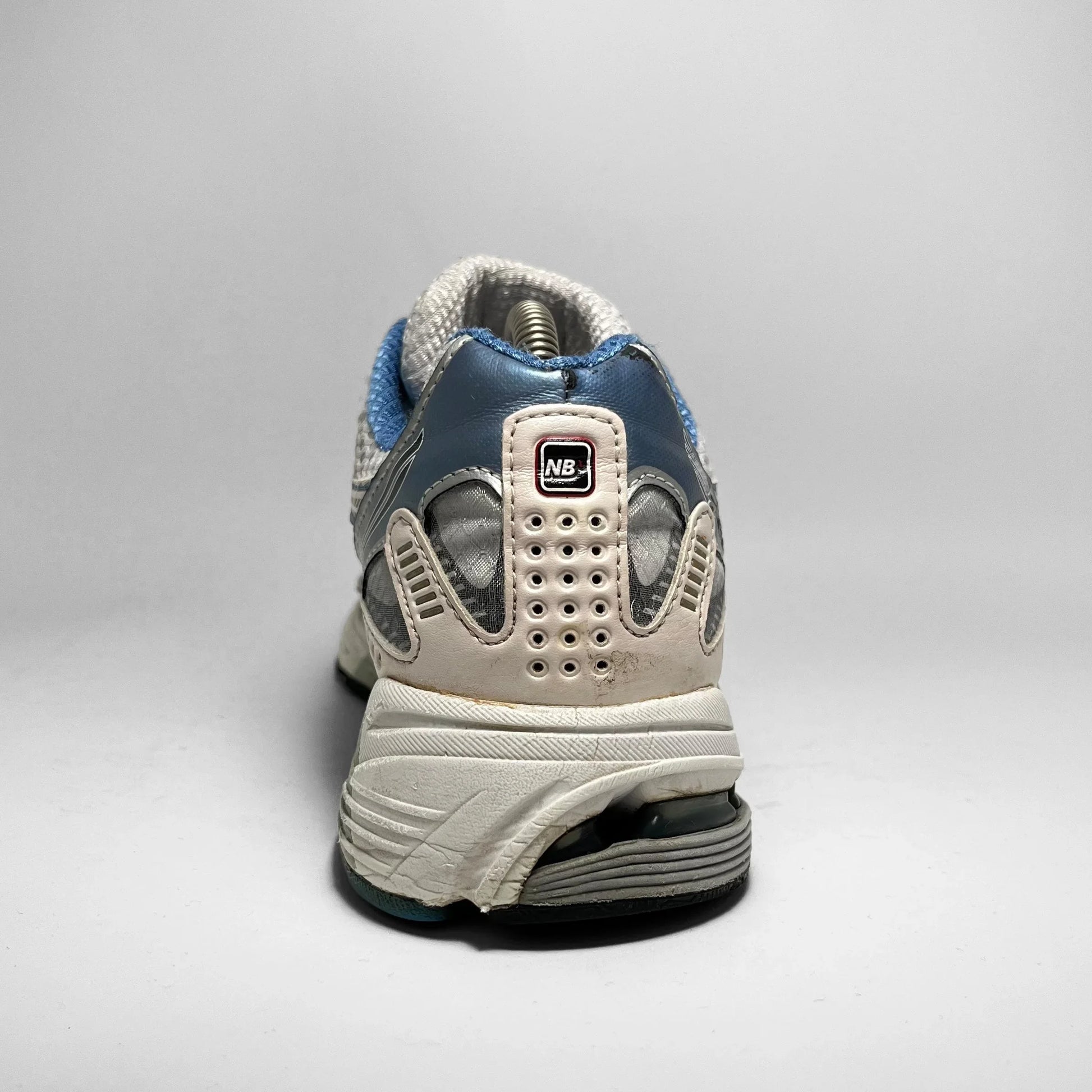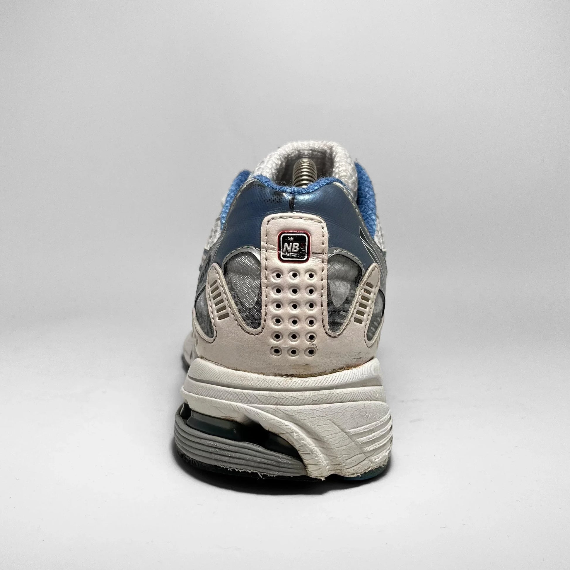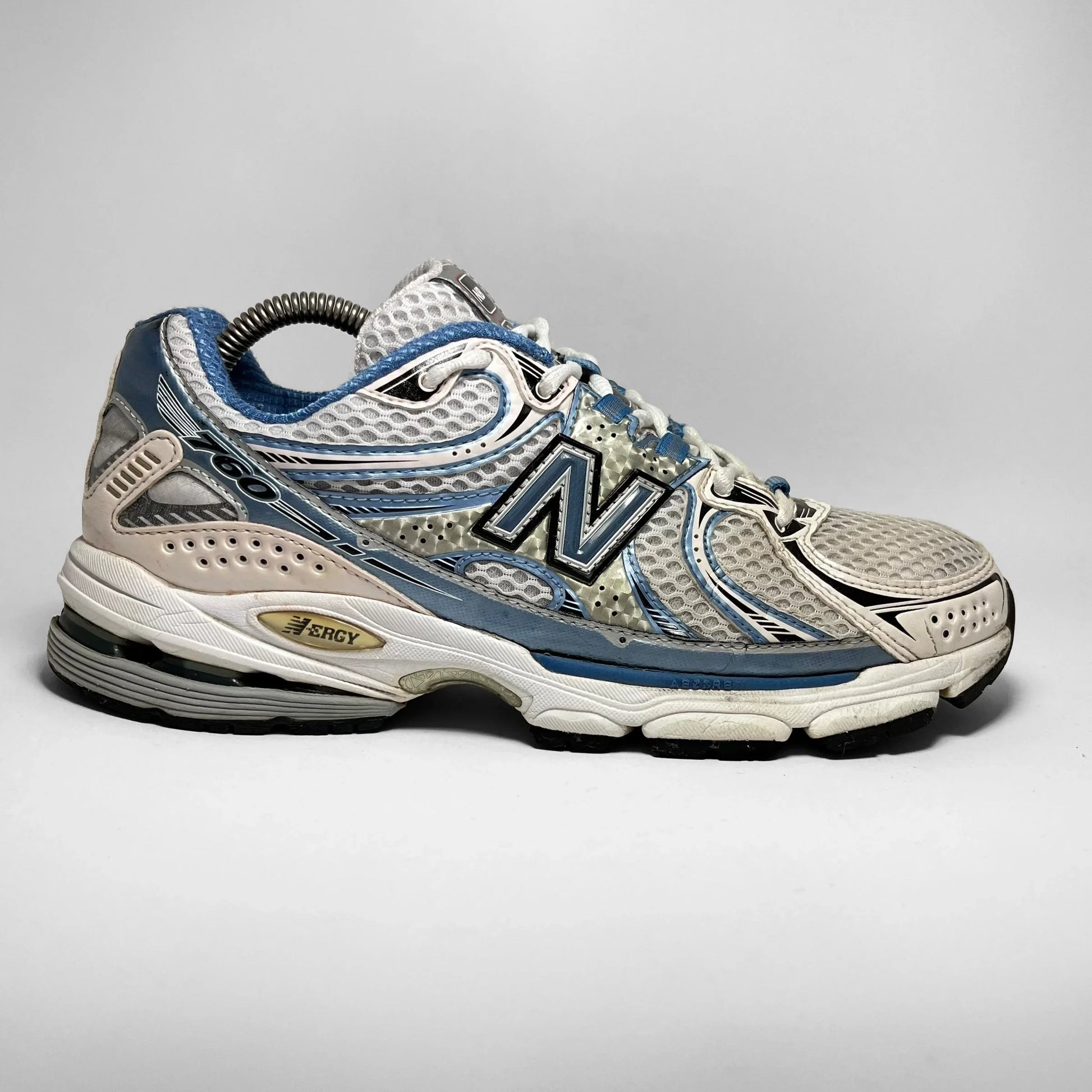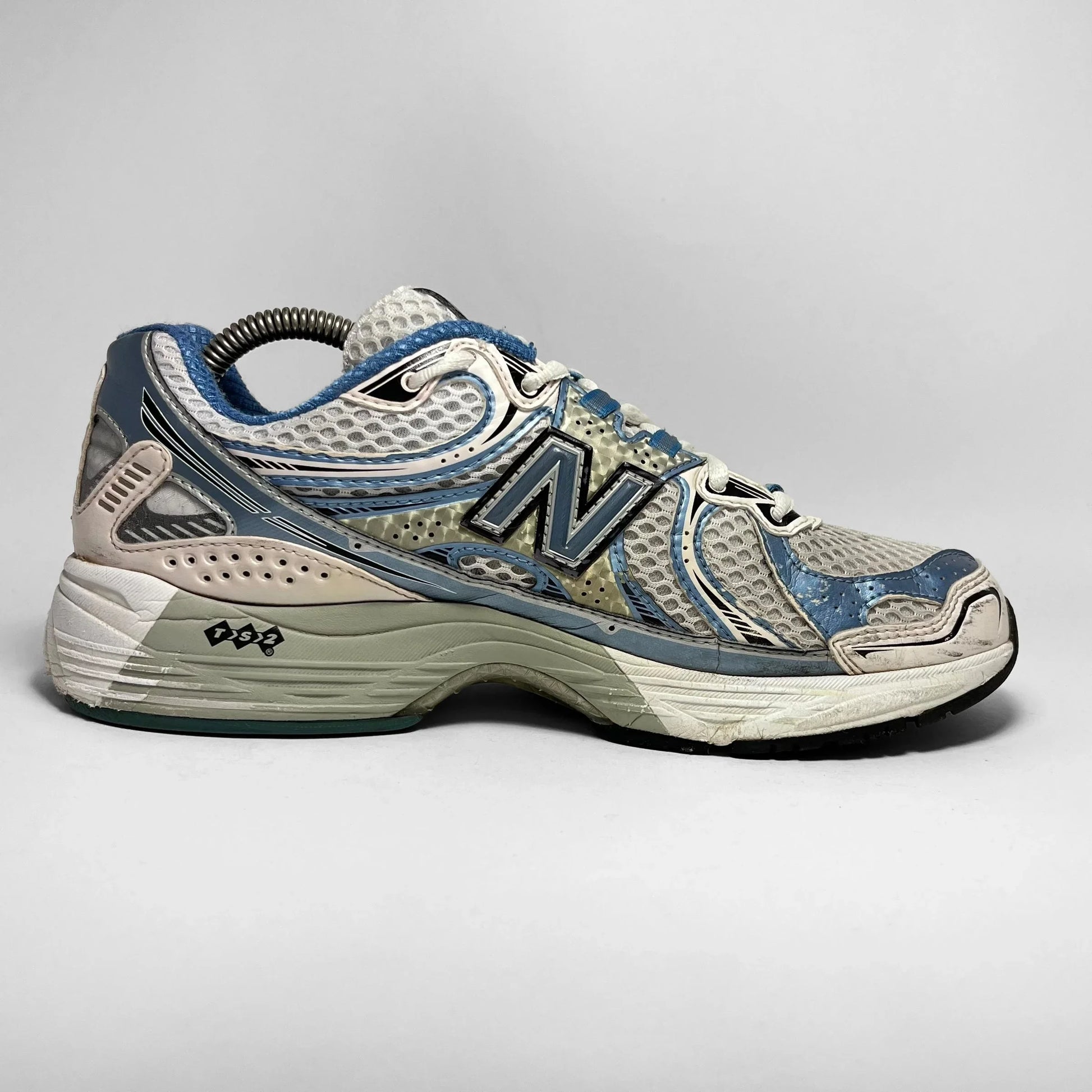 Mesh body layered with leather panels incorporating metallic blue painted parts, printed details throughout and perforation details.