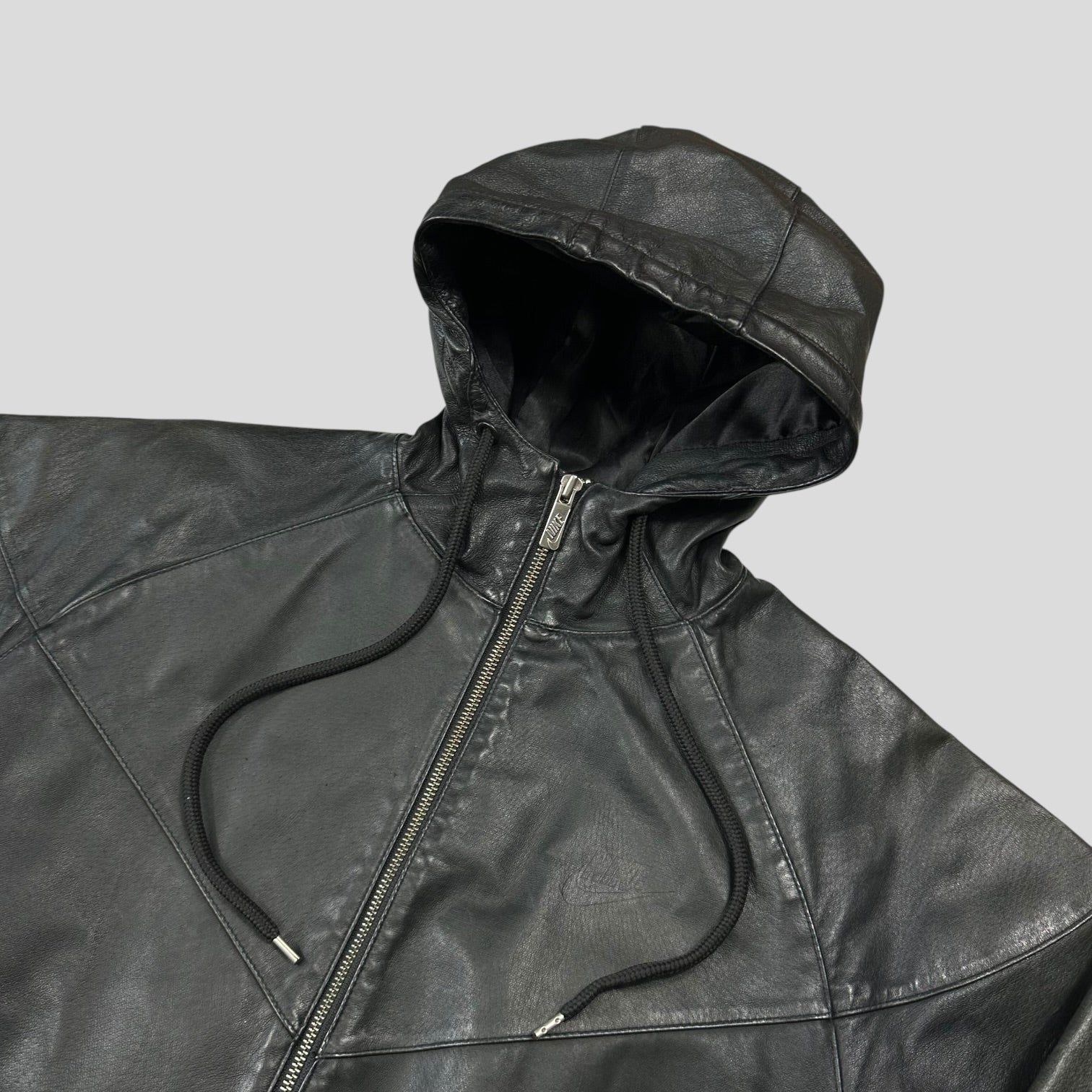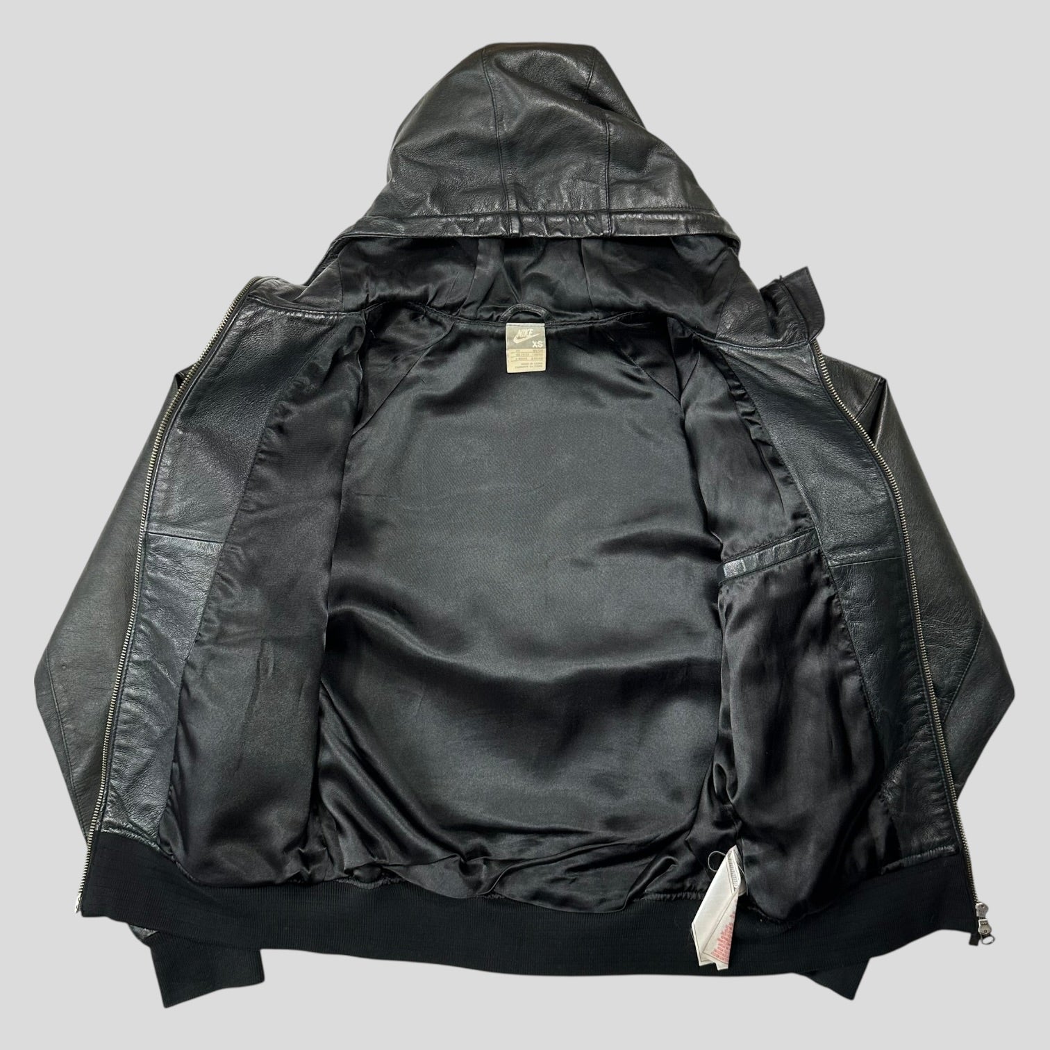 Simple minimalistic Nike 2007 by Tony Spackman black pig leather boxy bomber hoodie jacket, excellent fit blending a track jacket and hoodie bomber, low-key embossed Nike logo to the chest, silky and cozy acetate lining.