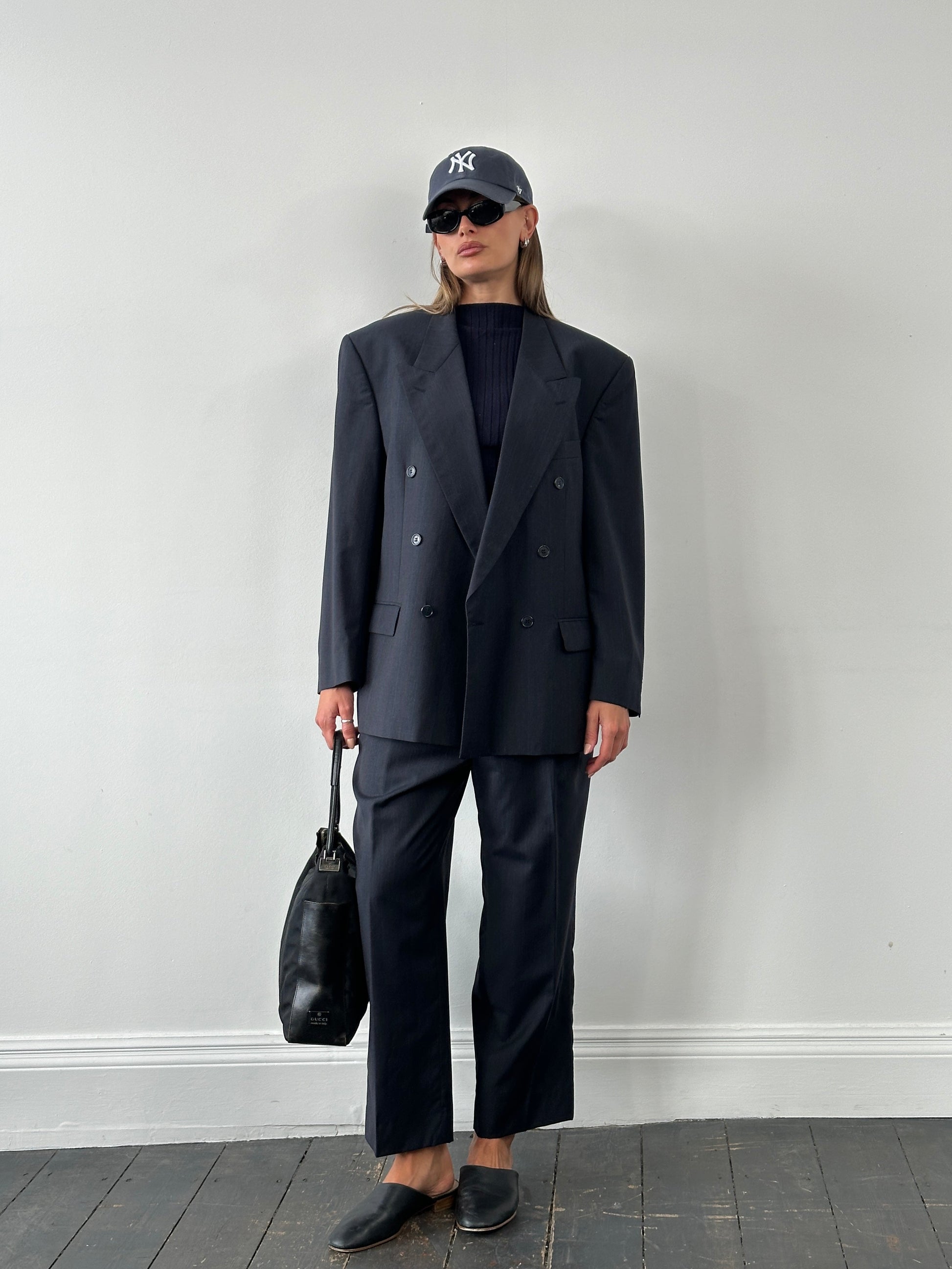 Vintage 1990s double breasted pure wool suit by Pierre Balmain, finished in navy with a subtle burgundy stripe. Structured jacket and straight leg trousers, fully lined in logo branded monogram viscose.