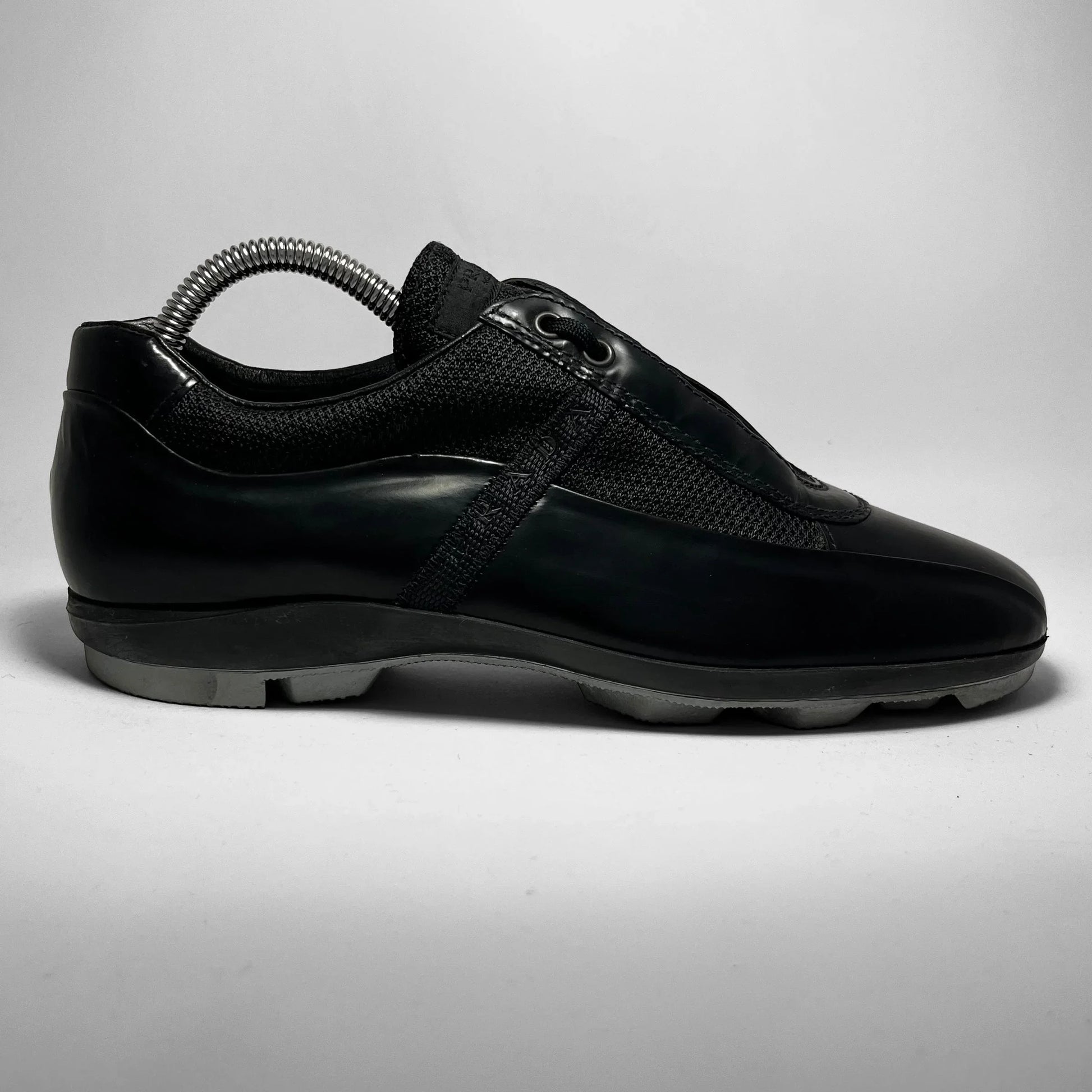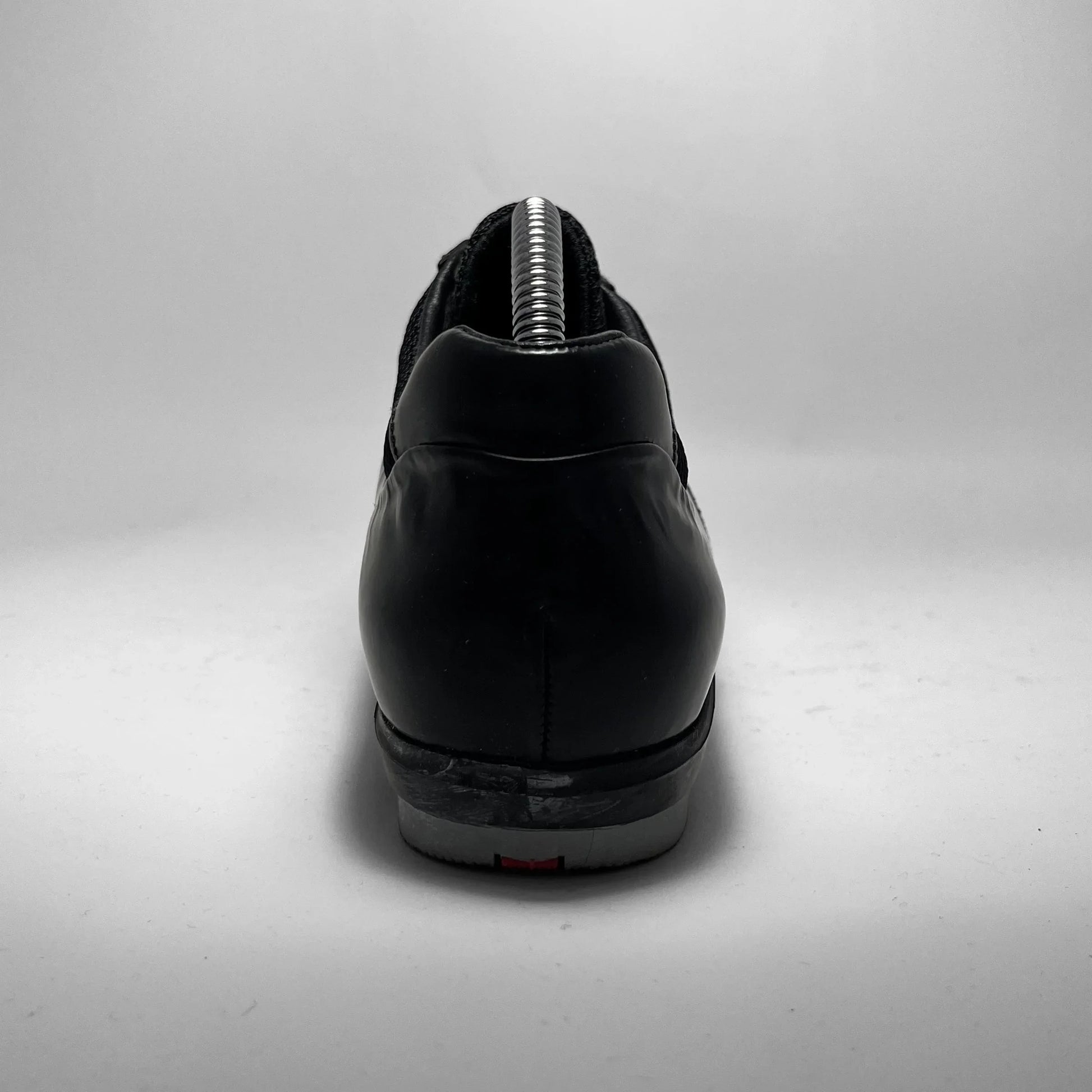 Leather upper with a mix of mesh on the sides and tongue, woven cotton strap stitched along the sides showing the Prada script, branded tag on top, red tab on outsole and football cleats inspired outsole.