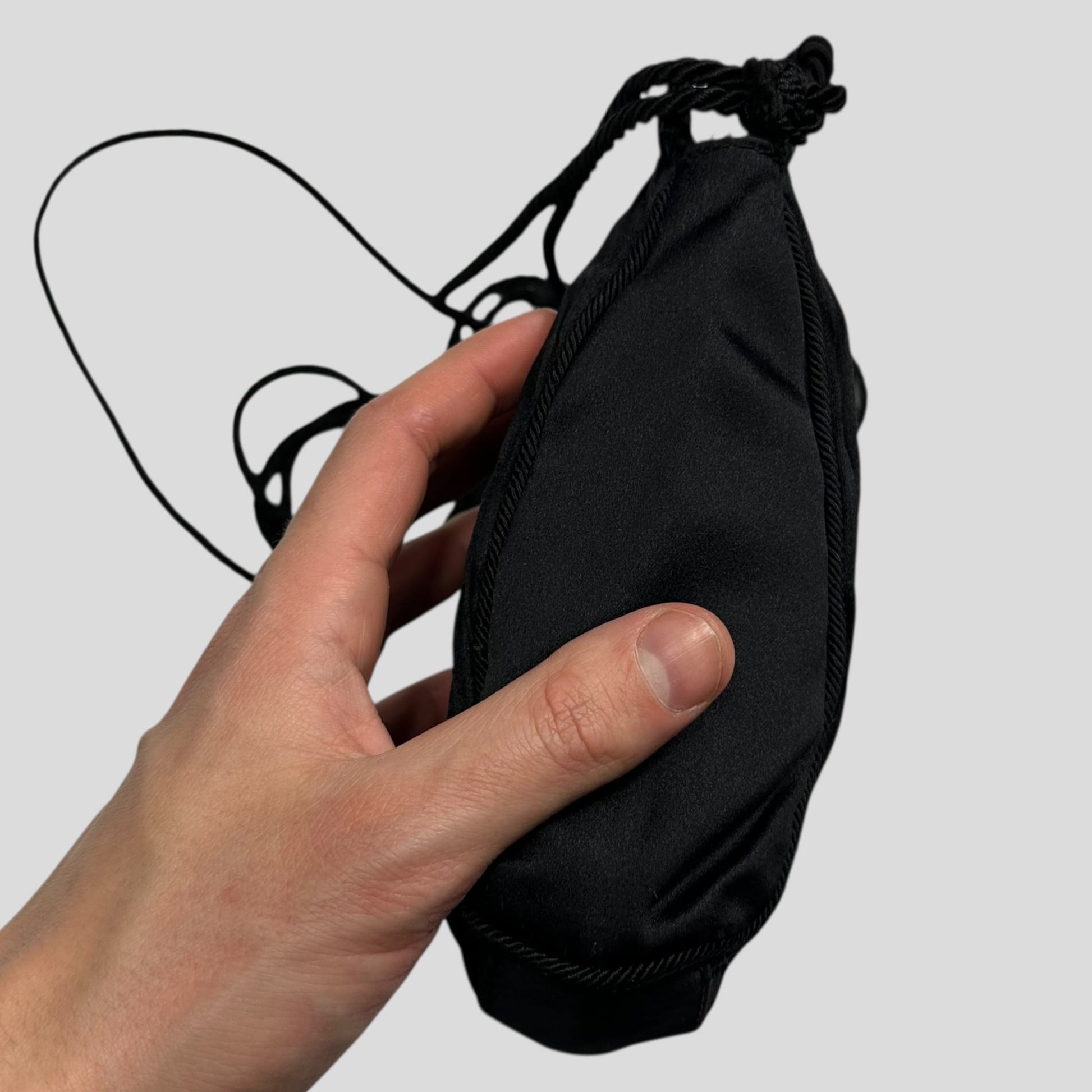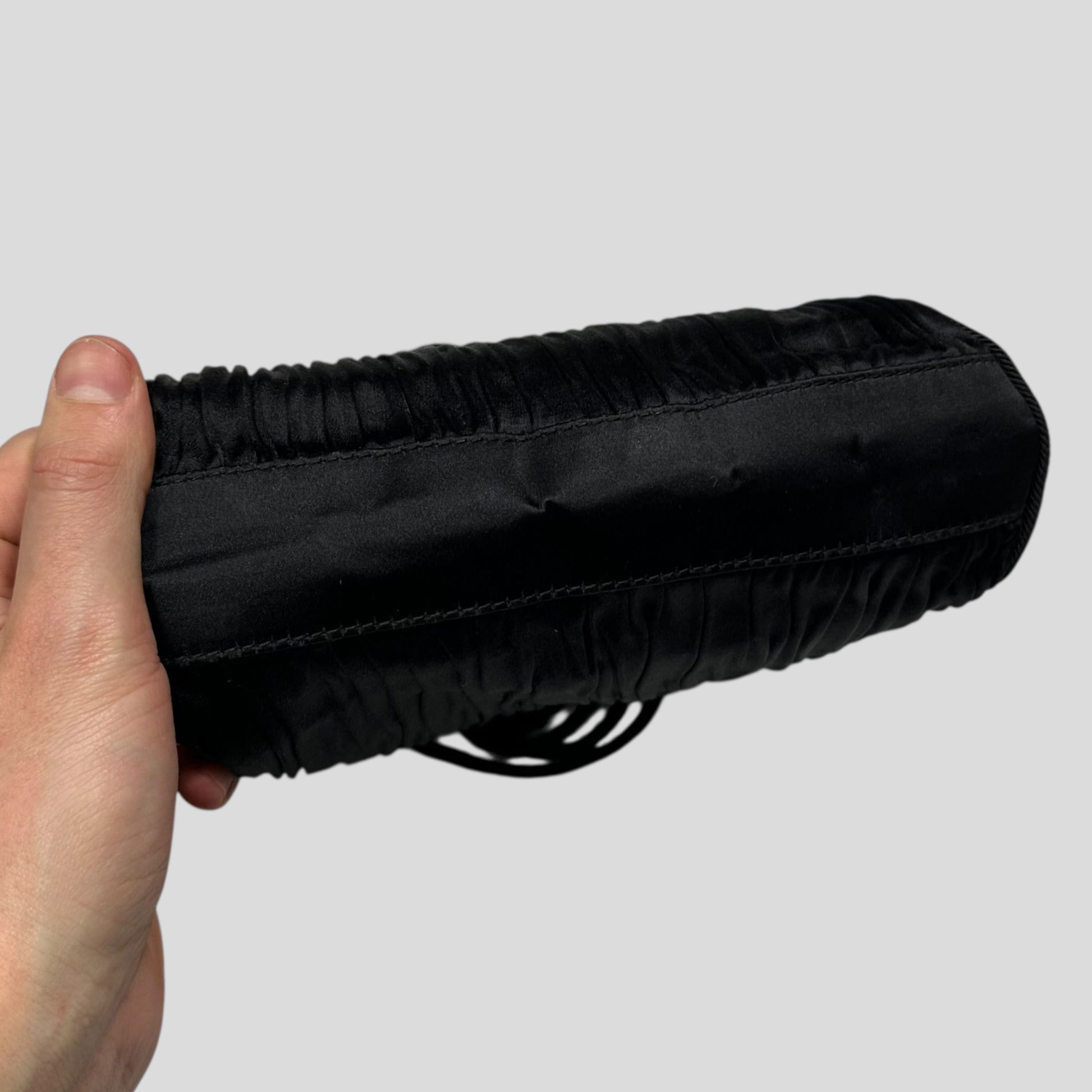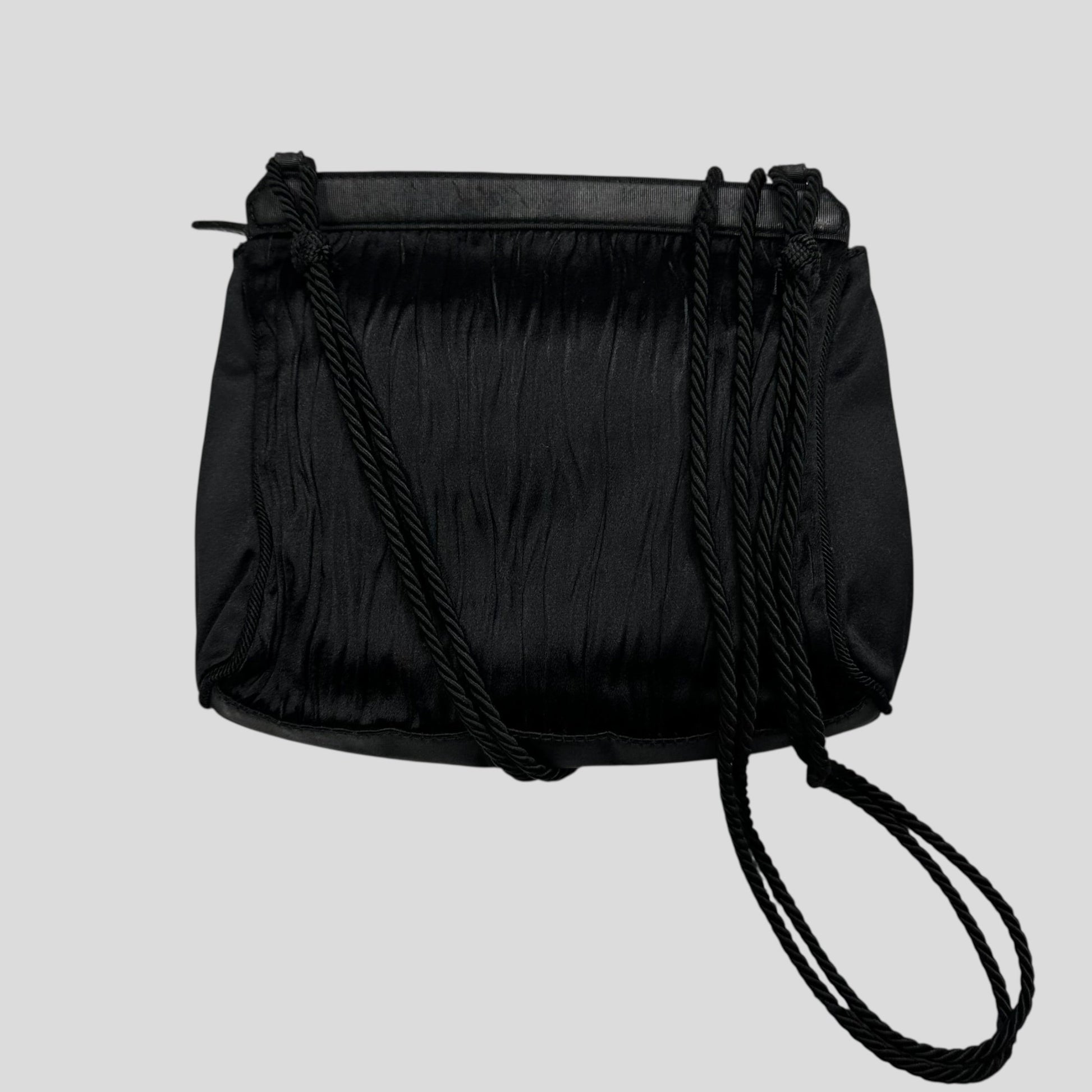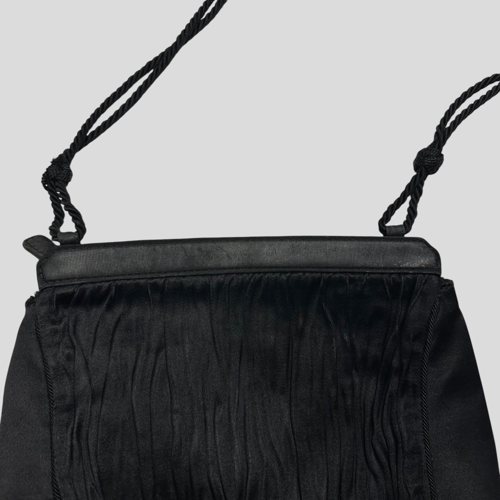 Cute and chic 1990’s Prada mainline crossbody velvet velour textured black purse bag, 3D zebra type stripes in all black, two zip compartments for storage, rope style strap.