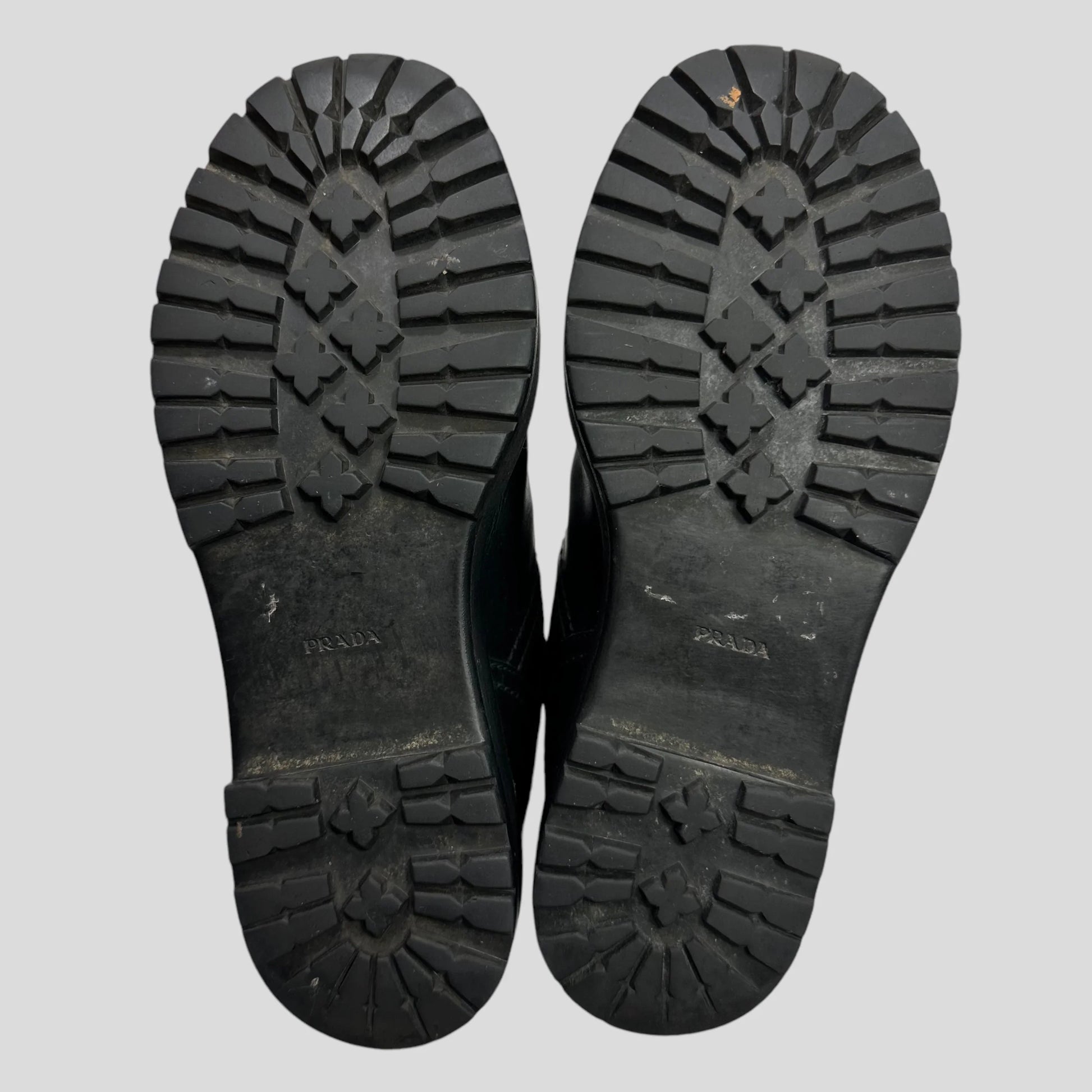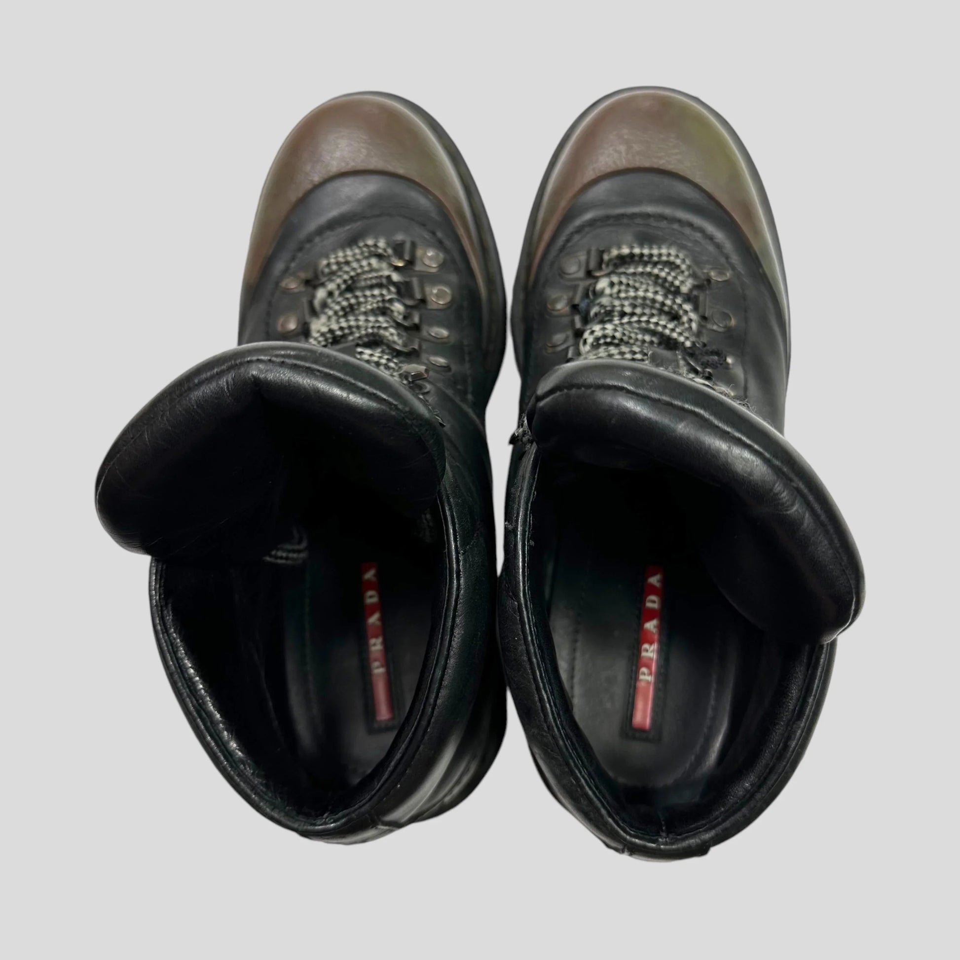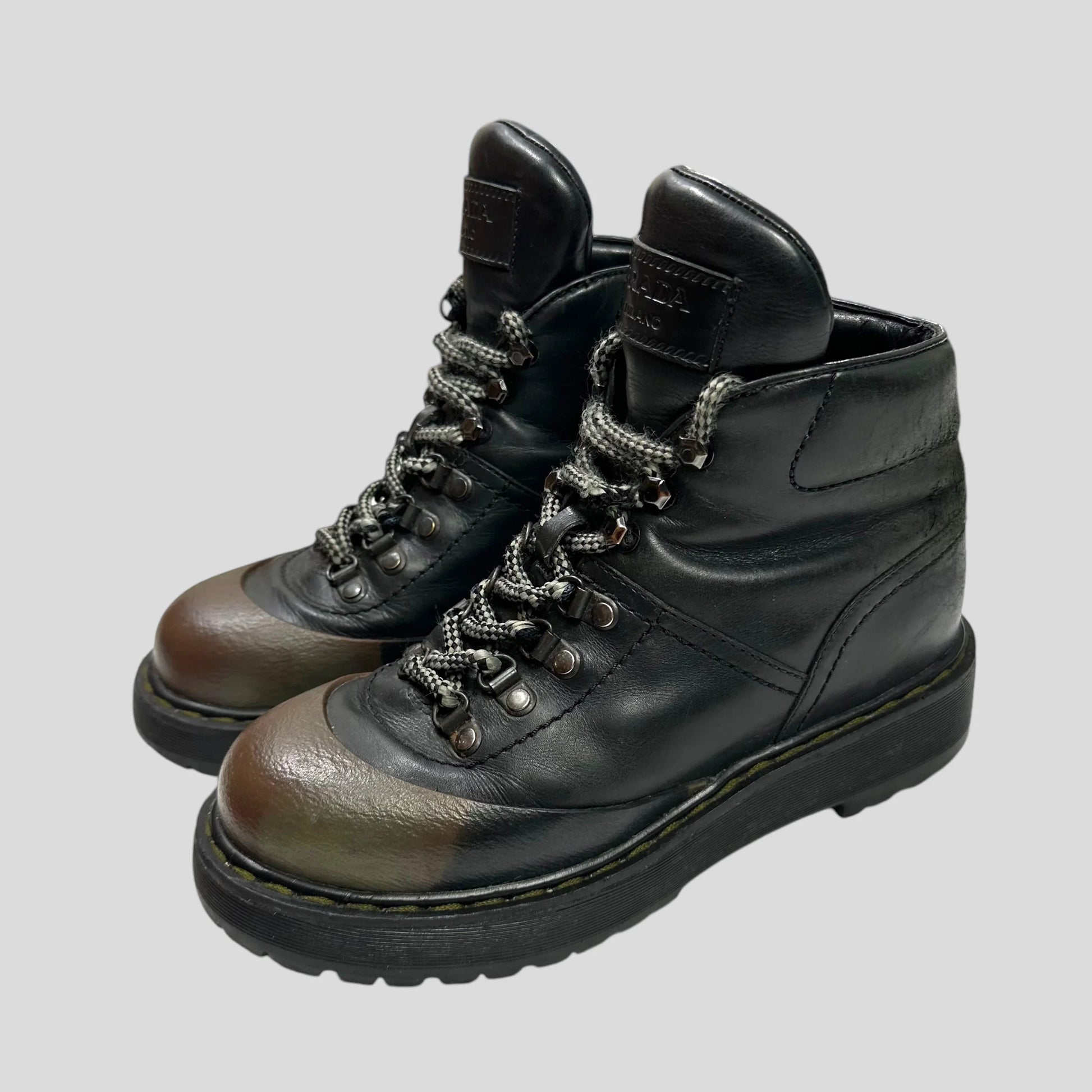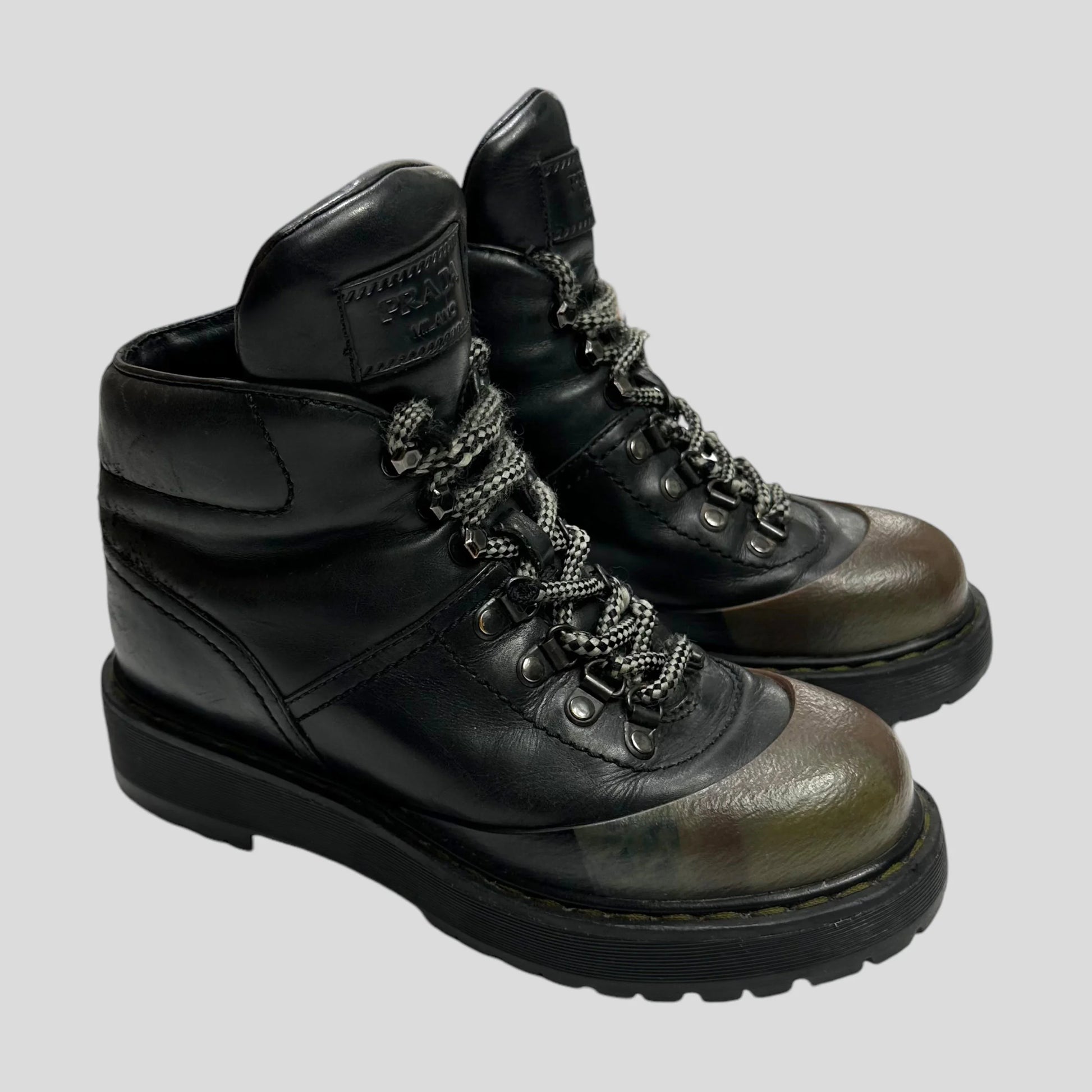 Very rare Prada Milano real leather combat boots, unique rubber camo toe cap with Prada Milano leather branding on the tongues, super soft high quality leather with chunky lug soles and a slight heeled insert for added height.