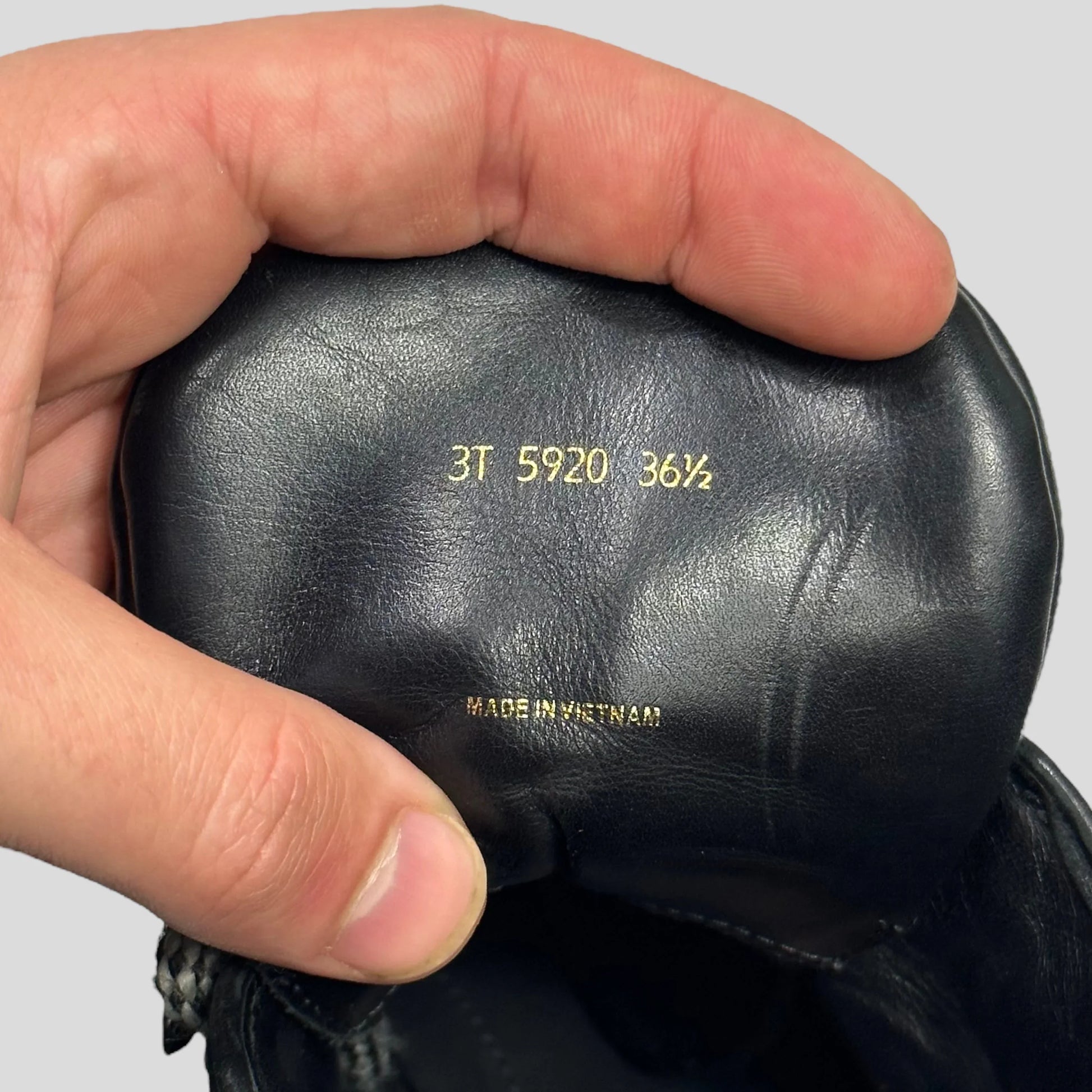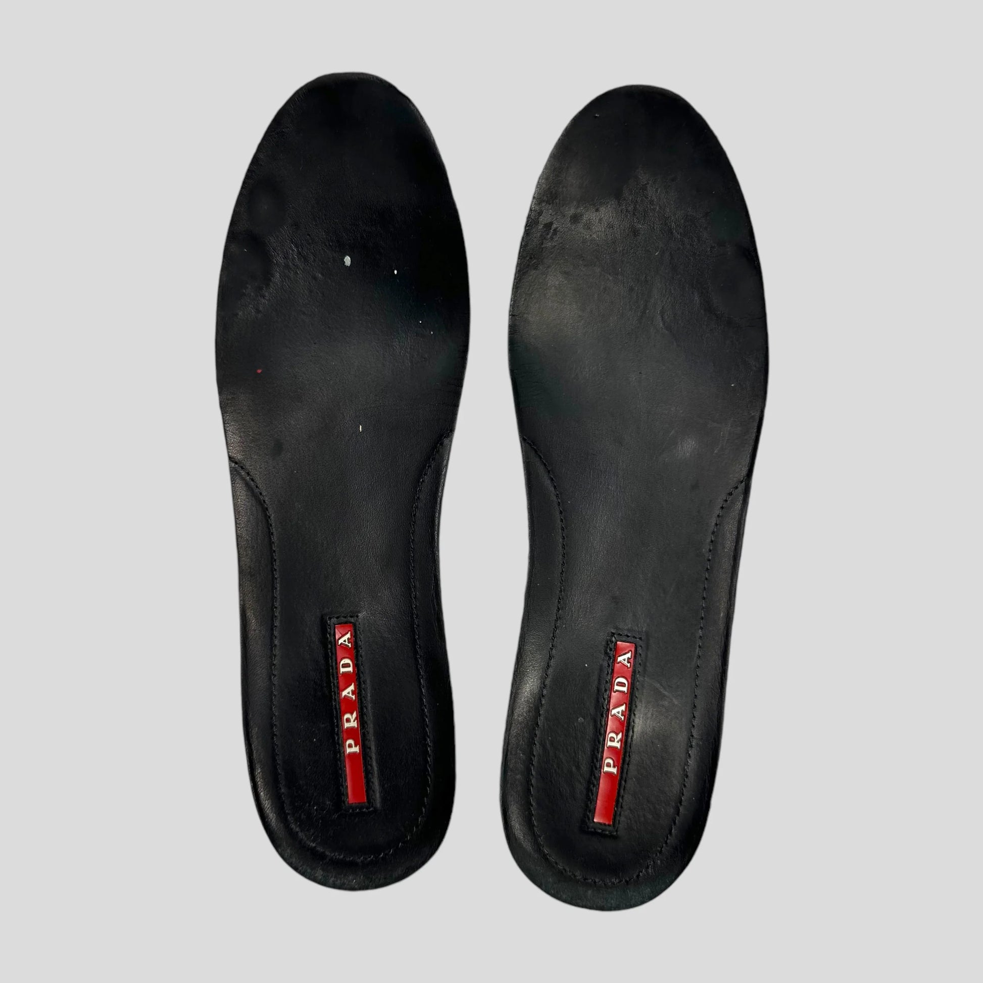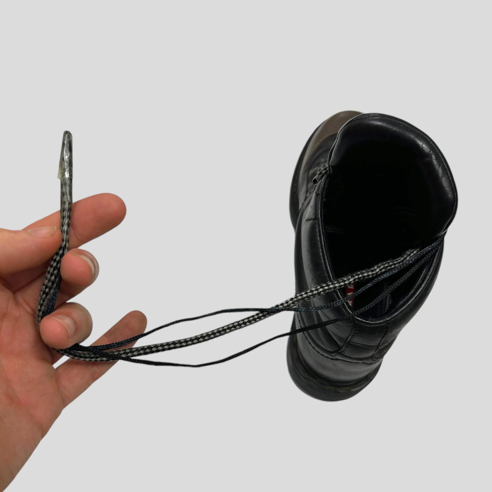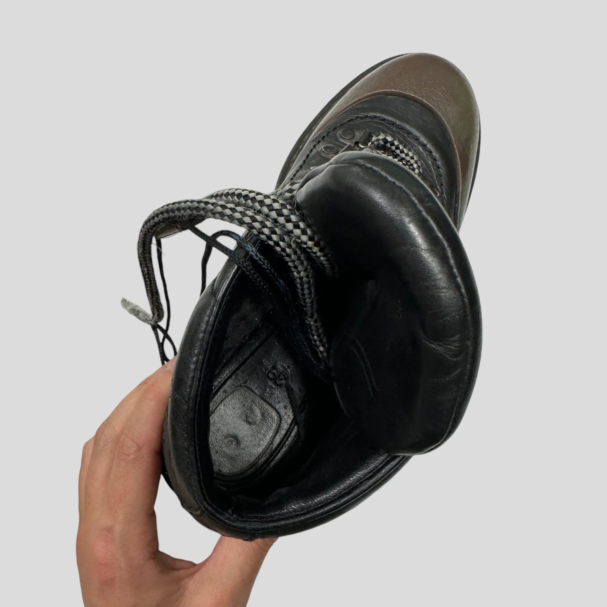 Very rare Prada Milano real leather combat boots, unique rubber camo toe cap with Prada Milano leather branding on the tongues, super soft high quality leather with chunky lug soles and a slight heeled insert for added height.
