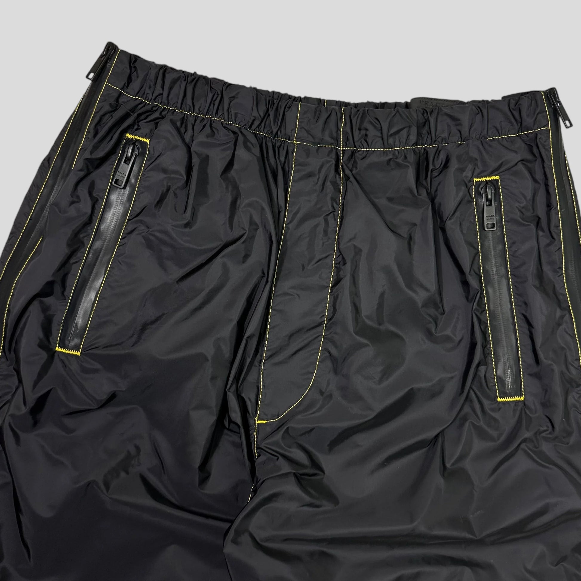 Extremely rare Spring Summer 2017 runway black nylon tech trousers with overlocked yellow stitch detailing, functional laminated side zips run down the outside of both legs, toggle at ankle to fit, elasticated waist, zip hand pockets and popper pocket on seat, contrasting yellow stitching.