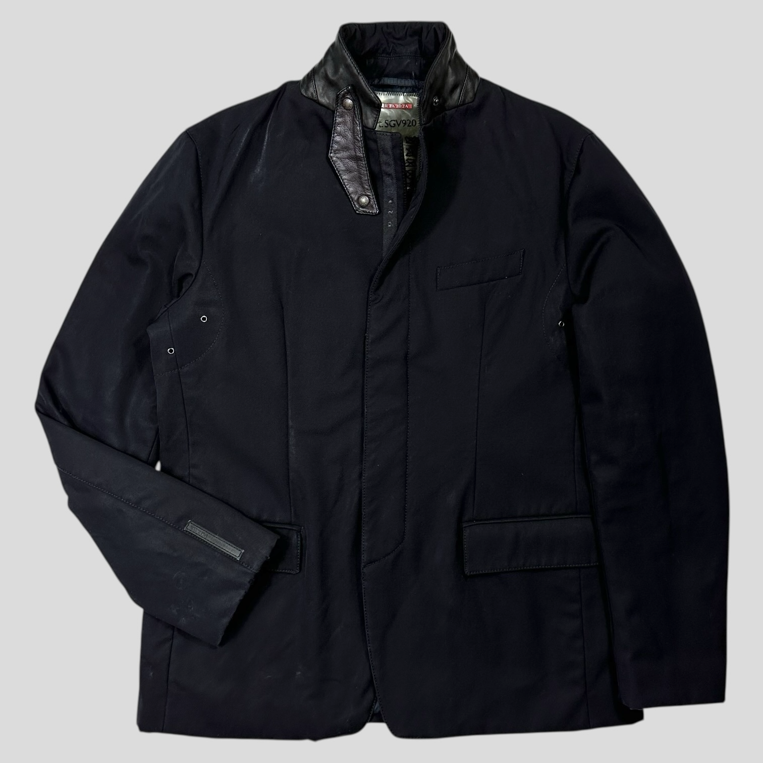 Rare 2007 Prada Sport midnight navy sporty blazer jacket, unique leather modular neck guard that can be used to fully close the neck of the jacket or taken off and stowed in pocket when worn open.