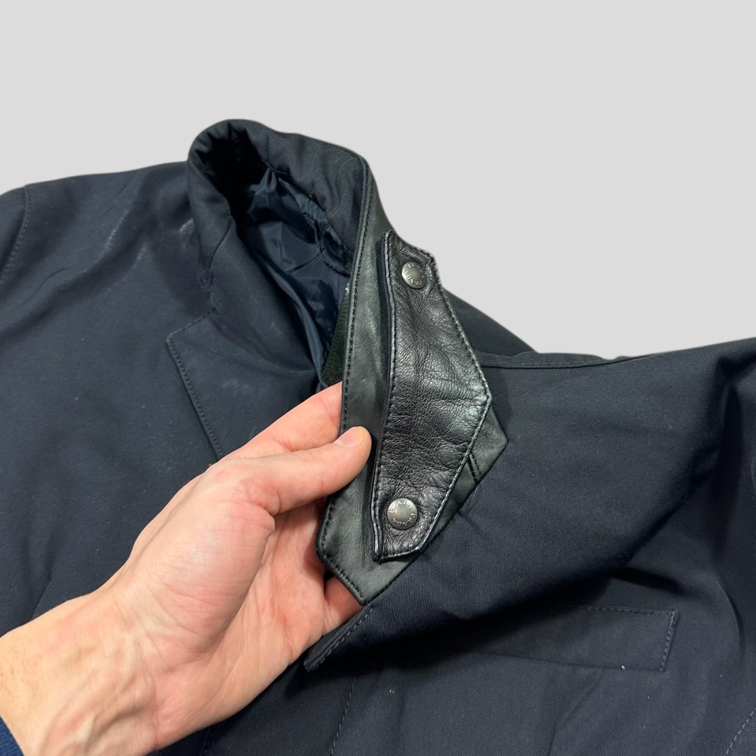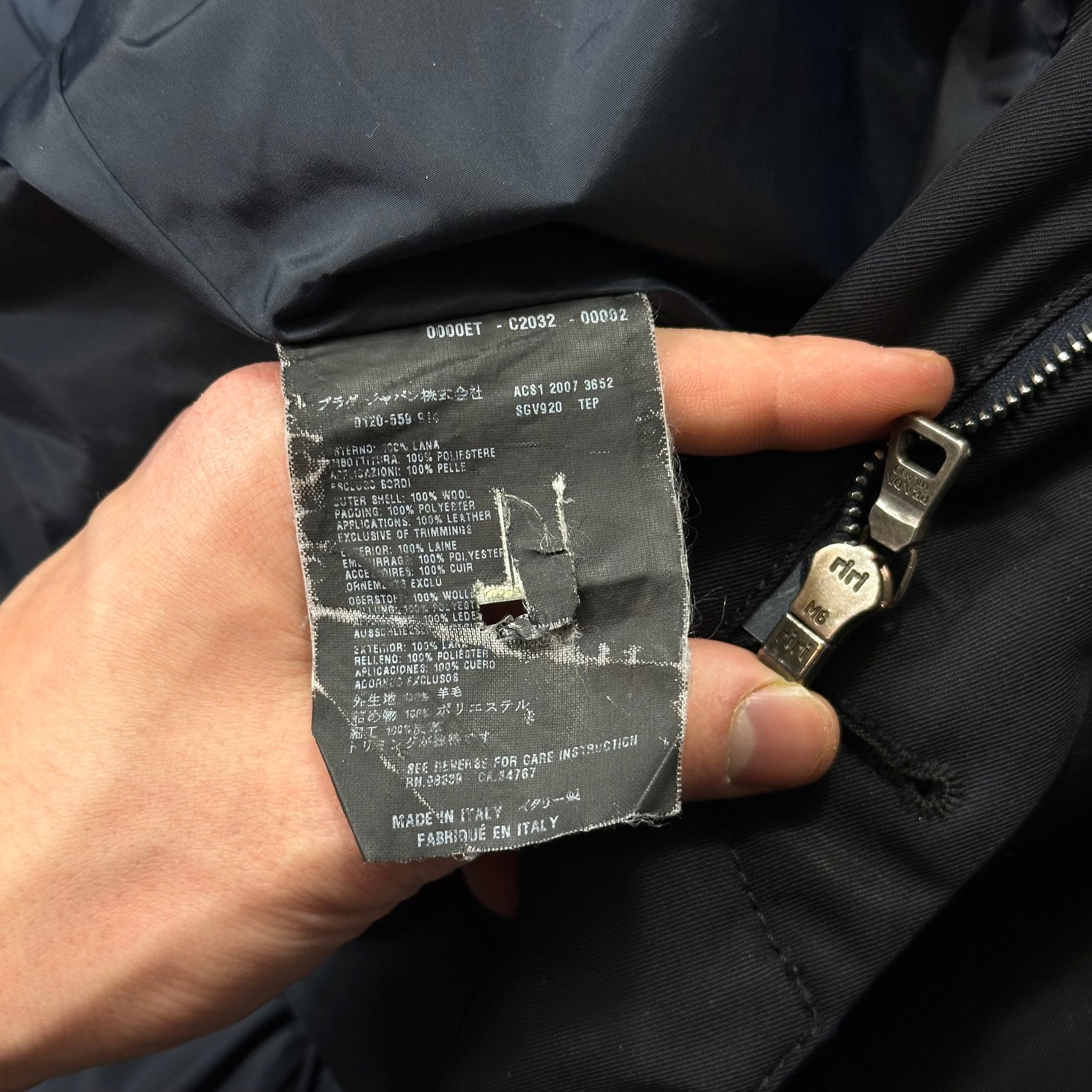 Prada leather logo tab to cuff, Carbon logo to central seam, warm lightweight down padding, constructed from a high density wool canvas that feels more like soft cotton, super unique piece made in Italy incredible quality.
