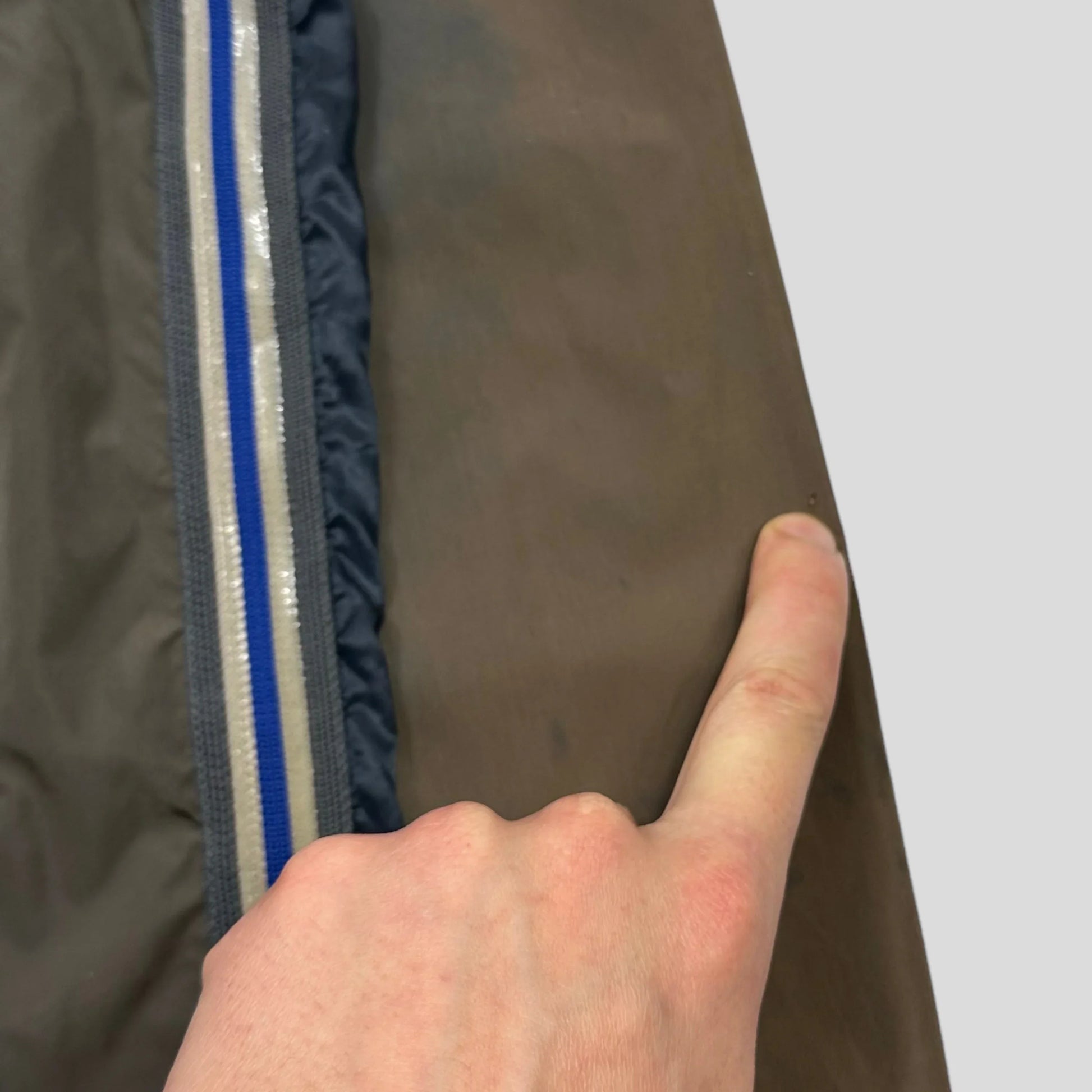 Extremely rare Prada Sport Spring Summer 2000 Runway Gel Series Jacket, brown / grey frontal construction with the iconic gel series piping to the side seams, unique convertible blue semi transparent nylon back panel with packable nylon hood to match, back of jacket can be unzipped from the inside making it longer in length and providing additional back coverage.