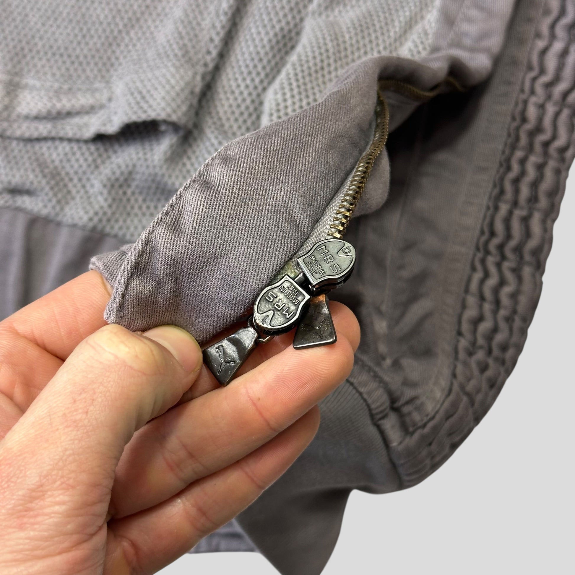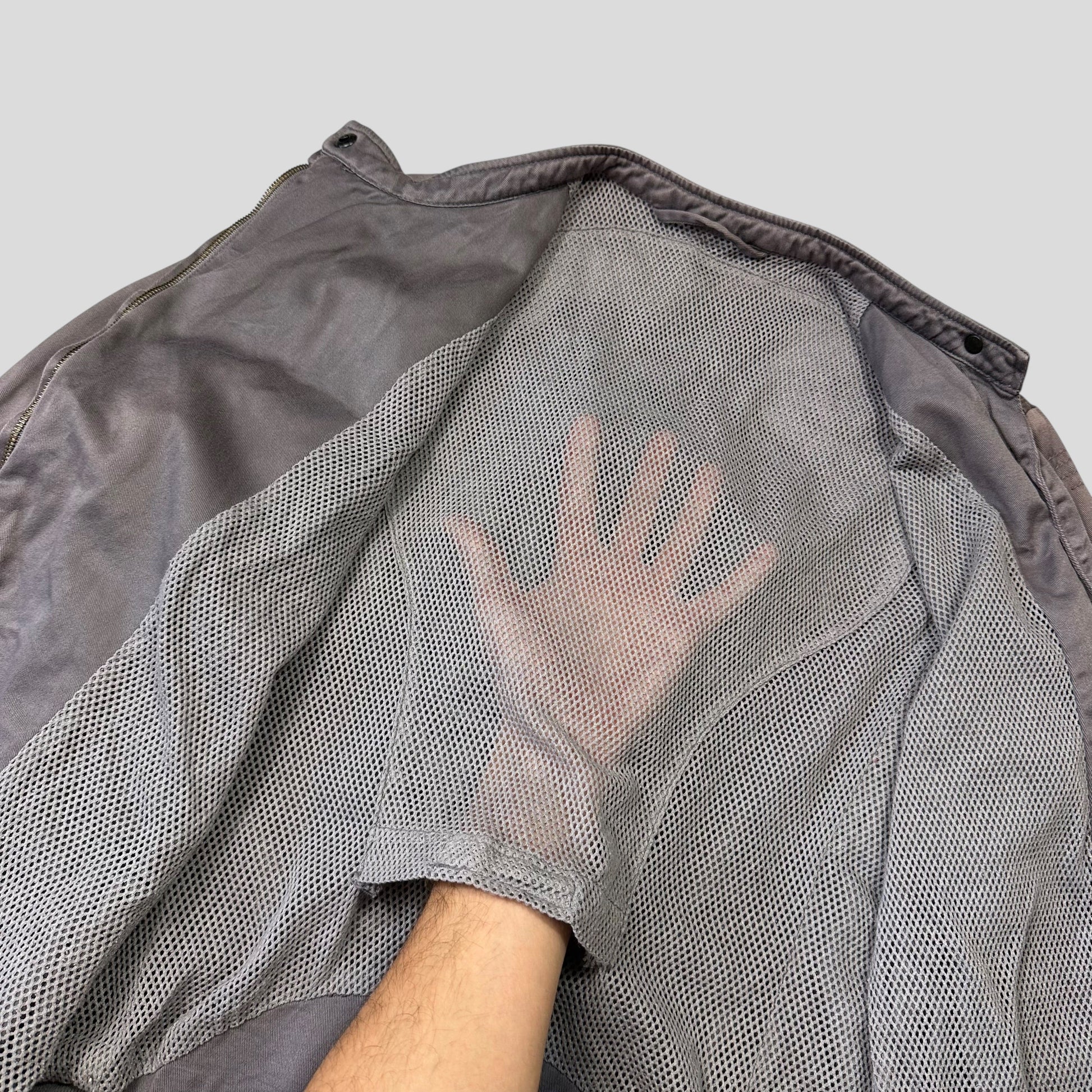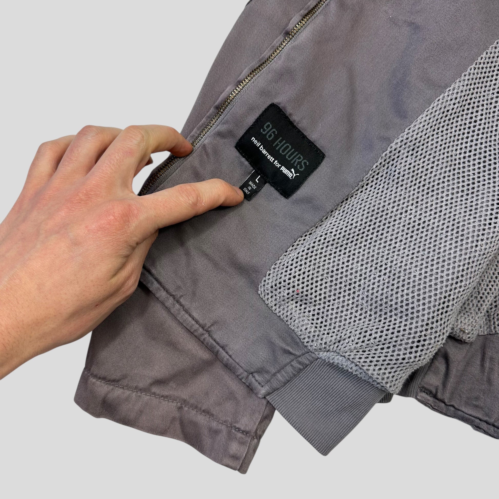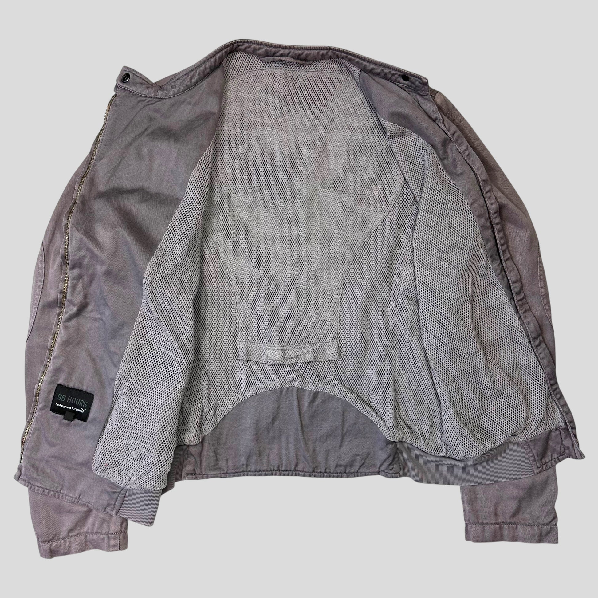 Very rare Neil Barrett for Puma 2002 dusty purple cotton biker jacket, incredible detailing with asymmetrical zips on the front used to access hidden pockets and open the jacket, mesh lined with a huge crazy velcro pocket on the back, accordion style padded material at the sides and lower back.