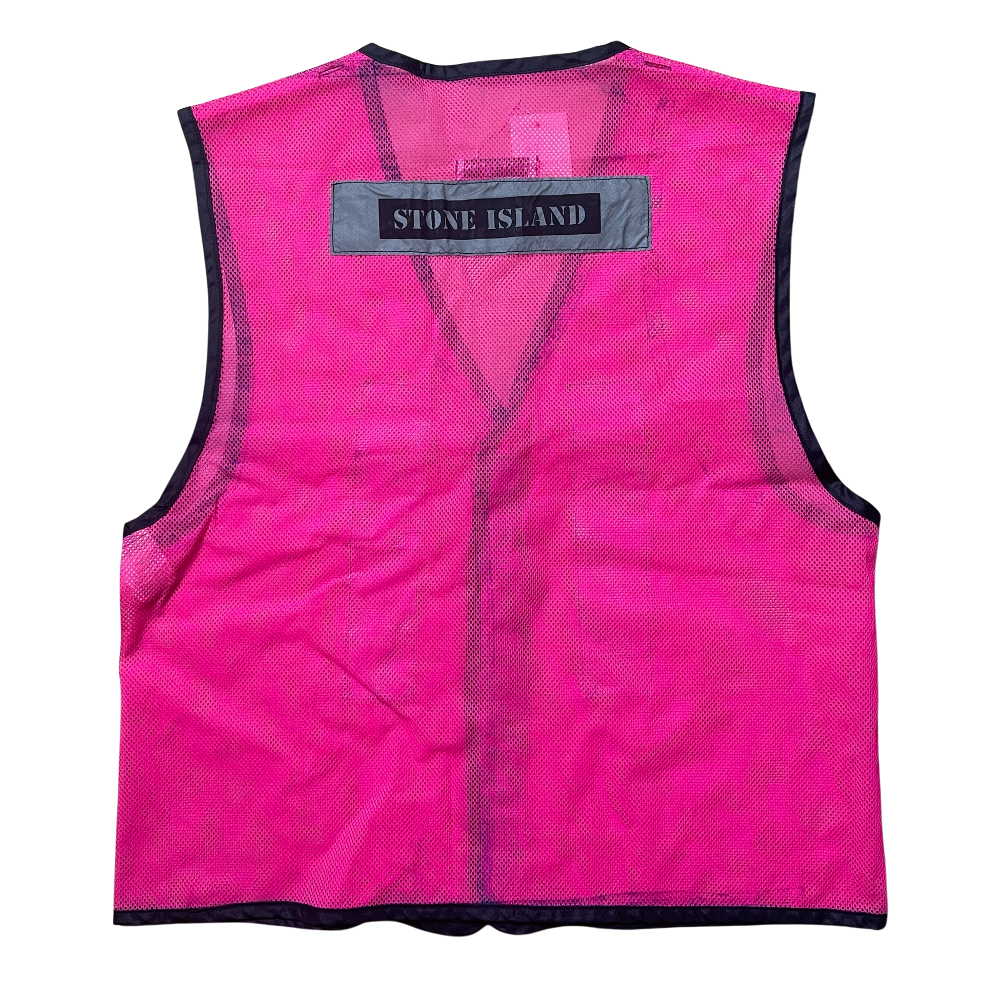 Designed by Massimo Osti in a cotton polyamide mesh material. Featuring vertical reflective panelling to front, an upper back reflective stencil spell out panel. Velcro fastening in a magenta pink colour.