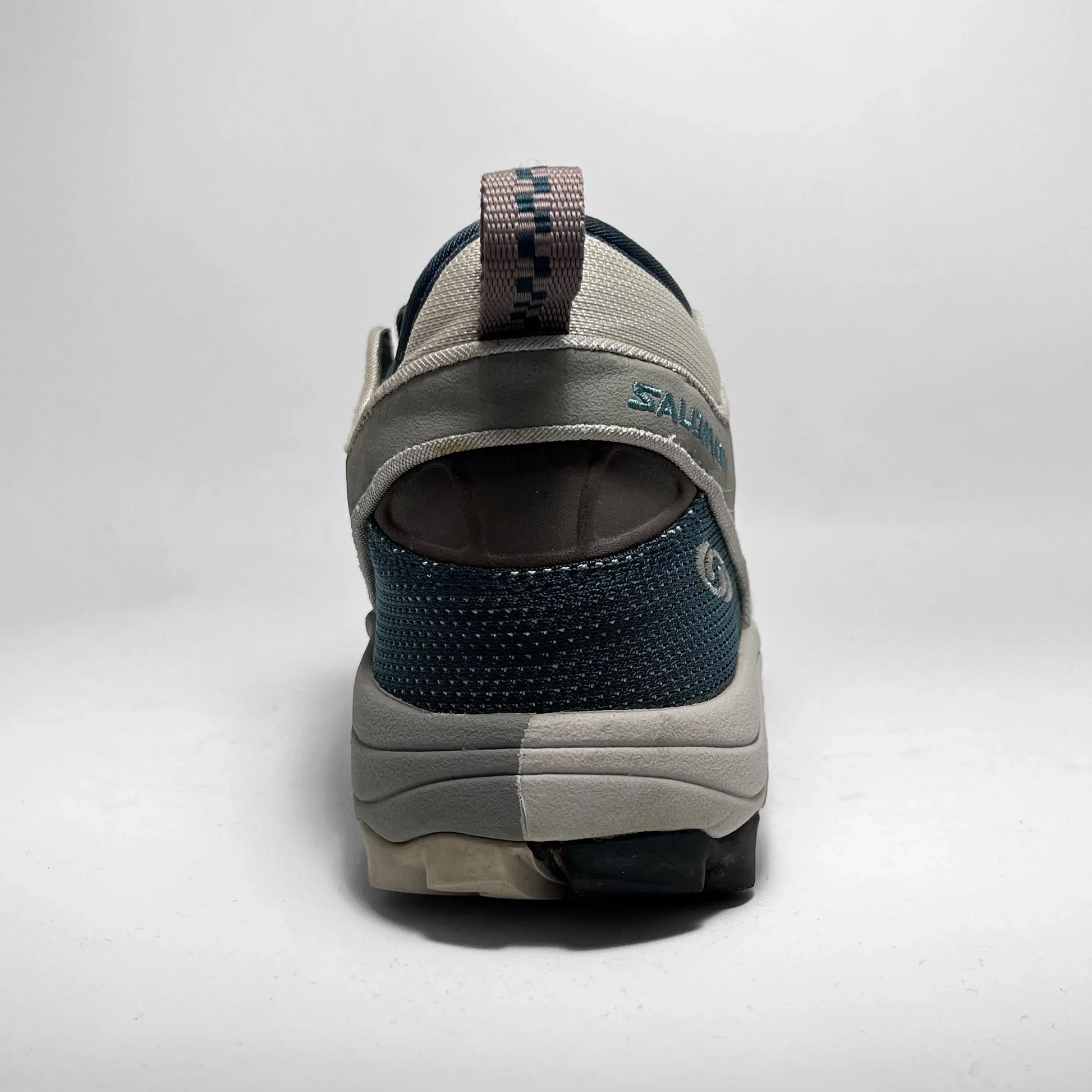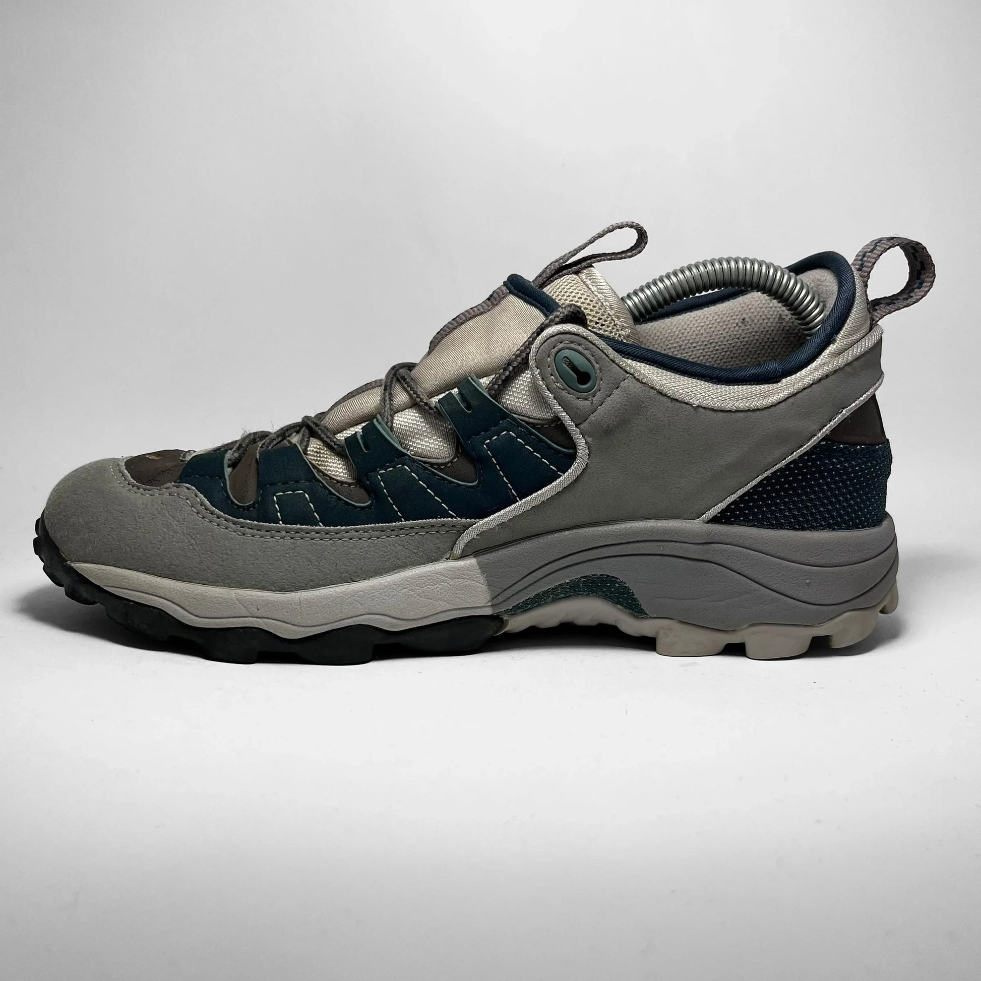 The Salomon Raidrace from 2001 is a rugged mid-cut trail shoe designed for stability and comfort on varied terrain. It features a mixed-material upper with grey suede, durable mesh, and navy textile overlays for structural support. The shoe incorporates Salomon’s Advanced Chassis system for enhanced motion control and cushioning, along with a protective toe cap and aggressive lugged outsole for reliable traction.