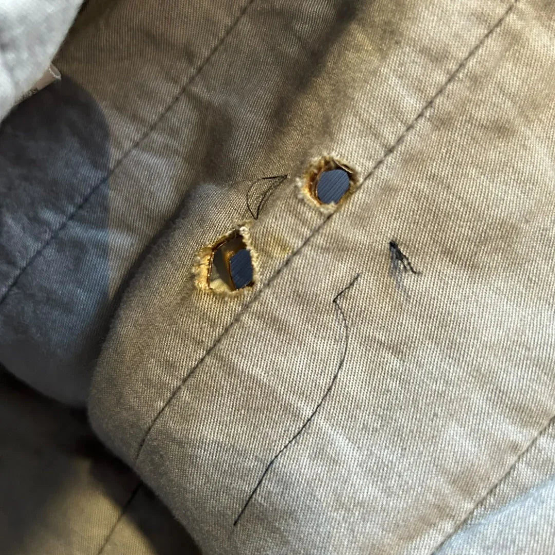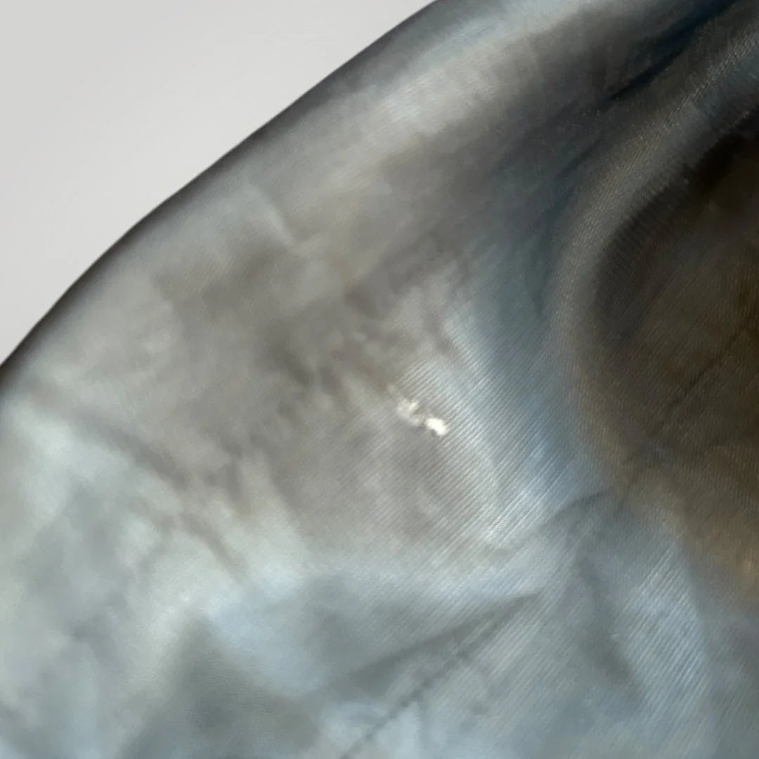 • Generally good condition for its age but due to the frangile duel later there is a few small pulls and pin holes, as shown in the pictures. Also has a burn on the inner lining. Neither are noticeable when worn