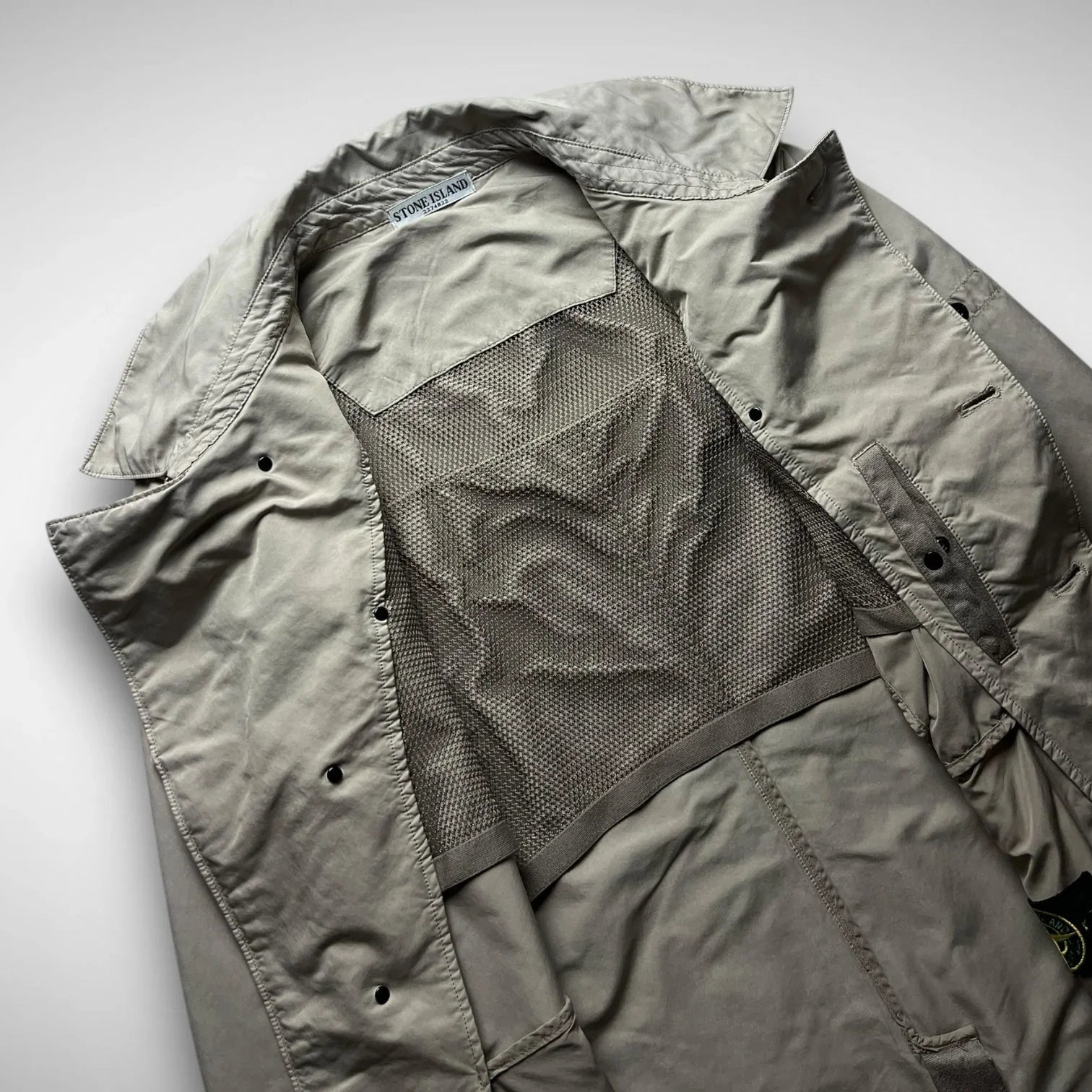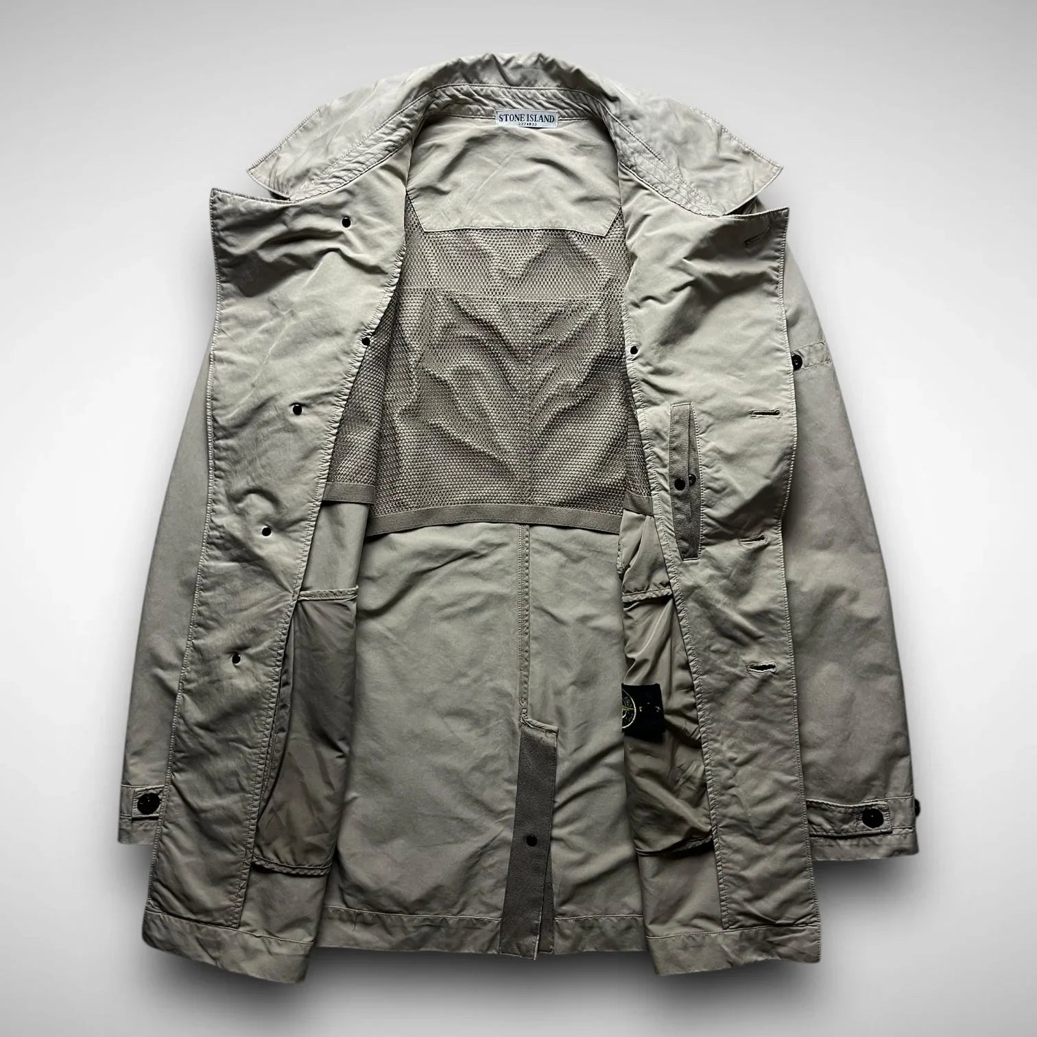 Constructed from Japanese polyester/polyamide fabric, the coat undergoes a heat-induced compression process at 130°C, giving it a uniquely structured and tactile finish. This model features classic trenchcoat elements like epaulettes, angled flap pockets, and a concealed placket, while maintaining a clean, technical silhouette. The mesh lining ensures breathability, and the signature removable compass badge on the sleeve completes the design.