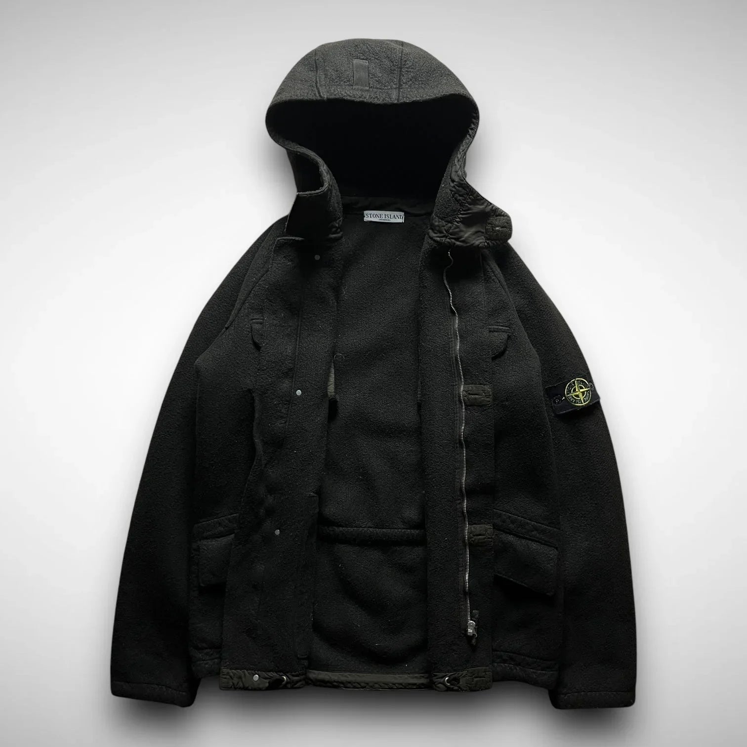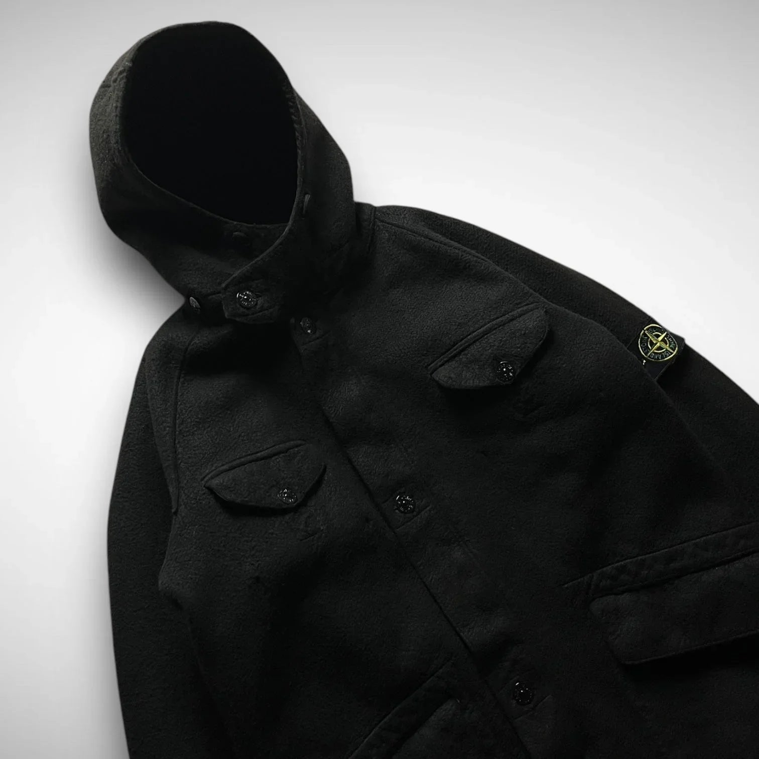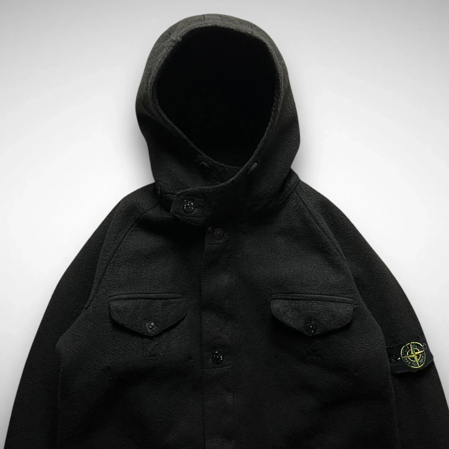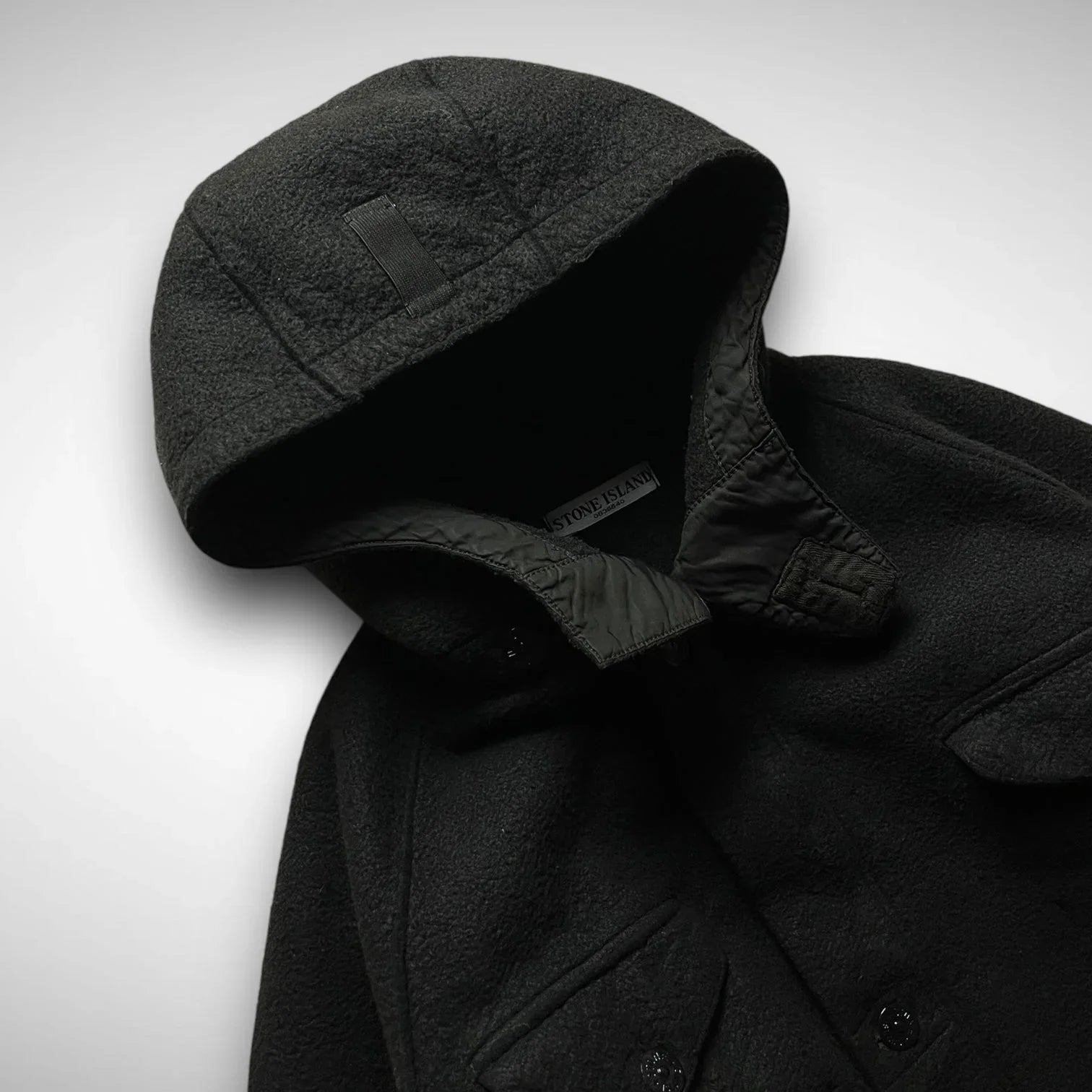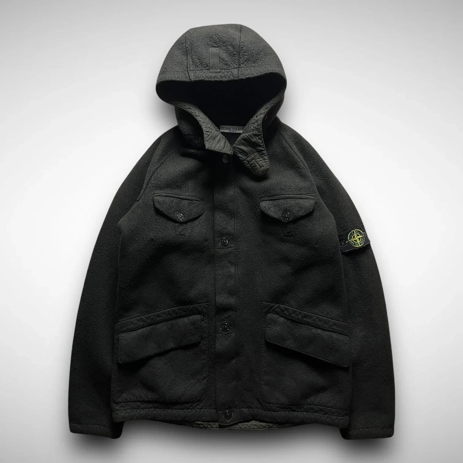 The jacket features a structured silhouette with a hood that includes a buttoned throat latch, raglan sleeves for enhanced mobility and reinforced stitching throughout, two chest flap pockets and two larger lower flap pockets, and signature Stone Island badge.
