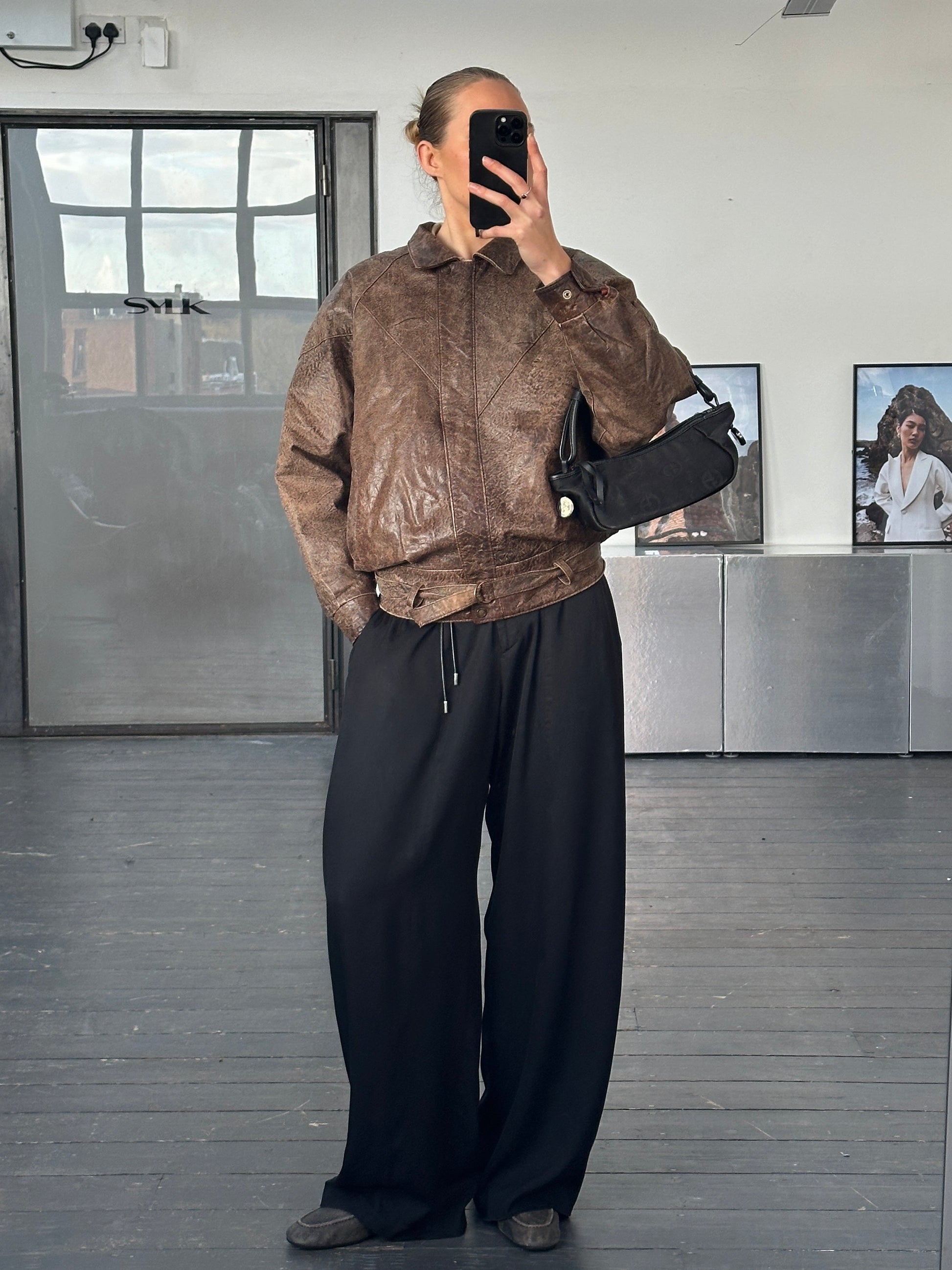 Vintage 1980s leather jacket featuring a concealed front placket and sculpted silhouette with a broader chest and cinched waist. Designed with shoulder pads and an adjustable belt to emphasise shape. Finished in richly patinated brown leather with natural wear throughout.