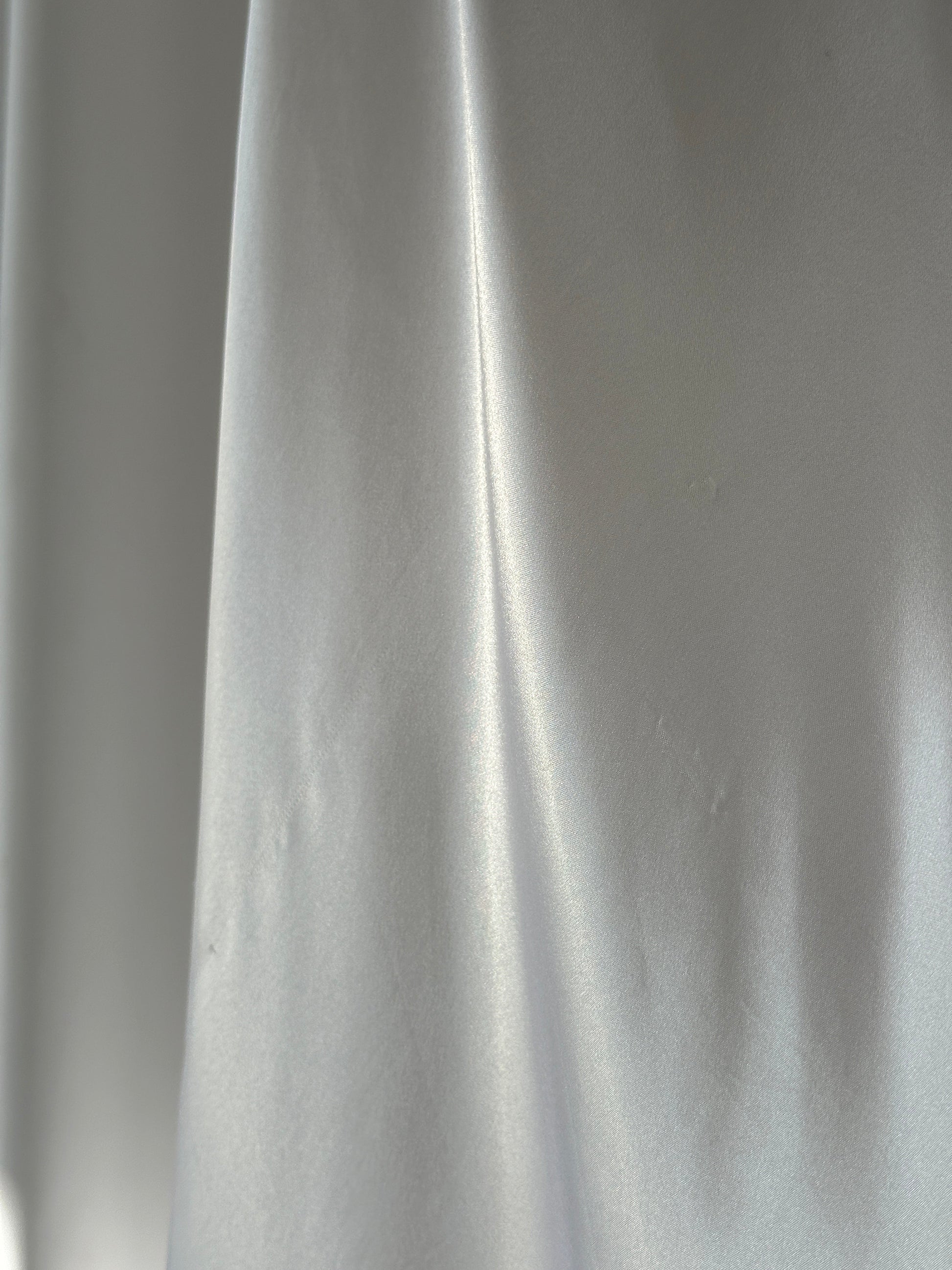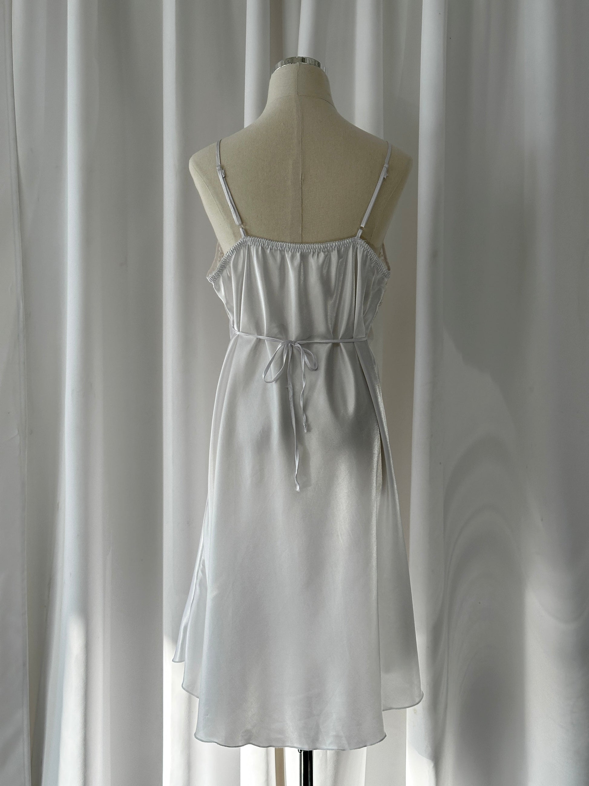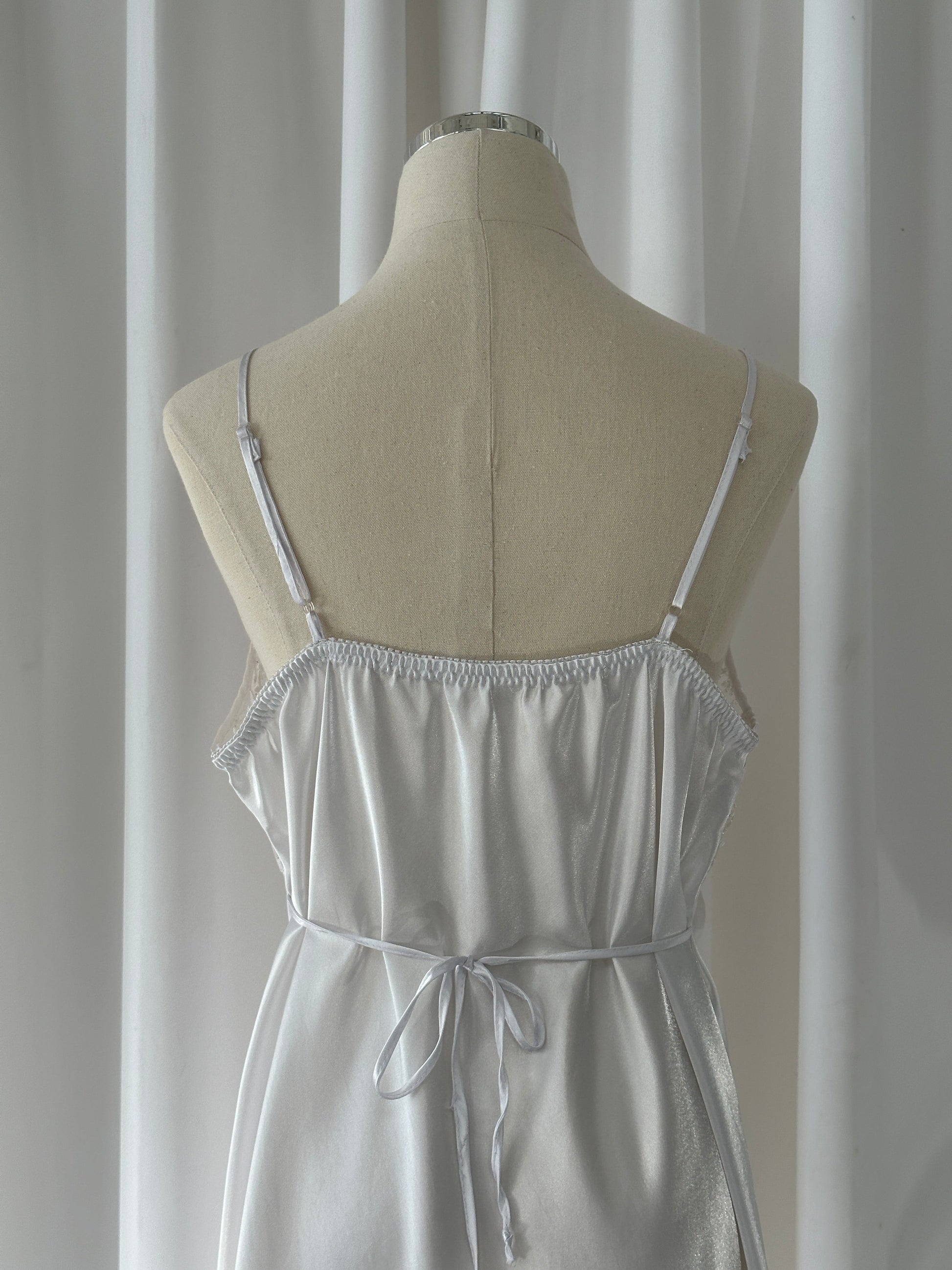 A vintage satin slip with floral embroidered mesh bust and fluid drape, blending elegance and allure.