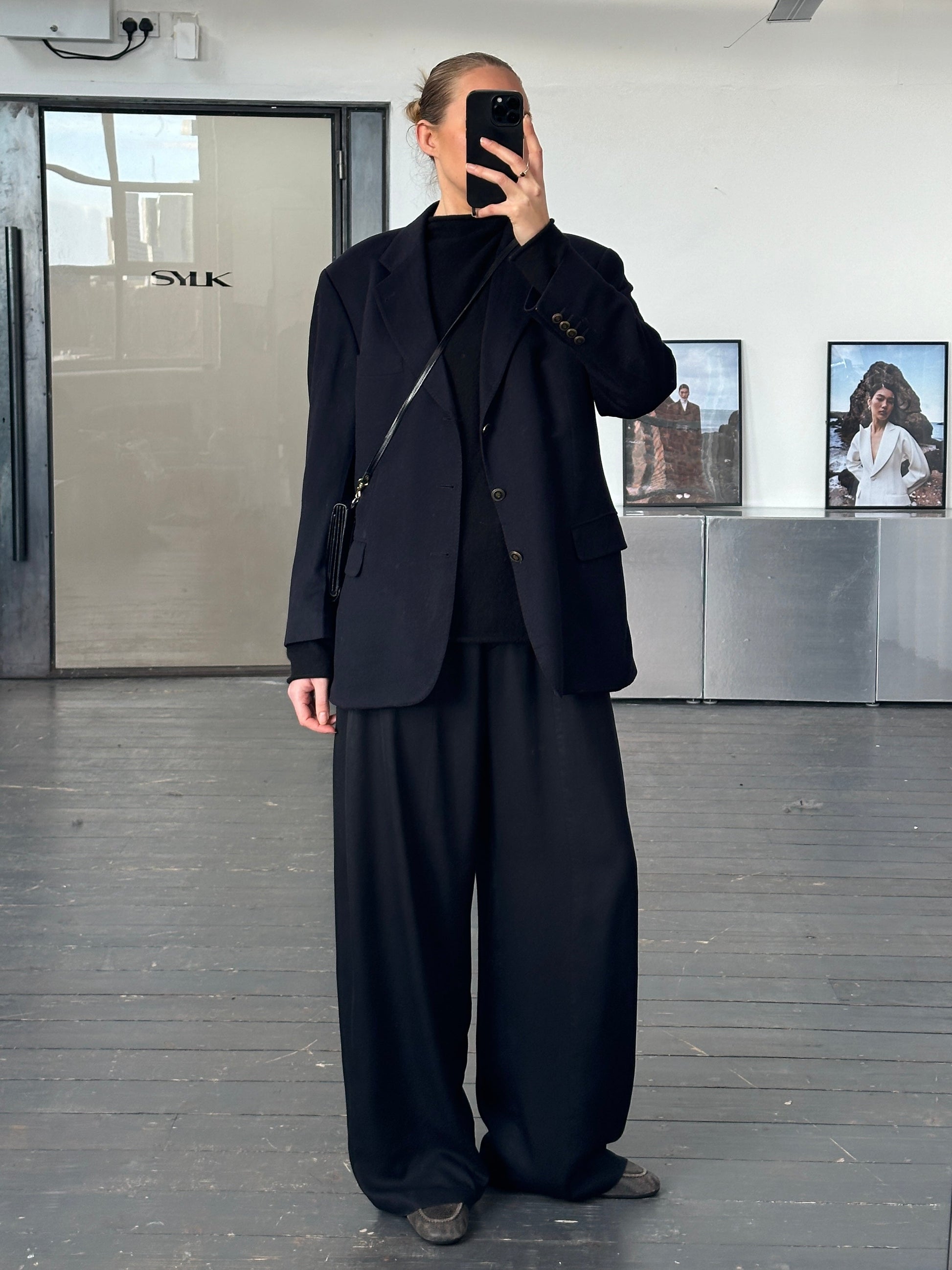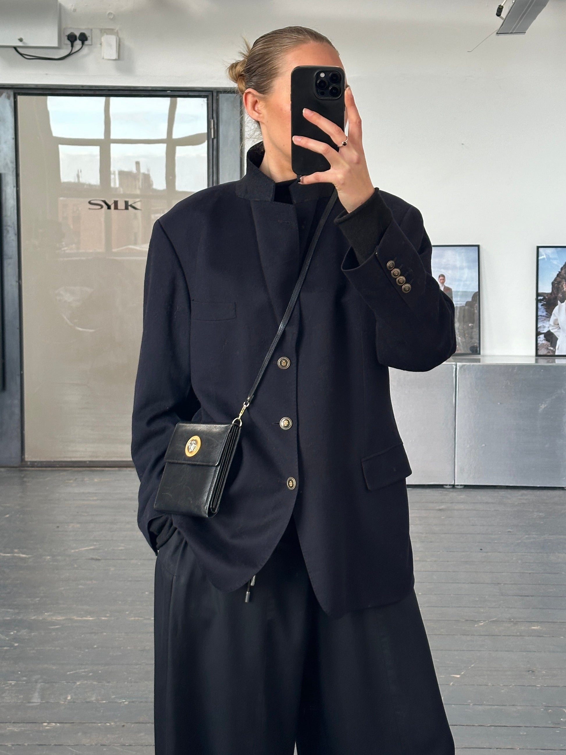 A vintage 1990s Bonacelli single breasted blazer in a deep navy tone. Cut in pure cashmere with a relaxed silhouette and refined bespoke buttons detailing.
