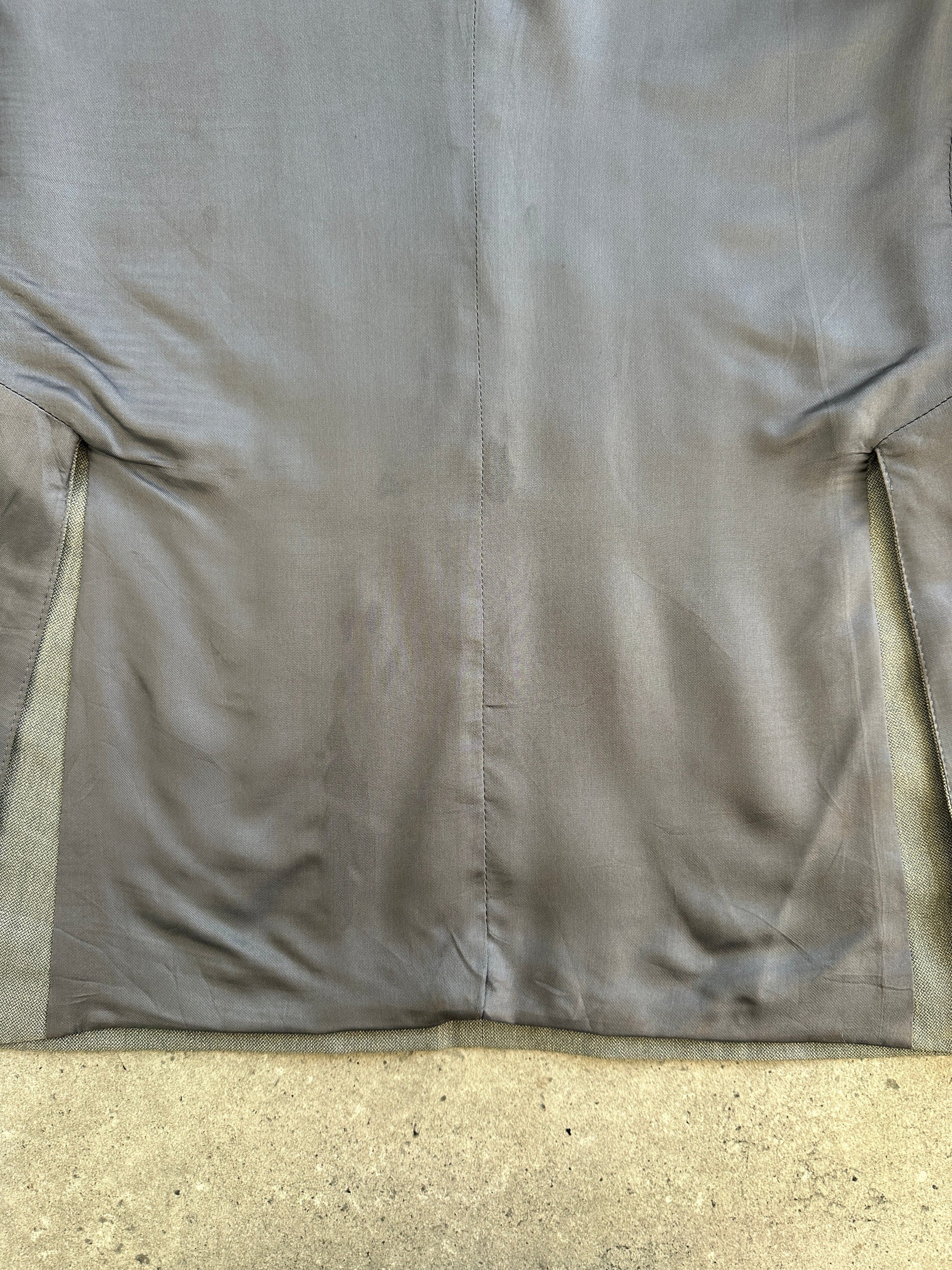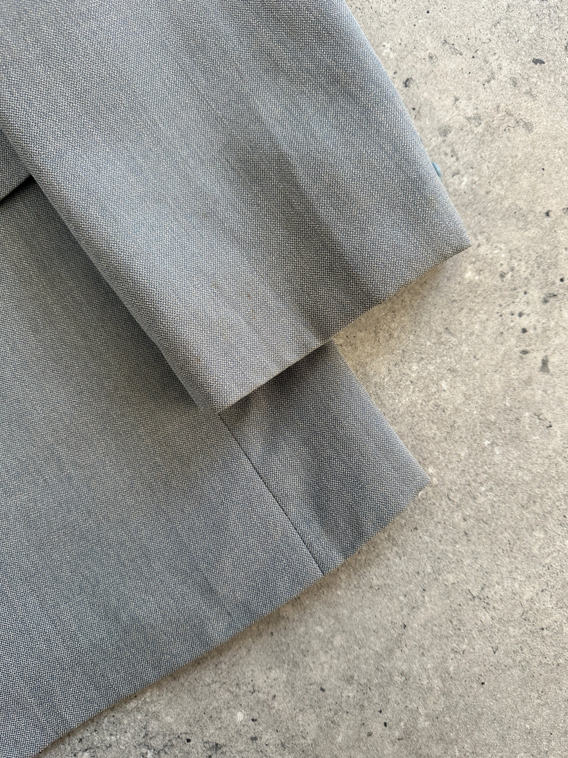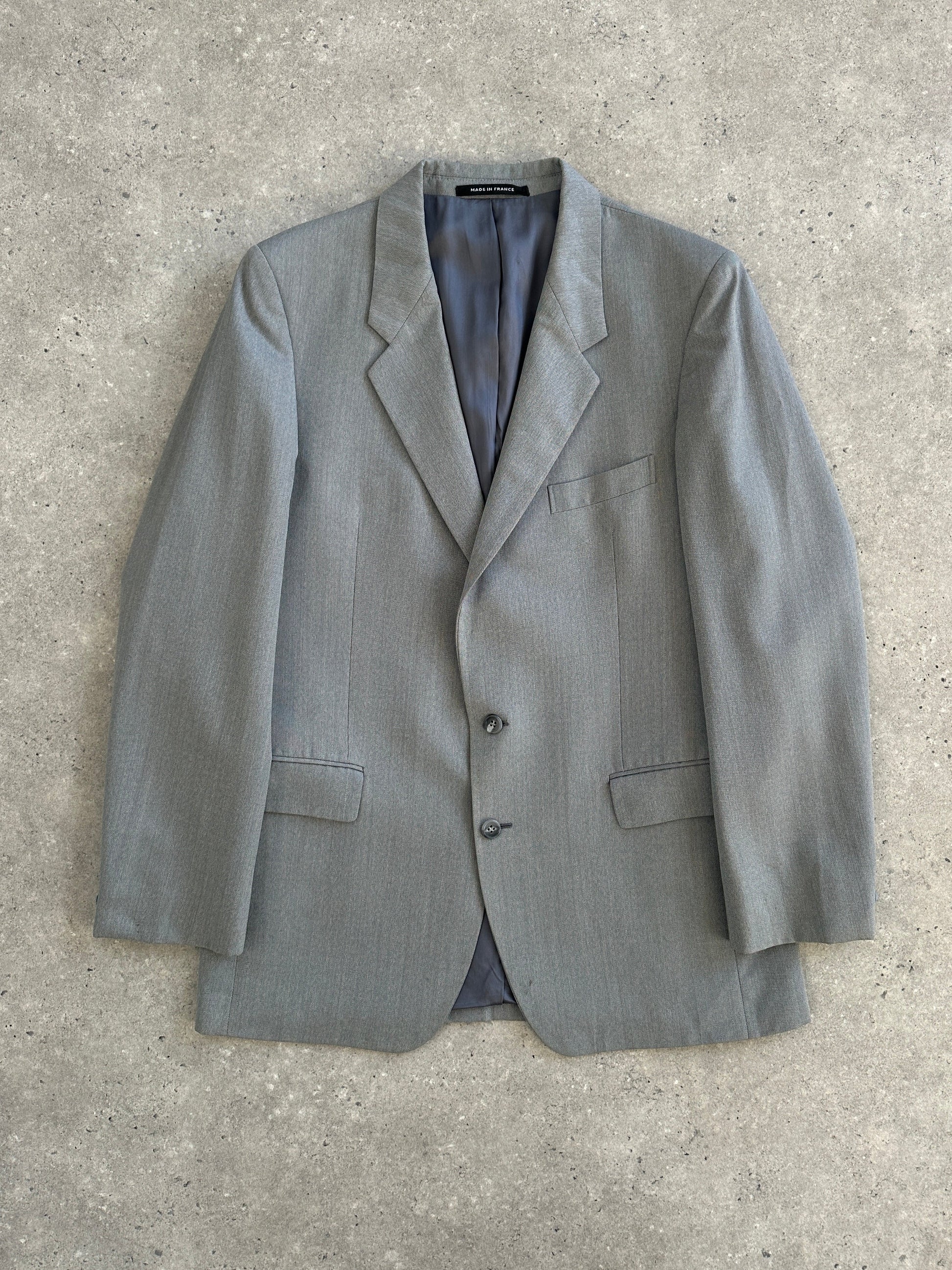 A vintage 1990s Yves Saint Laurent single breasted blazer in a soft light grey tone, produced in the French atelier. Crafted in pure wool with refined tailoring, this is a sought-after example of early YSL menswear construction.