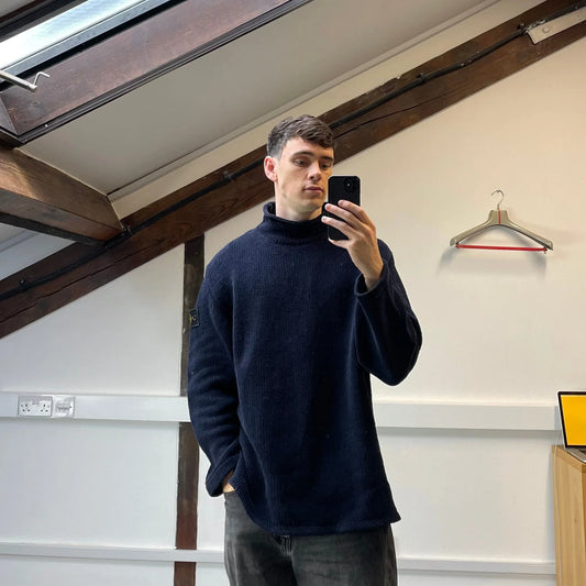 Stone Island Navy Chenille Knit Knit Jumper w/ Green Edge Badge AW98