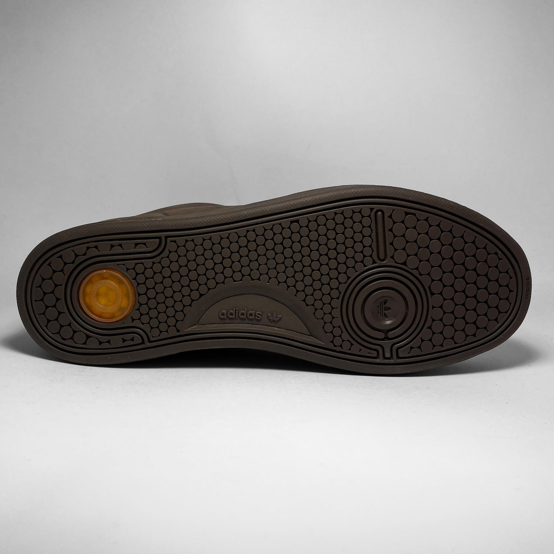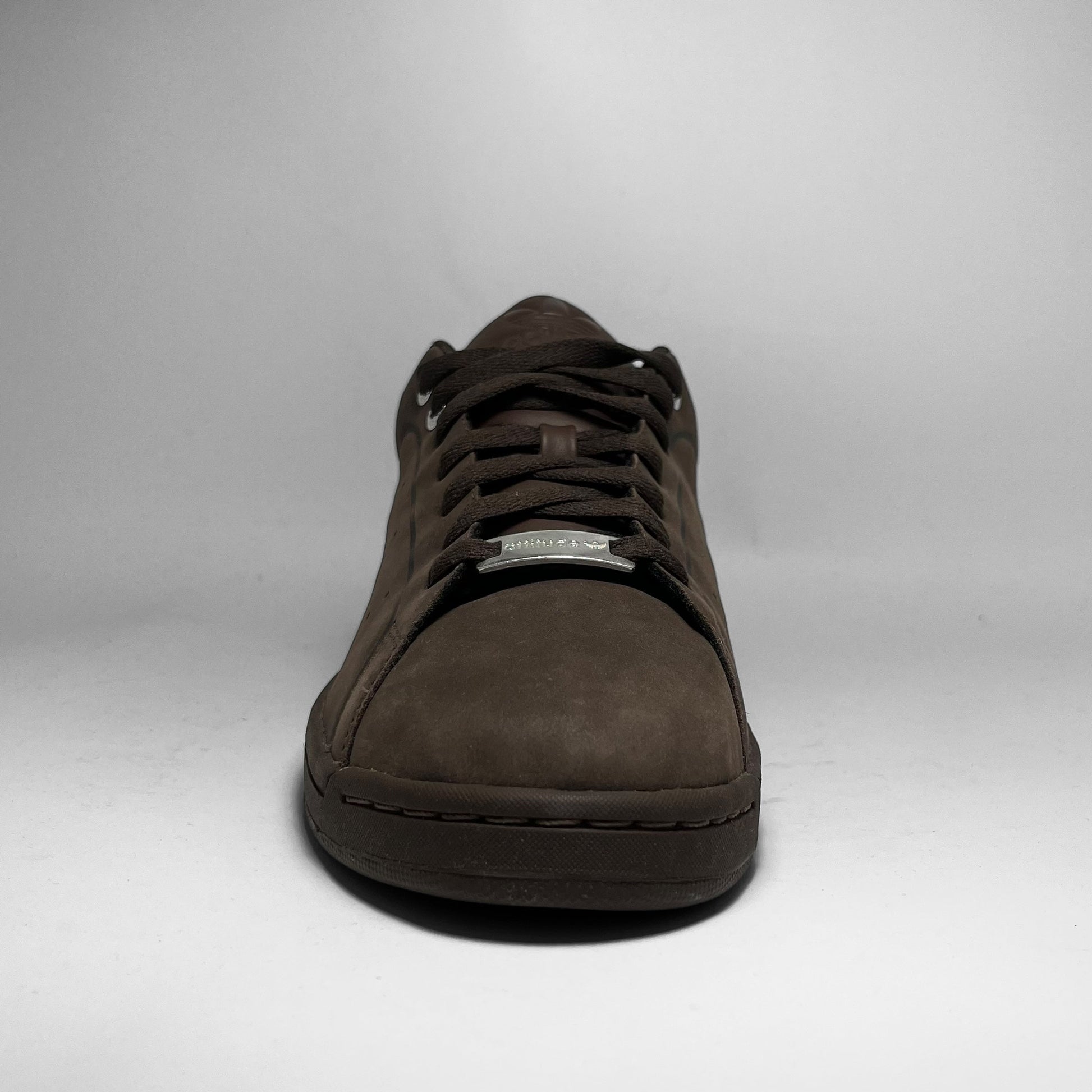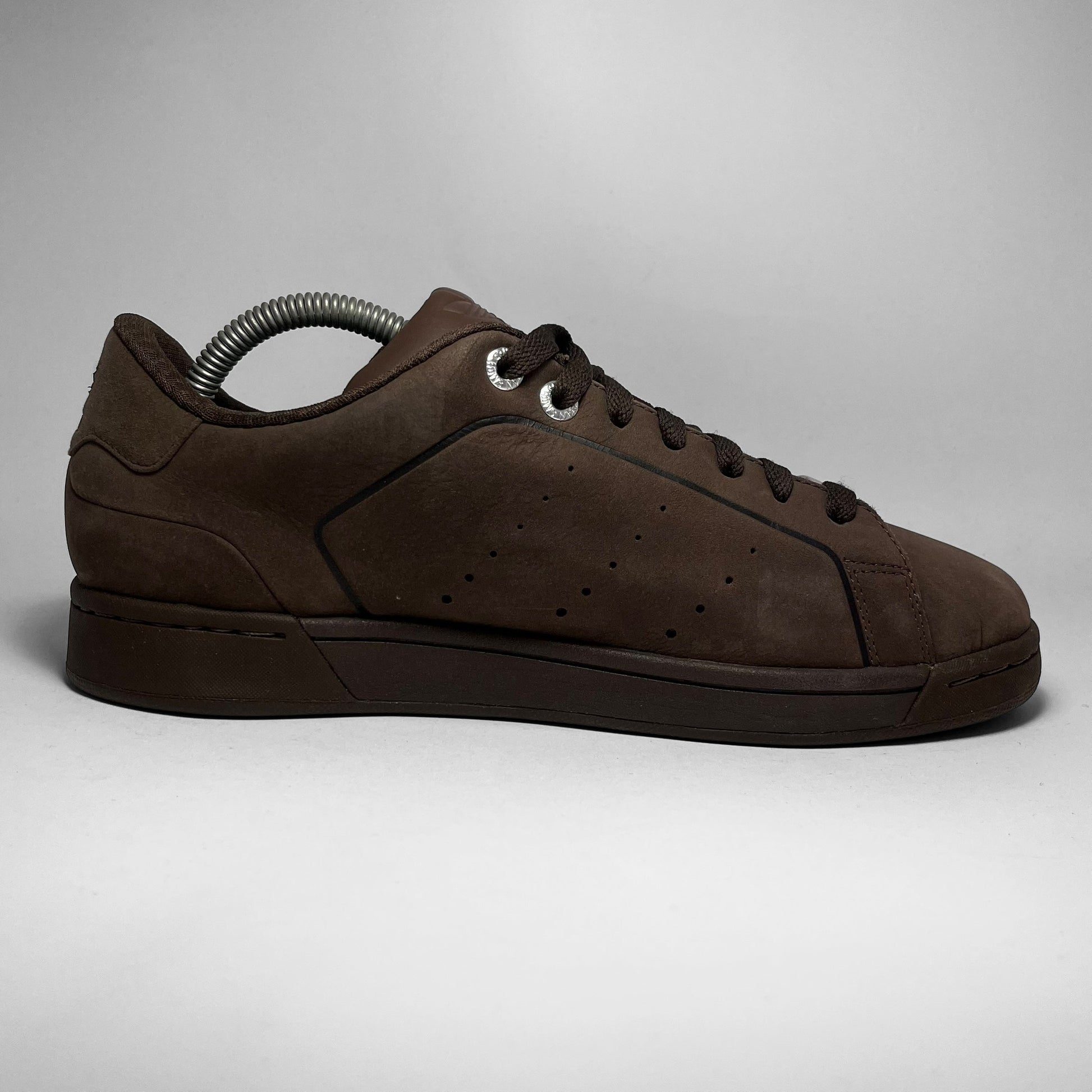 An unreleased early-2000s sample constructed from premium matte brown leather, the pair features metal eyelets and engraved metal lace stays reading “Adidas” and “Attitude.” Subtle perforations replace the traditional 3-Stripes, tonal stitching and rubber sole with Adiprene cushioning.