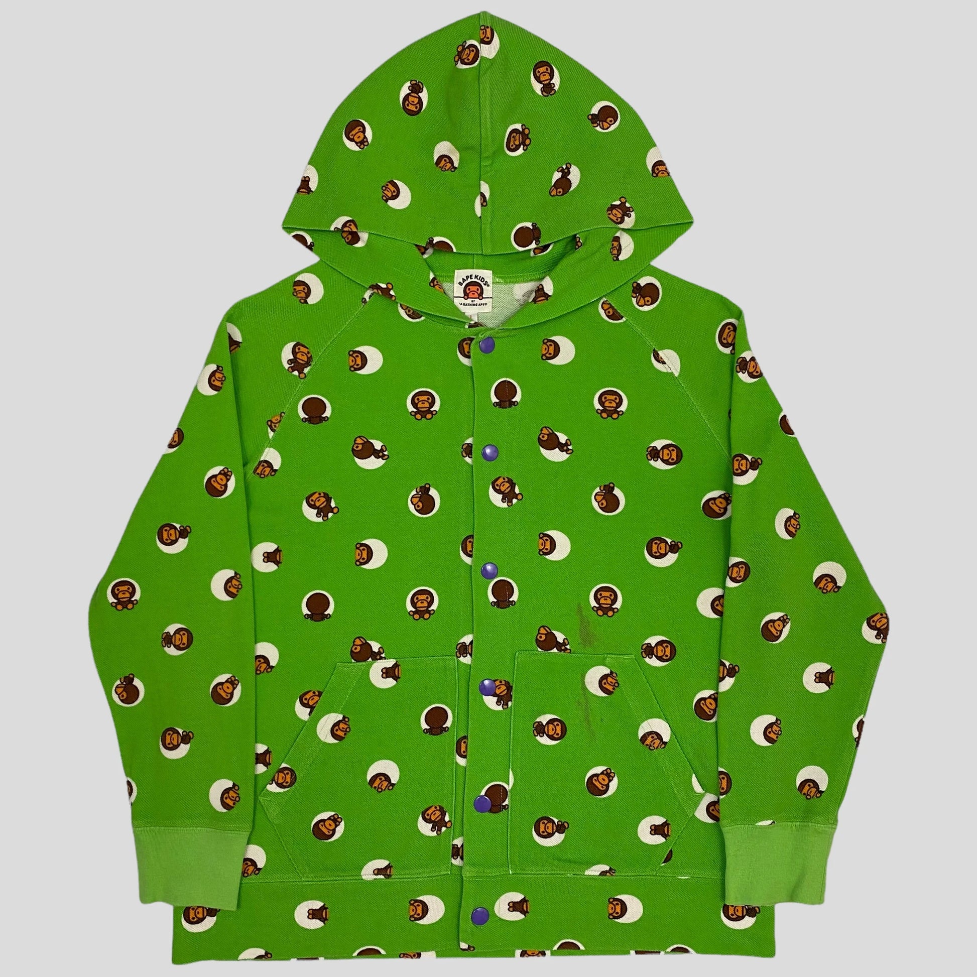 Rare Baby Milo Bape Kids line polka dot hide and seek polo hoodie, cute all over print with baby milo throughout, lime green polo material with a button up instead of zip-up front. Made in Japan.