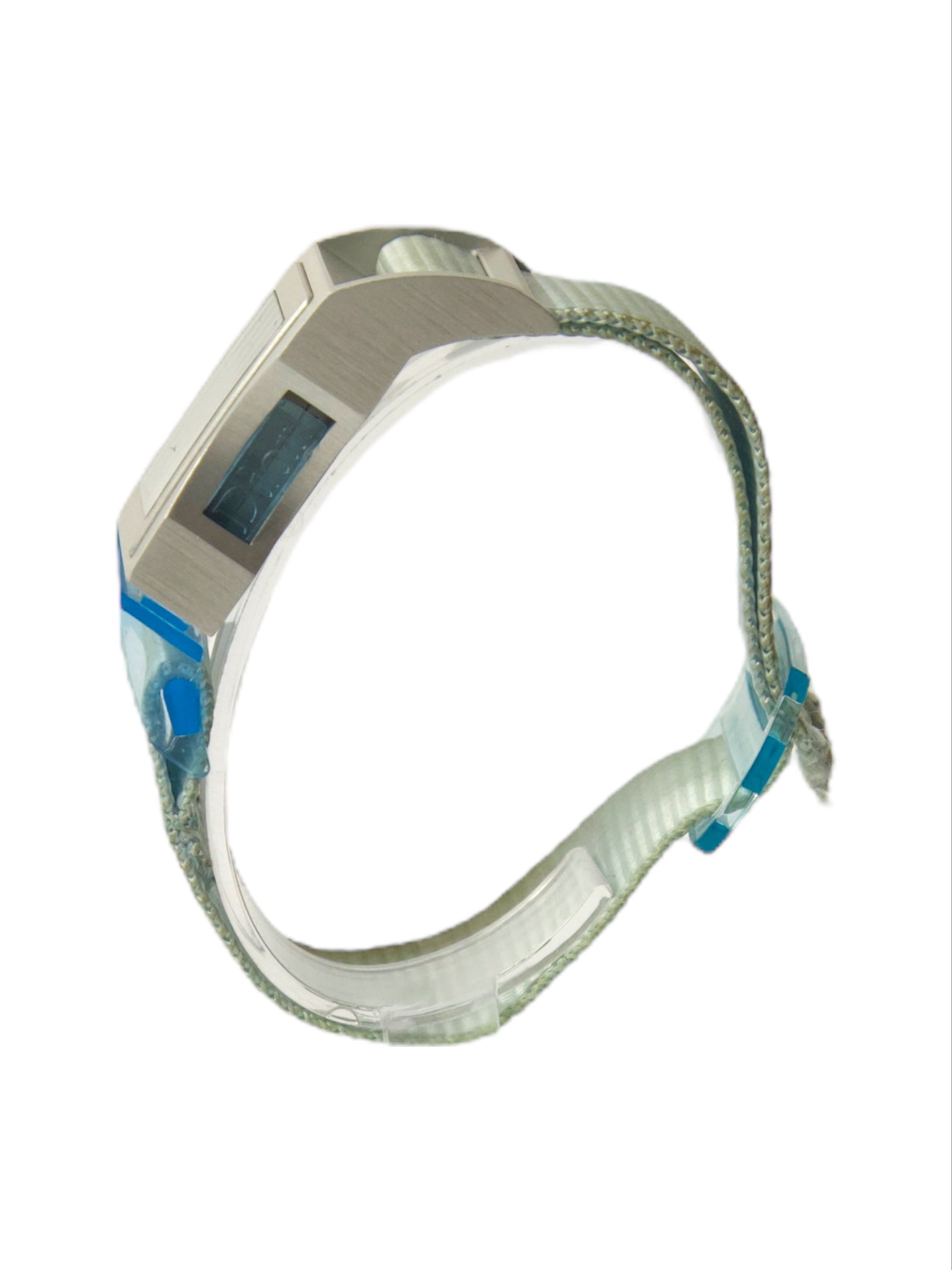 A sleek and understated Christian Dior D100 wristwatch, featuring a clean rectangular dial and minimalist time markers. Finished with a soft fabric strap in a pale green tone, this piece balances classic Dior refinement with a subtle utilitarian edge — an easy everyday watch that still feels special.