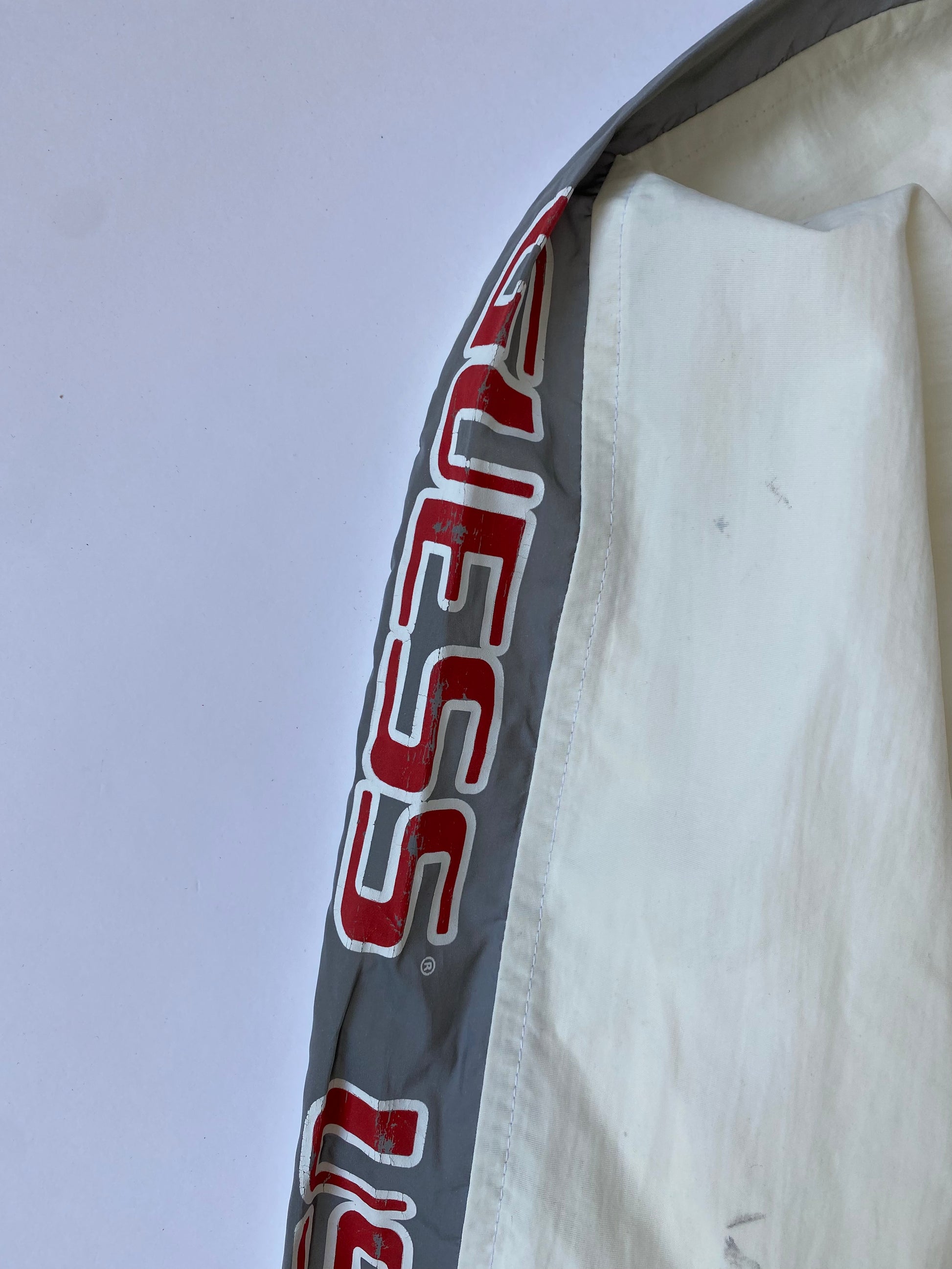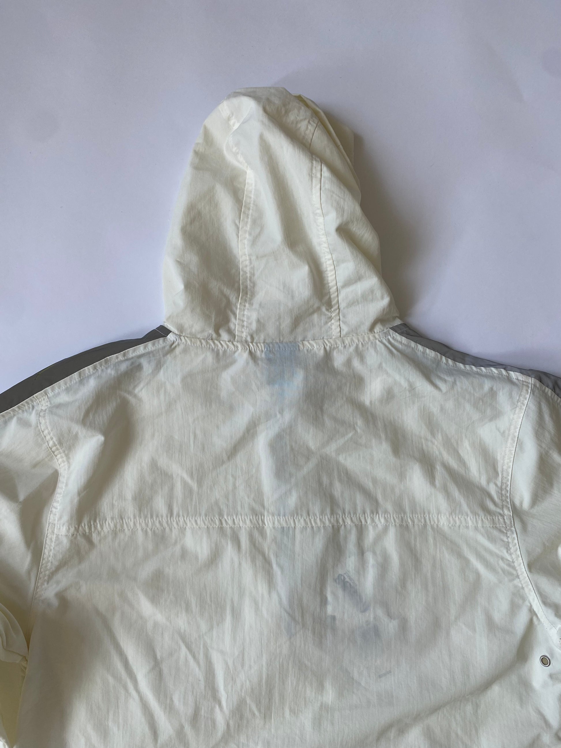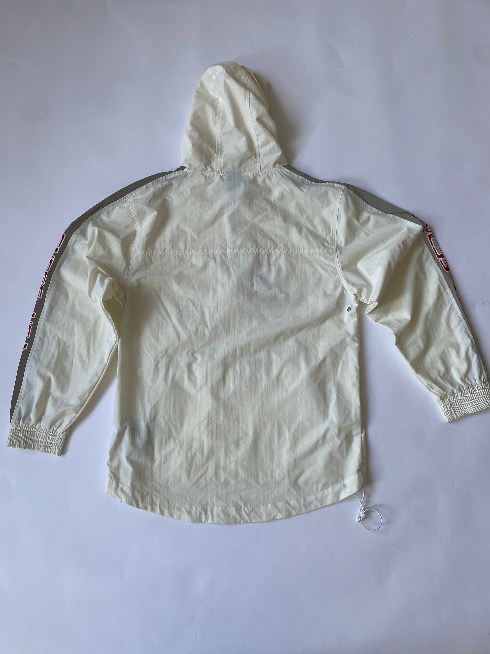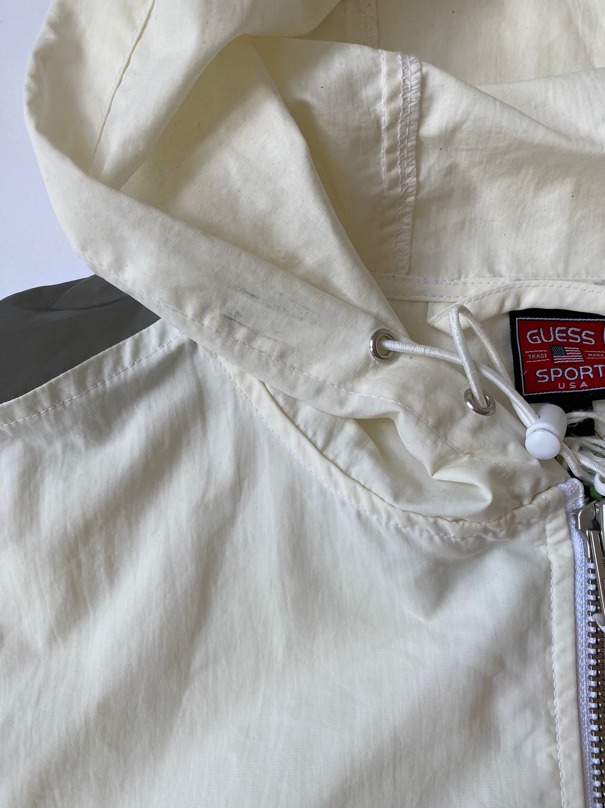 Guess Sport USA Hooded Quarter Zip. Nylon loose fitting Jacket, with GUESS USA logo printed down both sleeves on retroreflective sheeting. central pocket with zip and velcro detail. Adjustable elastic drawstring on hood and waist.