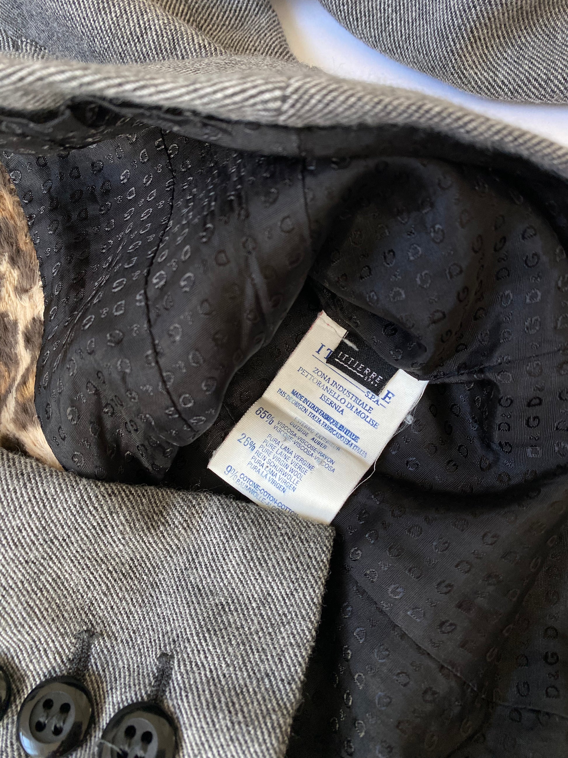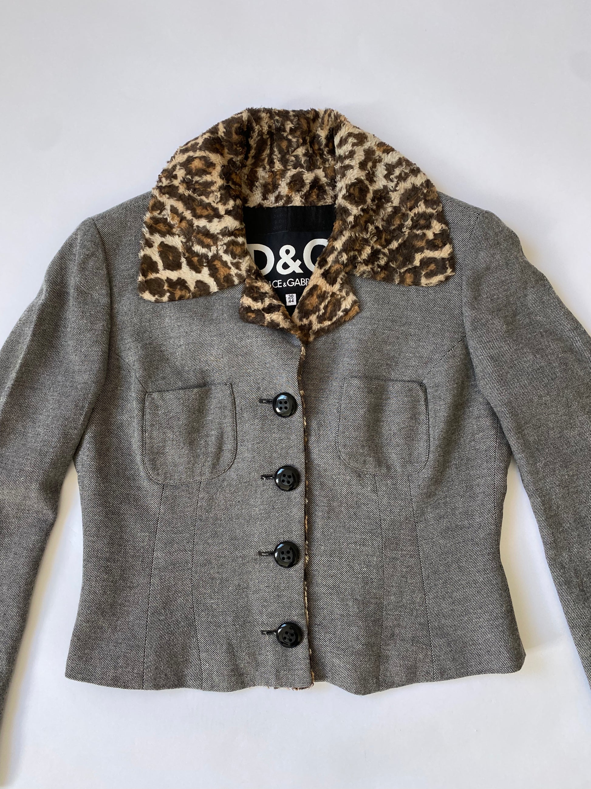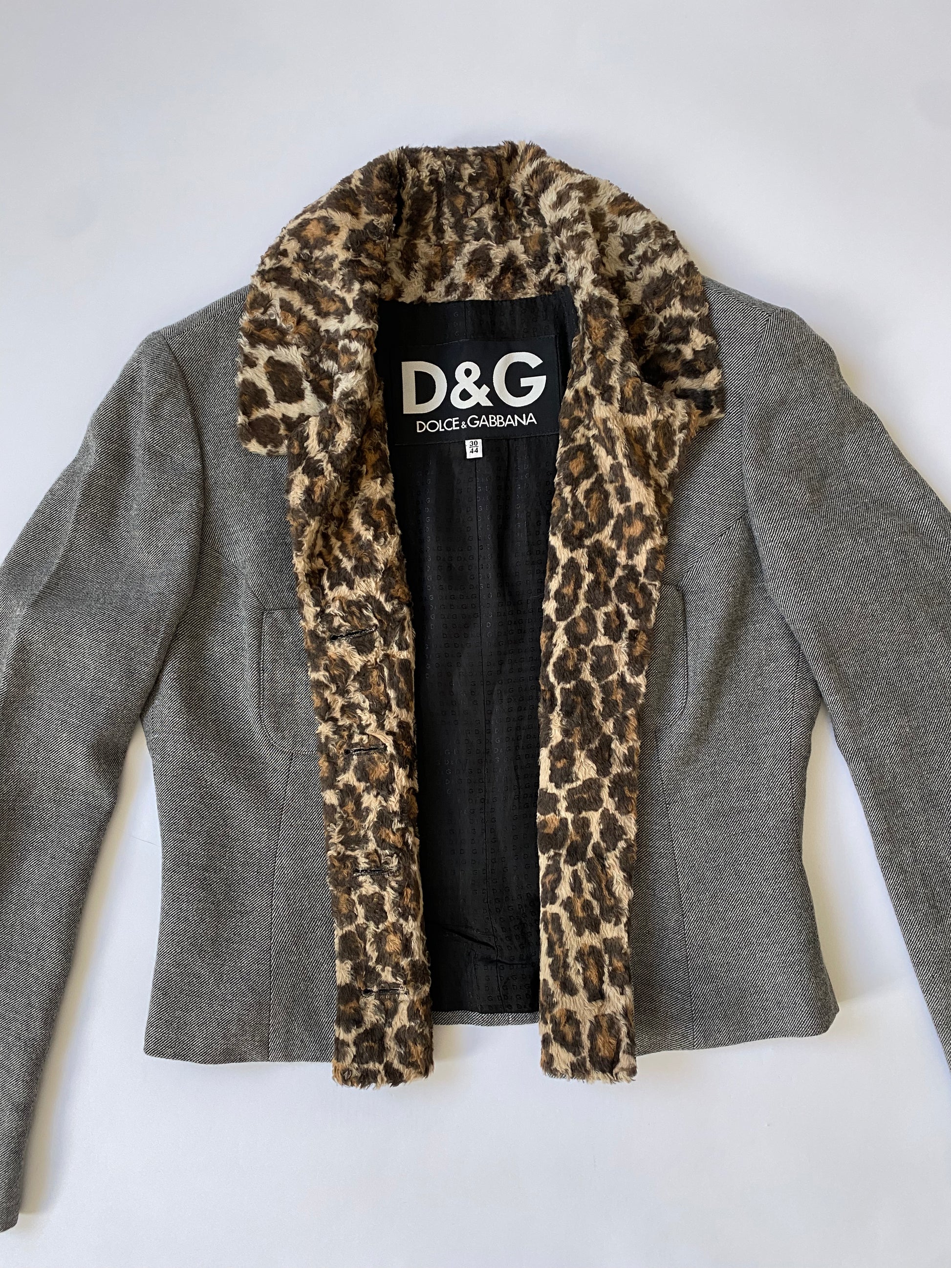 Dolce & Gabbana Leopard Print Cropped Blazer in Grey. Gorgeous grey blazer with a faux fur leopard print lined collar. Unique piece, with two small pockets on chest and leopard print strap on the back.