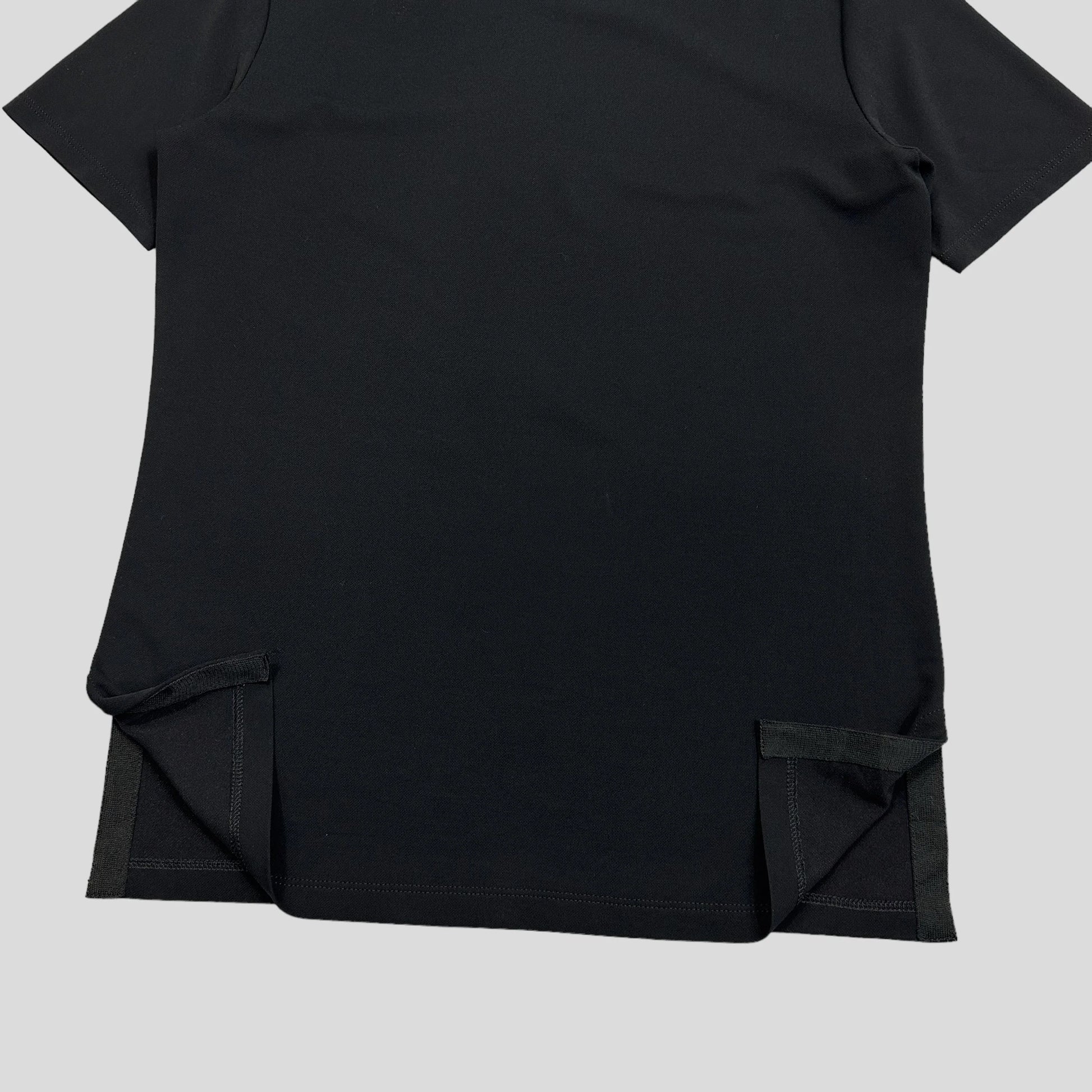 Rare Spring Summer 2001 Issey Miyake women’s jet black sport top, lovely polyester and nylon material with elastin to make it flattering and stretchy, side openings allow it to sit comfortably on your hips.