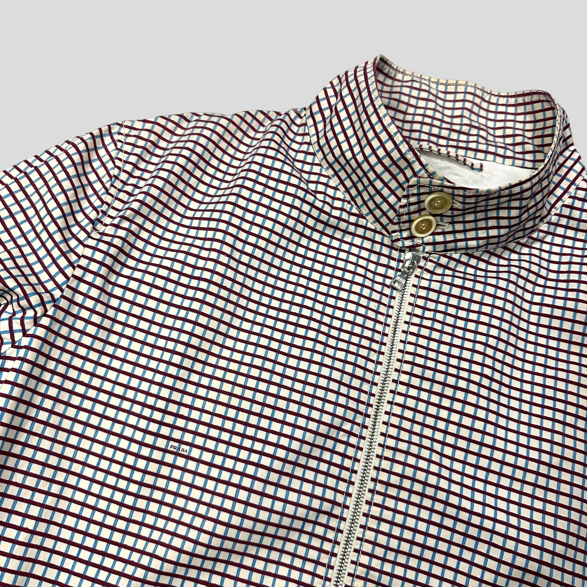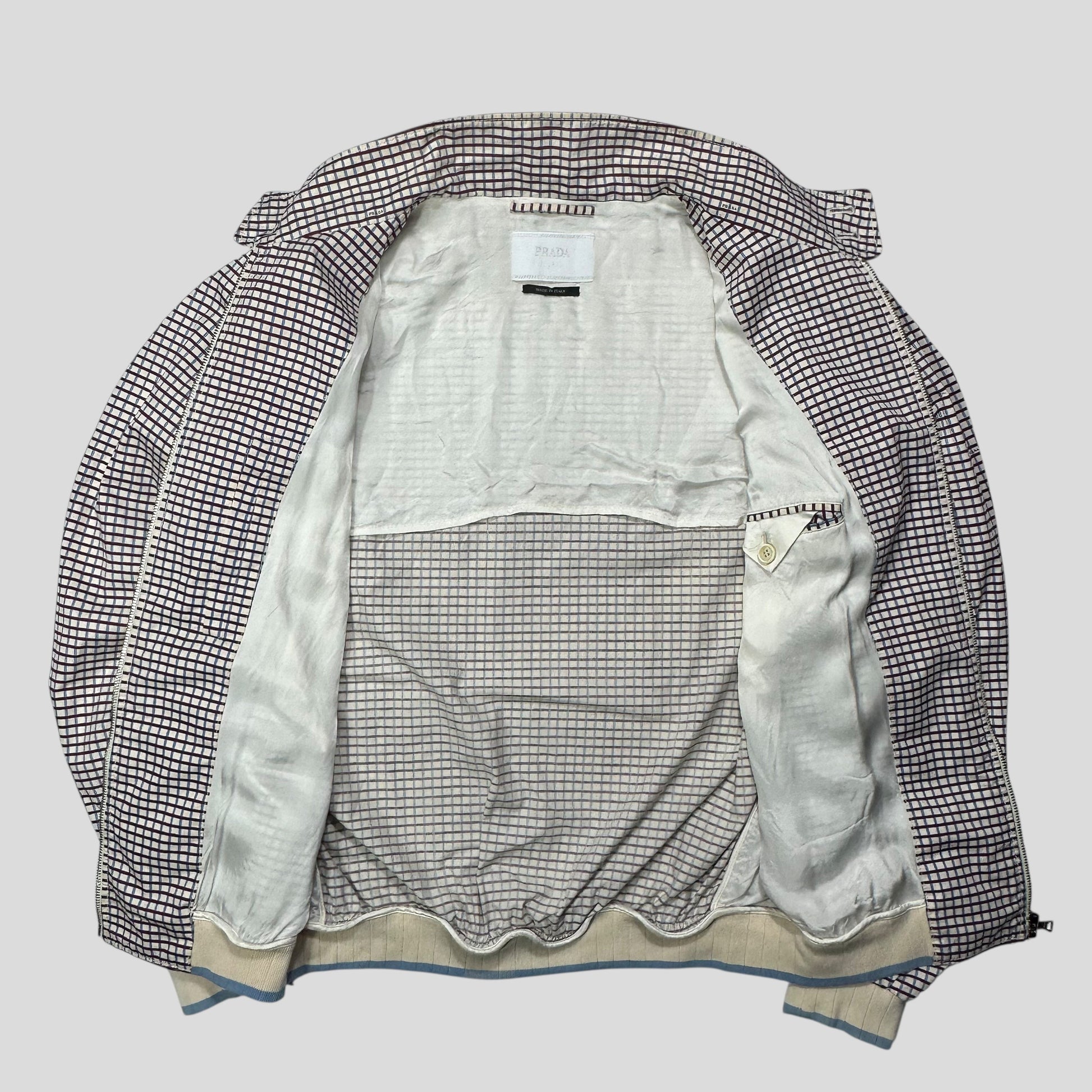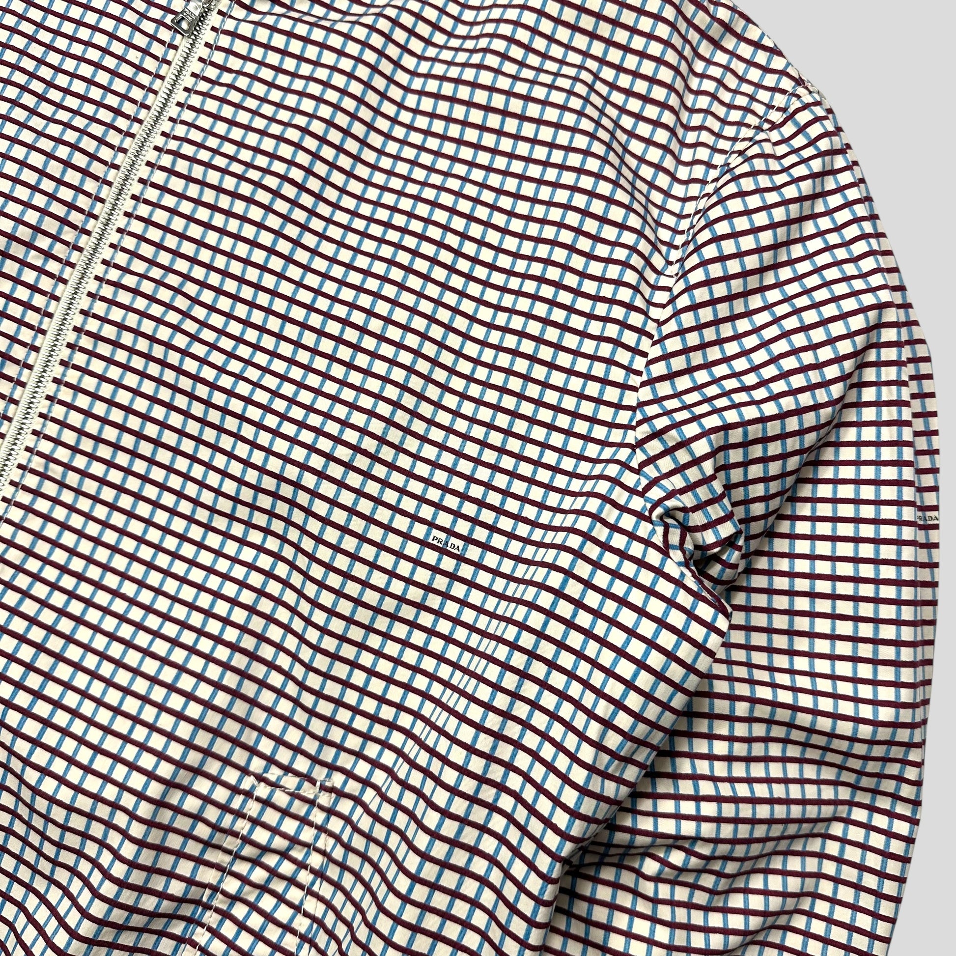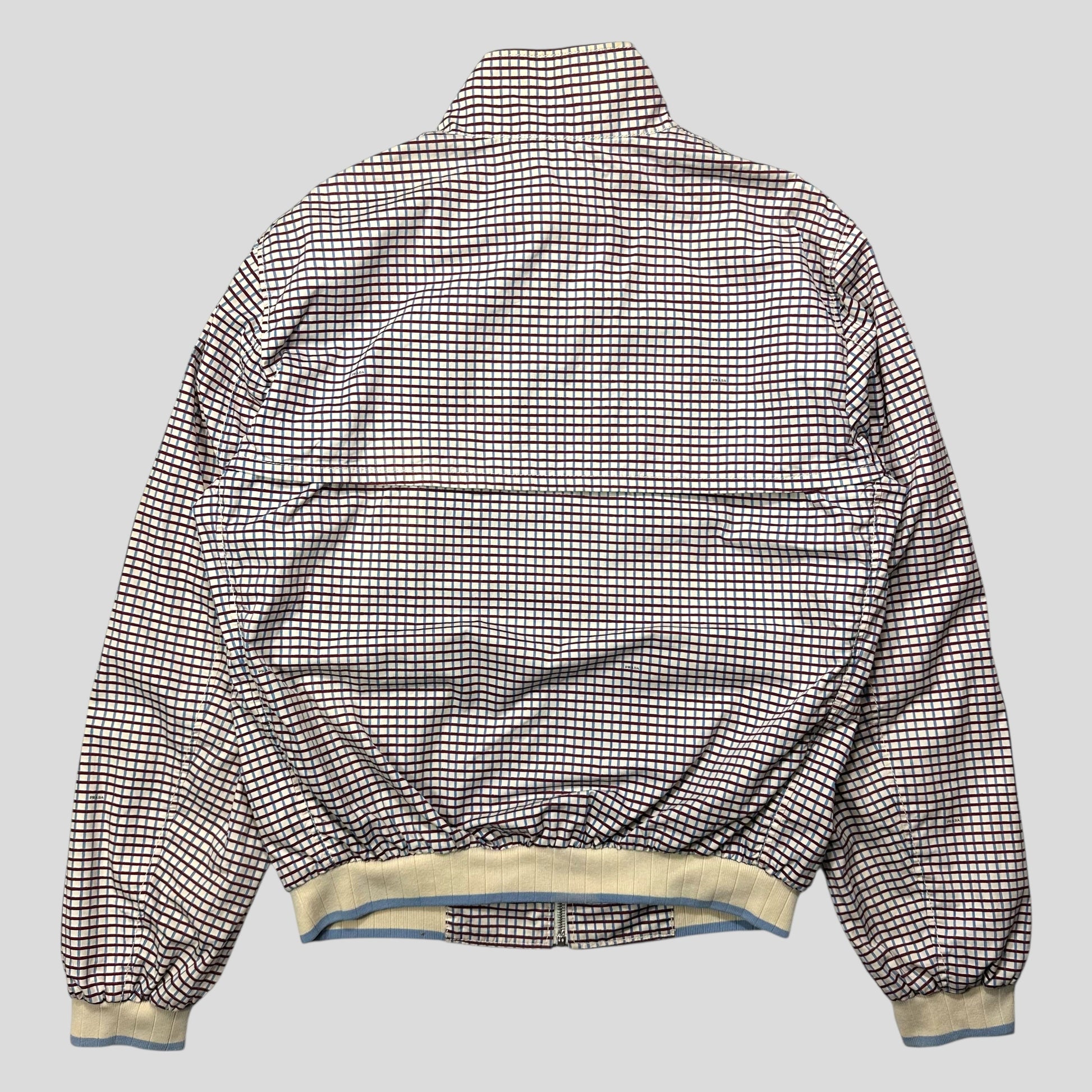 Extremely rare spring summer 2008 Prada Mainline Milano blue and burgundy checkered Harrington bomber jacket in a lovely white cotton grid check print, mini Prada logos are classily placed throughout the print, chunky cream and blue wool textured cuffs and hem, button collar, silky viscose lining with suit style pocket,  hand pockets to front.