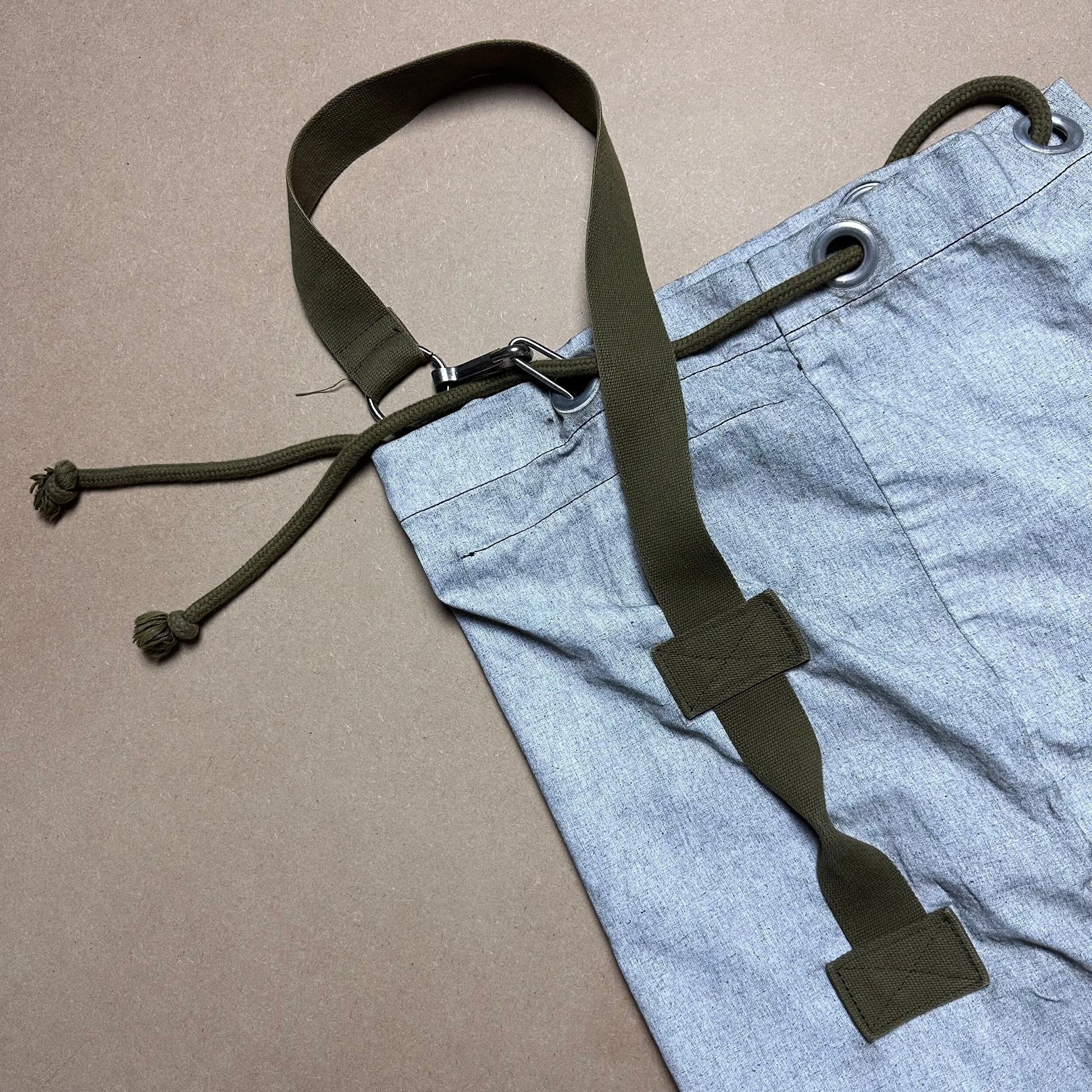 Designed by Massimo Osti. From the founding material of Stone Island brings this military based shoulder sling duffle sack. Bone / Military Green colour way. Stainless steel ringlets and hook. Heavy duty cotton canvas strap. Reflective panelling. Original tin buttons and badge.