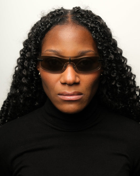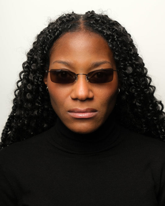 Gunmetal rimless wireframe, fitted with brown lenses (1995–2000). Made in Italy. Condition 8/10: frame in excellent condition, light wear on the lenses. Comes with its original case.