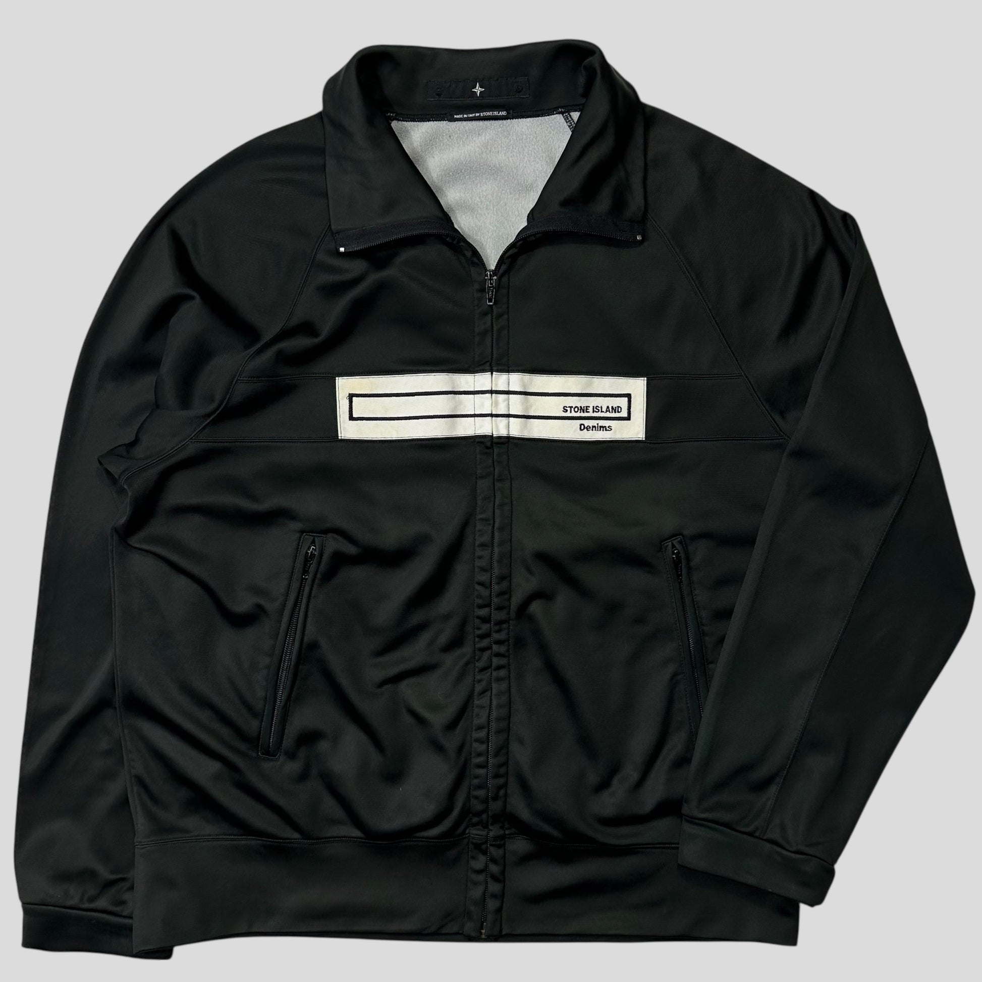 Rare stone island autumn winter 2004 denims range track jacket, made in Italy, black with white embroidered Stone Island Denims box logo to front, lightweight polyster track suit material.