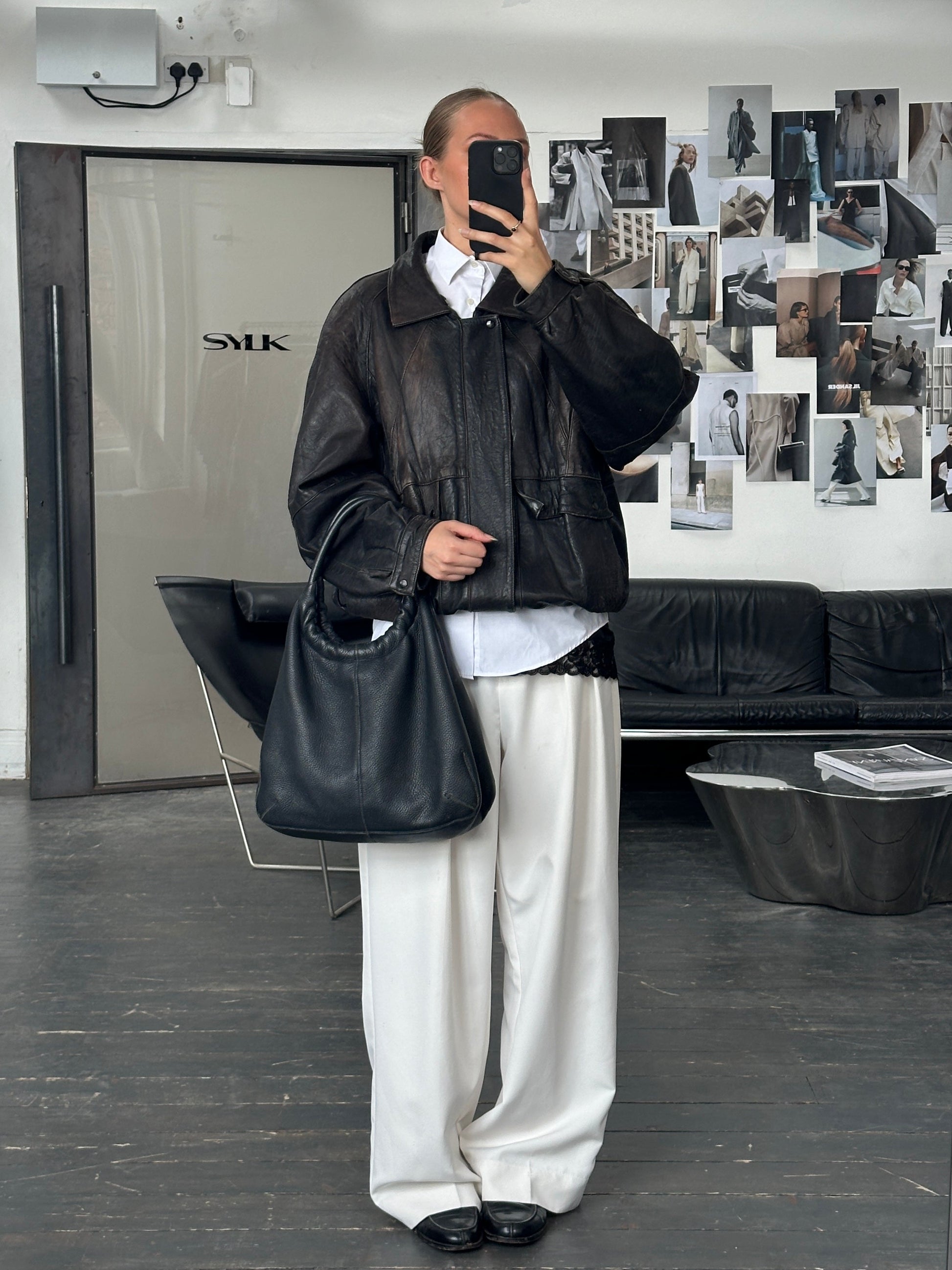 A timeless Italian leather jacket crafted in supple dark brown hide, cut in a relaxed bomber silhouette, this piece carries a rich patina that speaks to its late 1970s Italian craftsmanship.