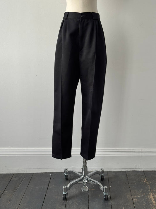 A black 1990s vintage trench coat in a structured nylon cotton blend with a smooth technical finish. Designed with a funnel neck, double zip front and adjustable waist belt, it falls to a streamlined knee length silhouette with clean minimal lines.