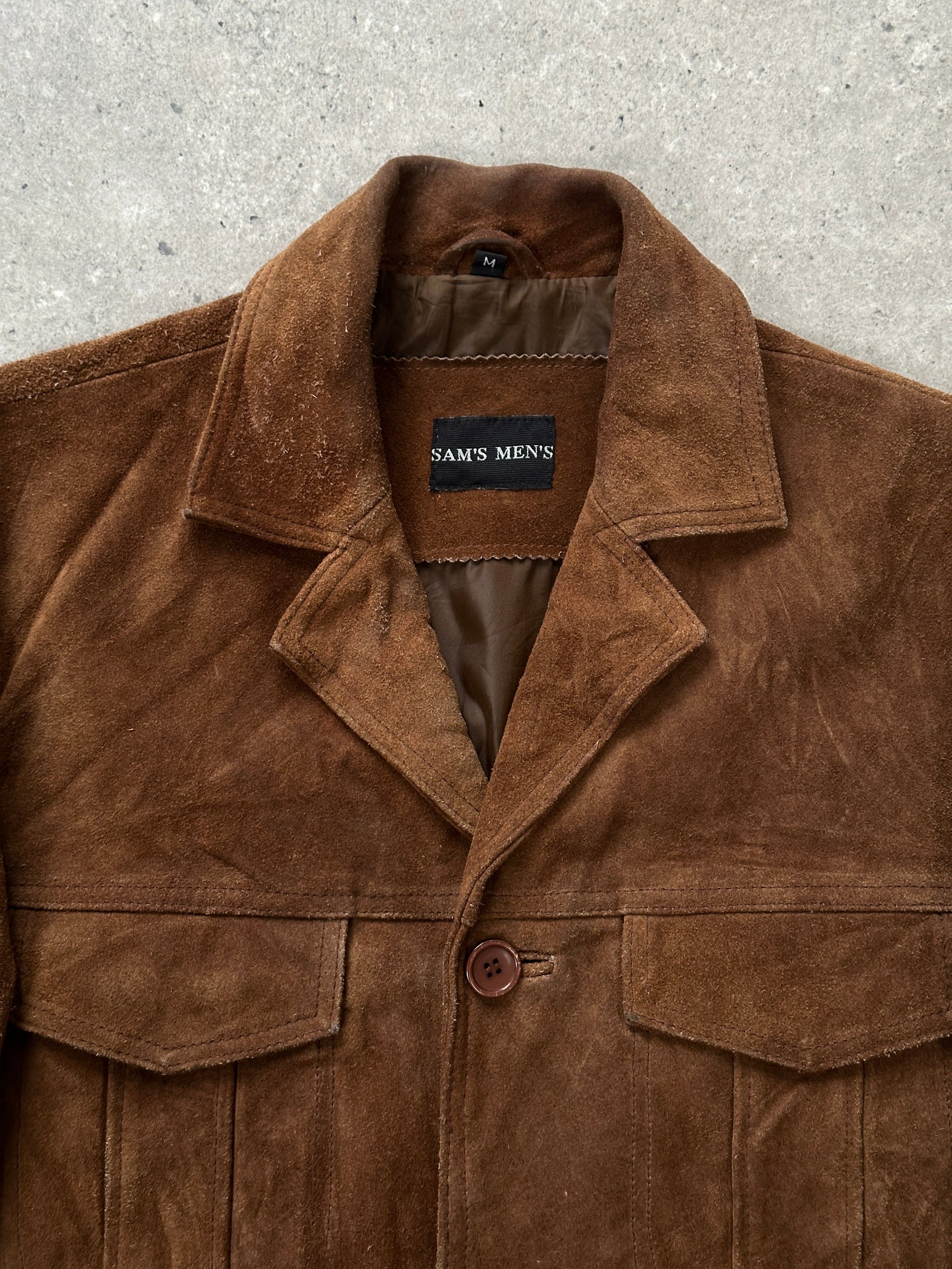 Vintage 1990s brown suede jacket by Sam’s Men’s with a clean structured silhouette. Crafted from soft suede with a subtle worn finish, featuring a classic collar, button front fastening, and vertical seam detailing for a timeless casual look.