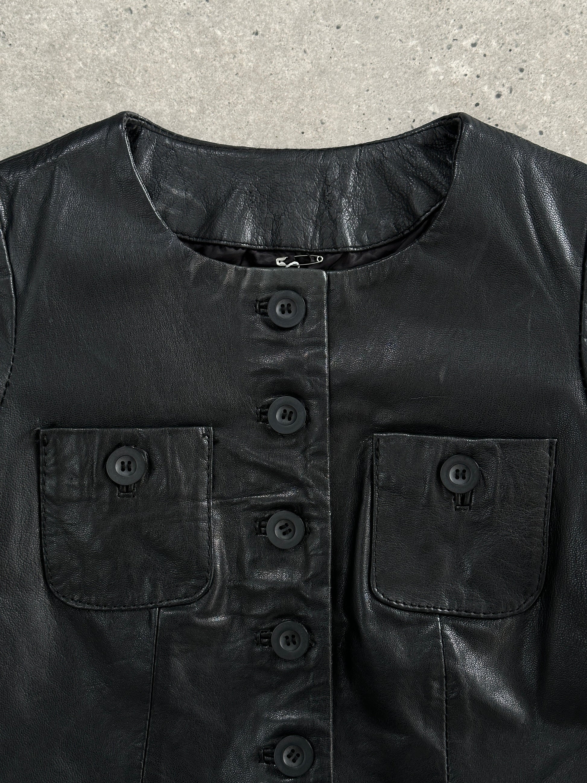 This Vila dress in classic black is crafted from 100% goat leather, offering a sleek and luxurious feel. Browse more of our curated collection of vintage dresses for unique, high-quality styles.